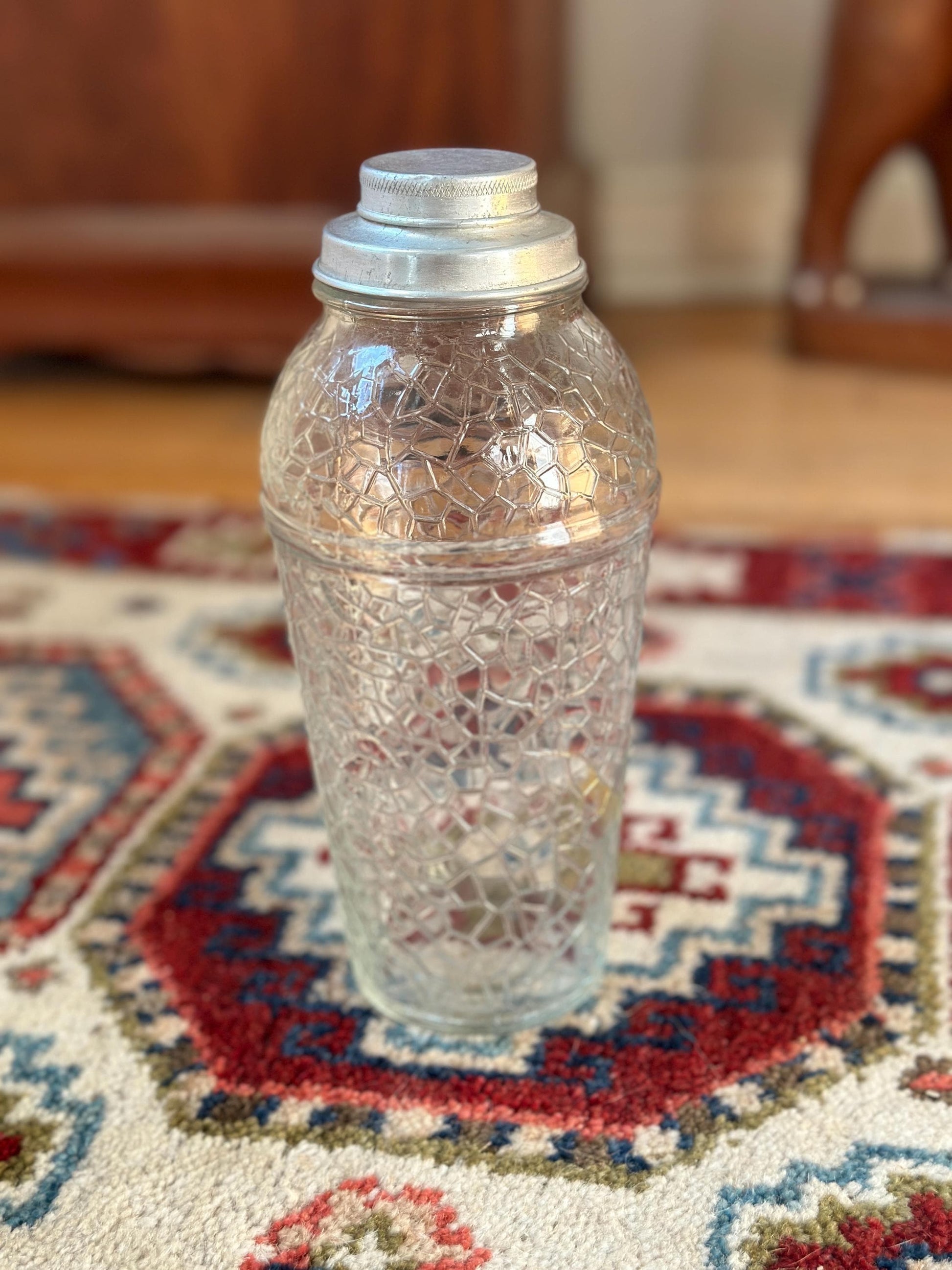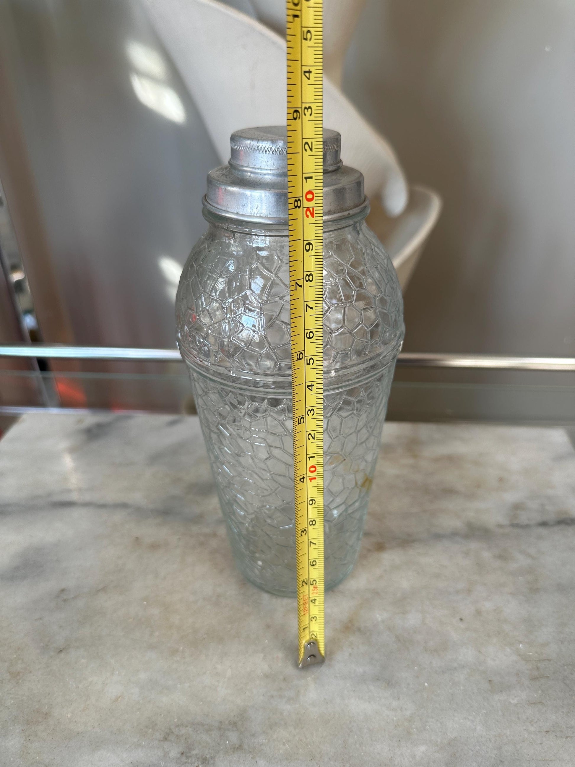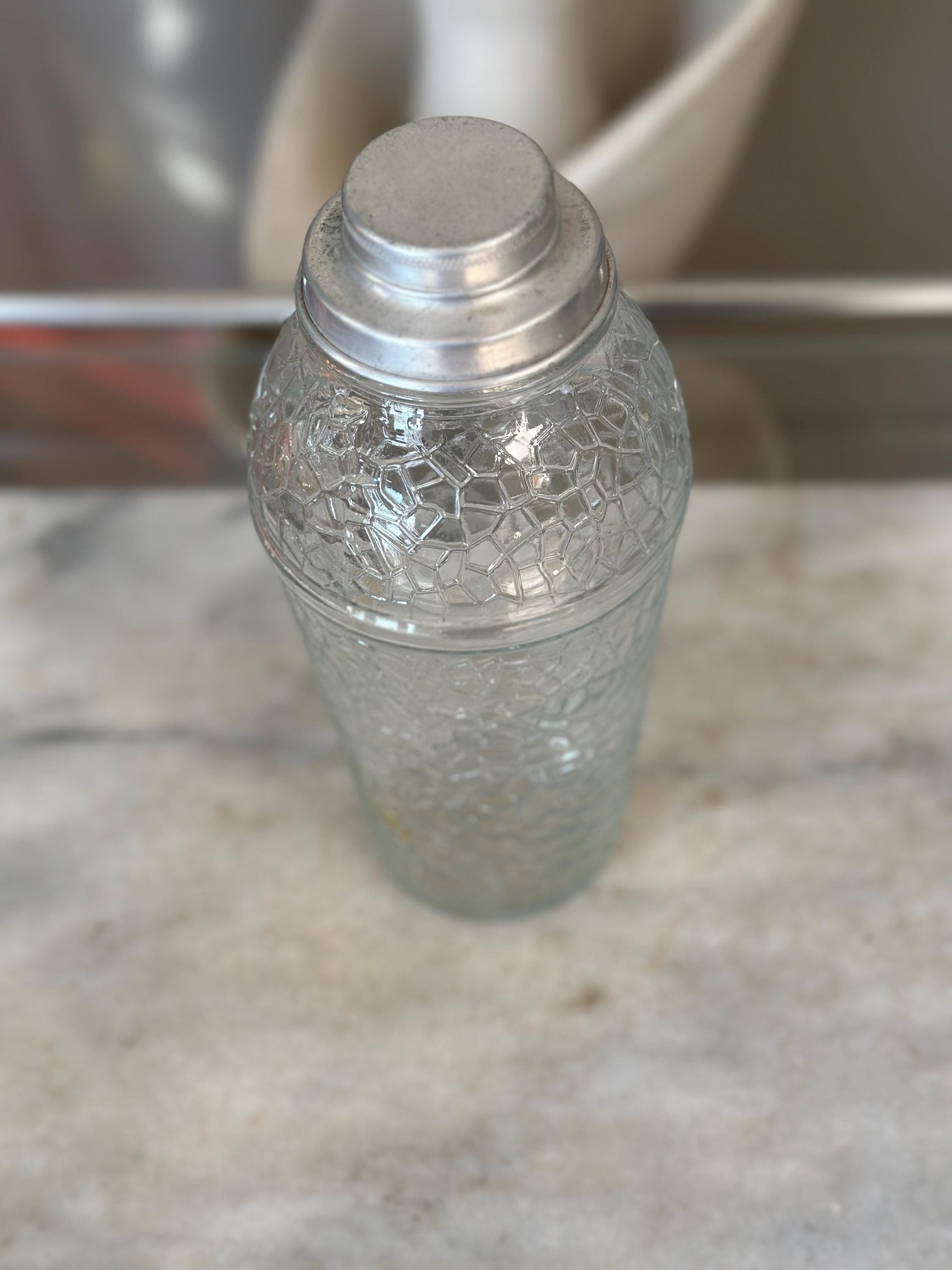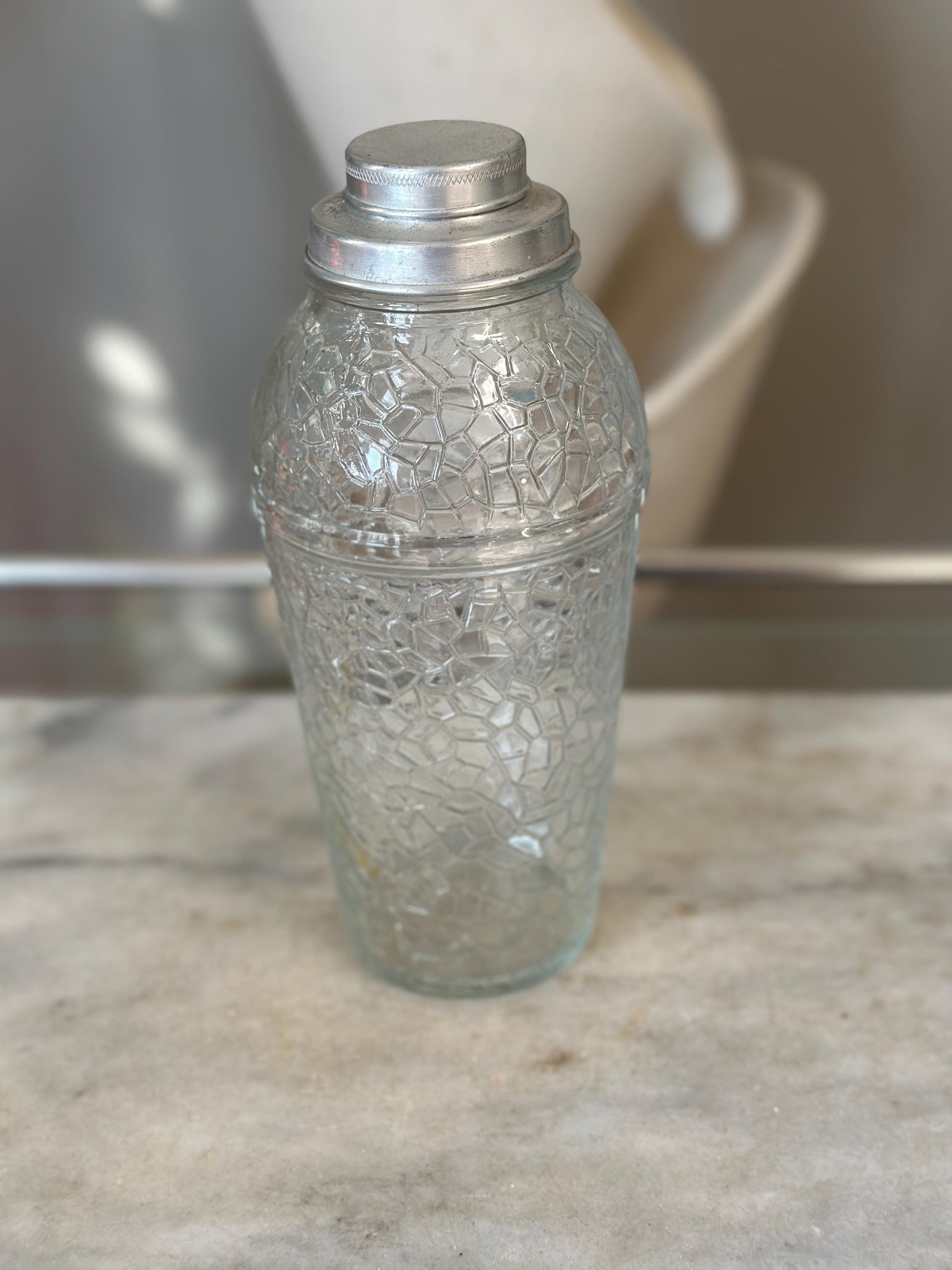 Add timeless charm to your home bar with this vintage crackle glass cocktail shaker, a beautiful piece of mid-century modern (MCM) barware. Standing 8.75” tall, this shaker features a striking crackle glass body paired with a classic 2-part aluminum lid – perfect for mixing up your favorite cocktails in style.Whether you're a collector, a mixology enthusiast, or just love the aesthetic of vintage glassware, this shaker is a functional and decorative piece that brings retro elegance to any space.Features: