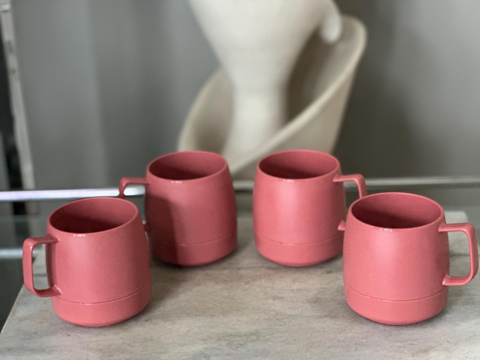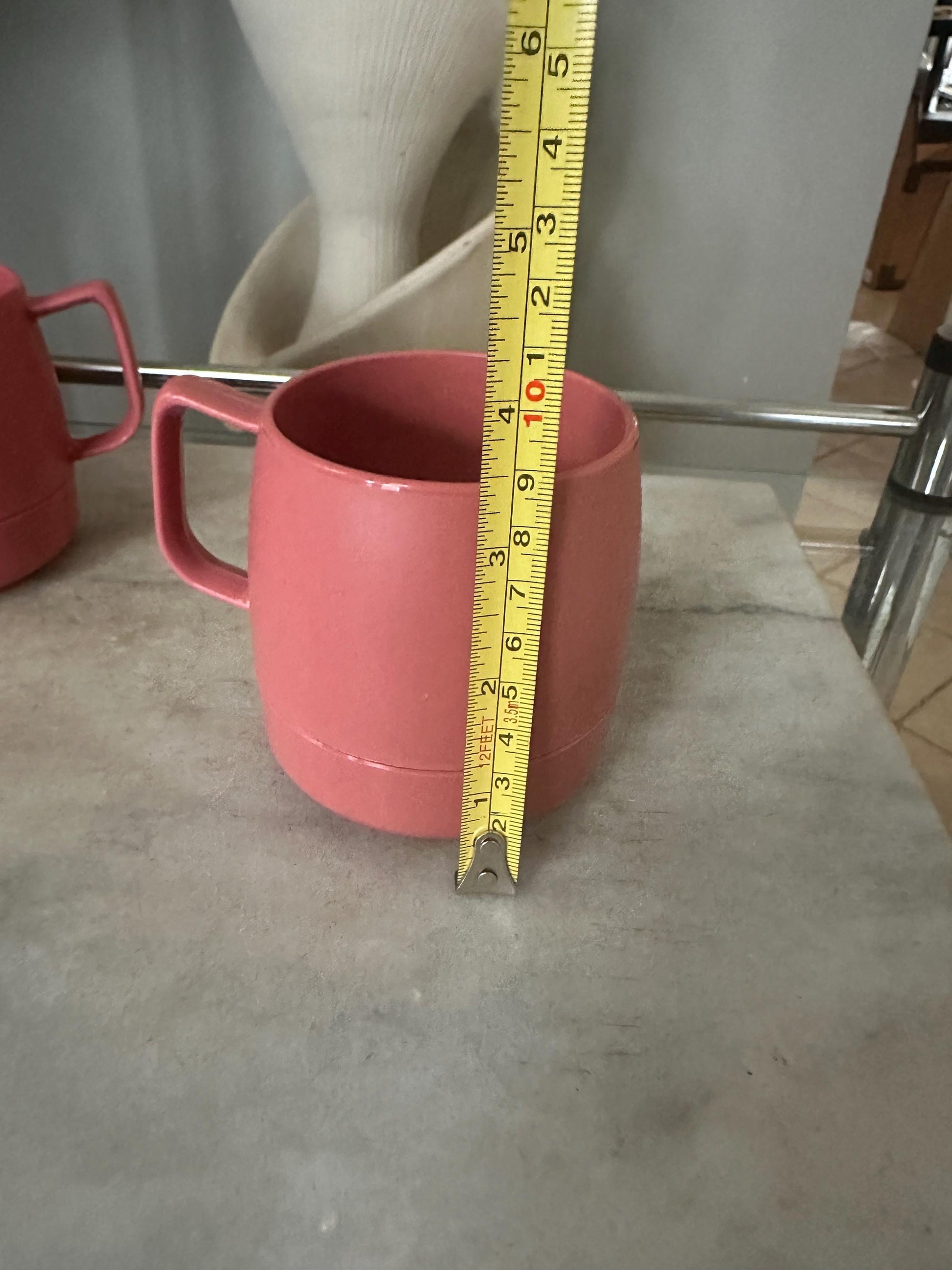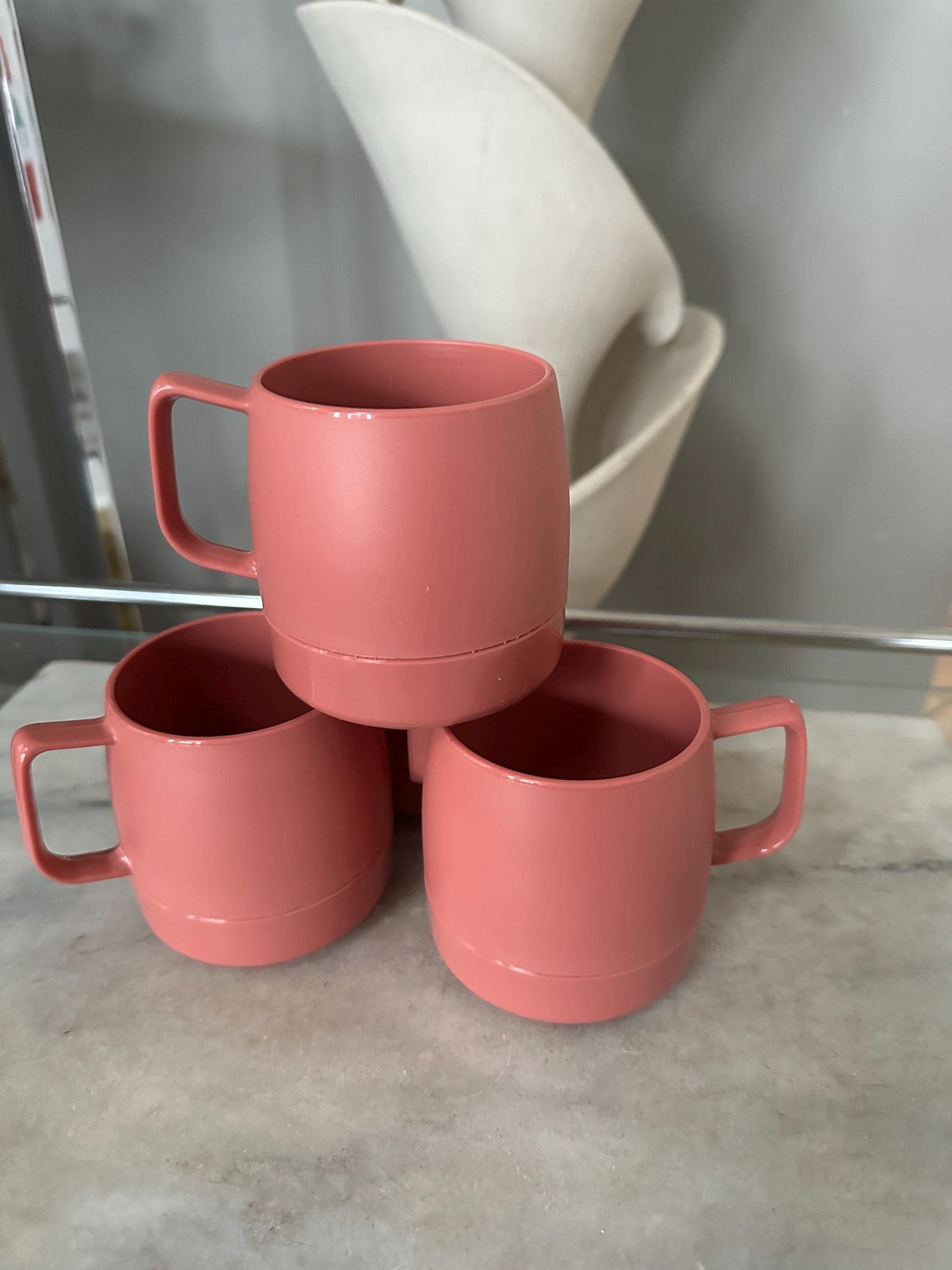 Bring a touch of nostalgic charm to your kitchen with this set of four vintage Dinex stacking cups. Their retro mauve color, clean cylindrical shape, and ergonomic handles make them both functional and stylish. These cups were Made in the USA, known for their durability and classic mid-century-inspired design.Perfect for display, everyday use, campers, or as a retro addition to your coffee bar.Features
