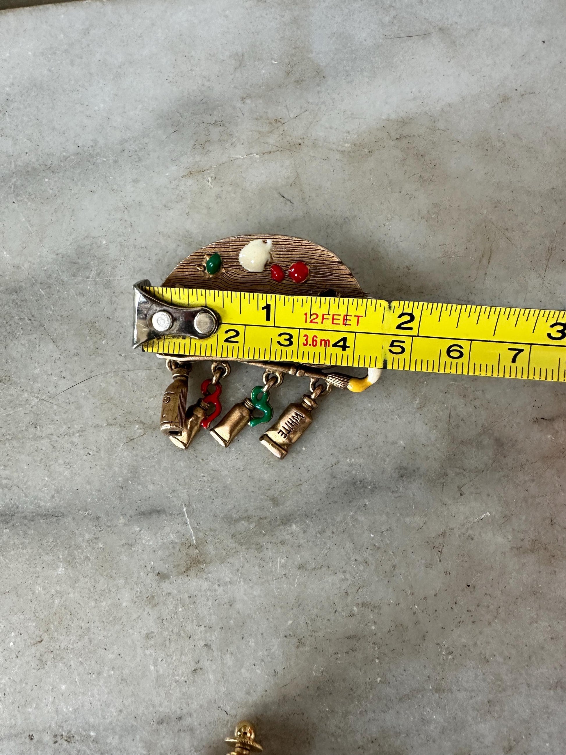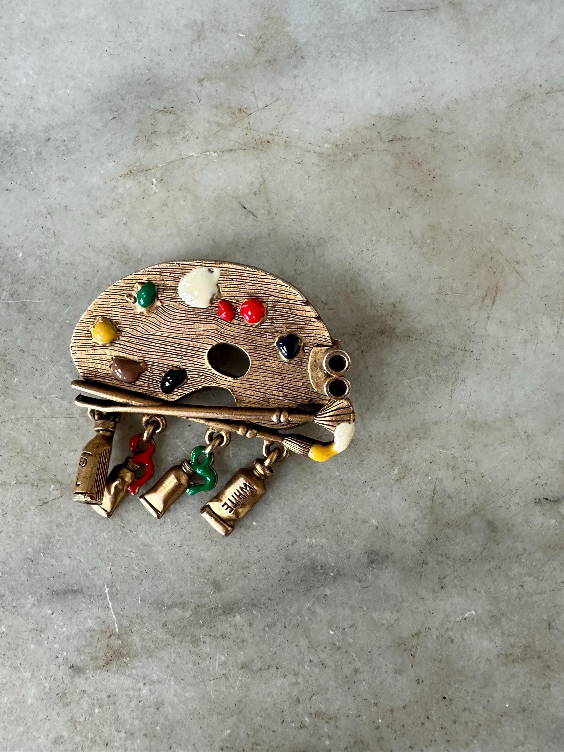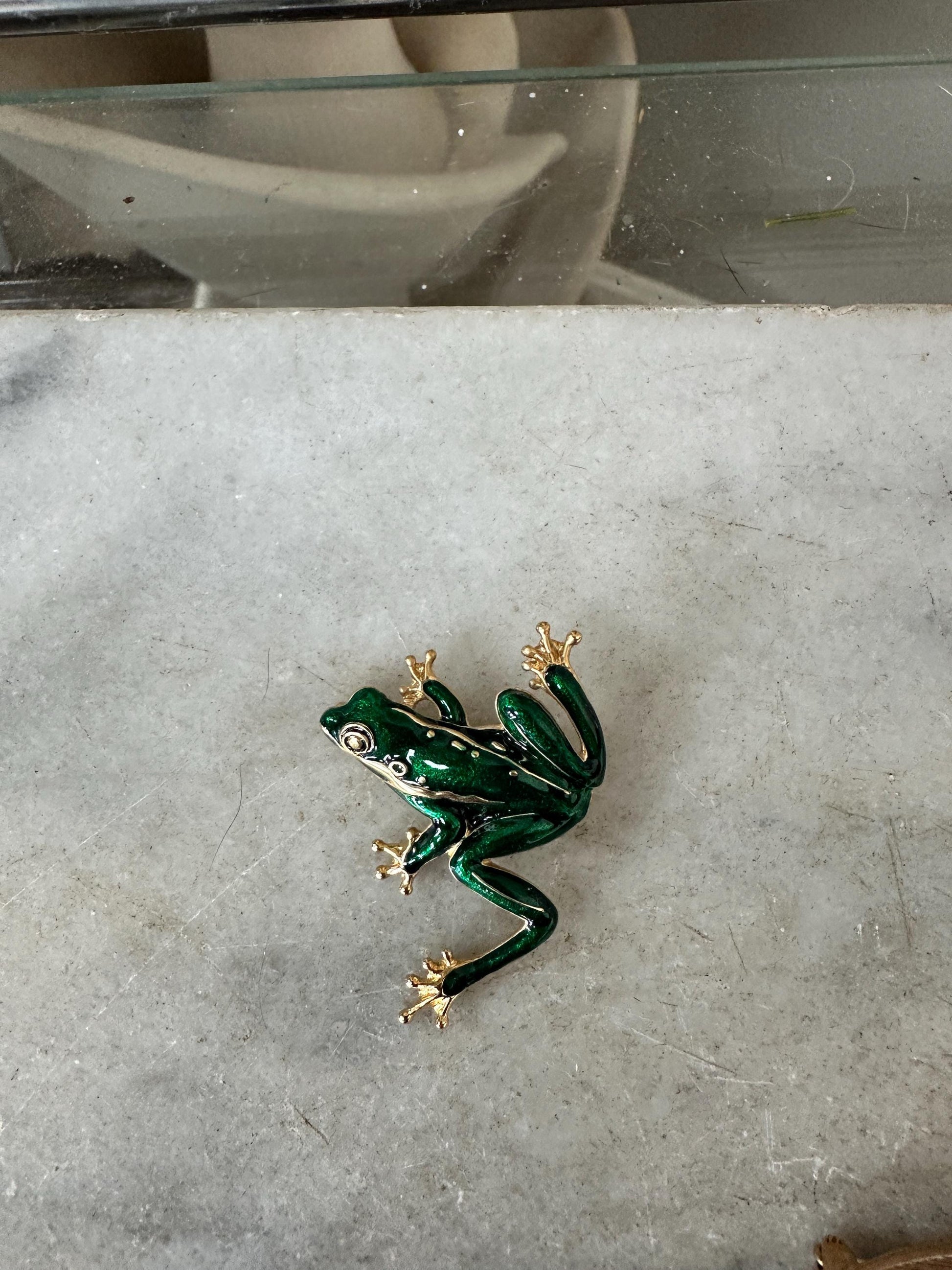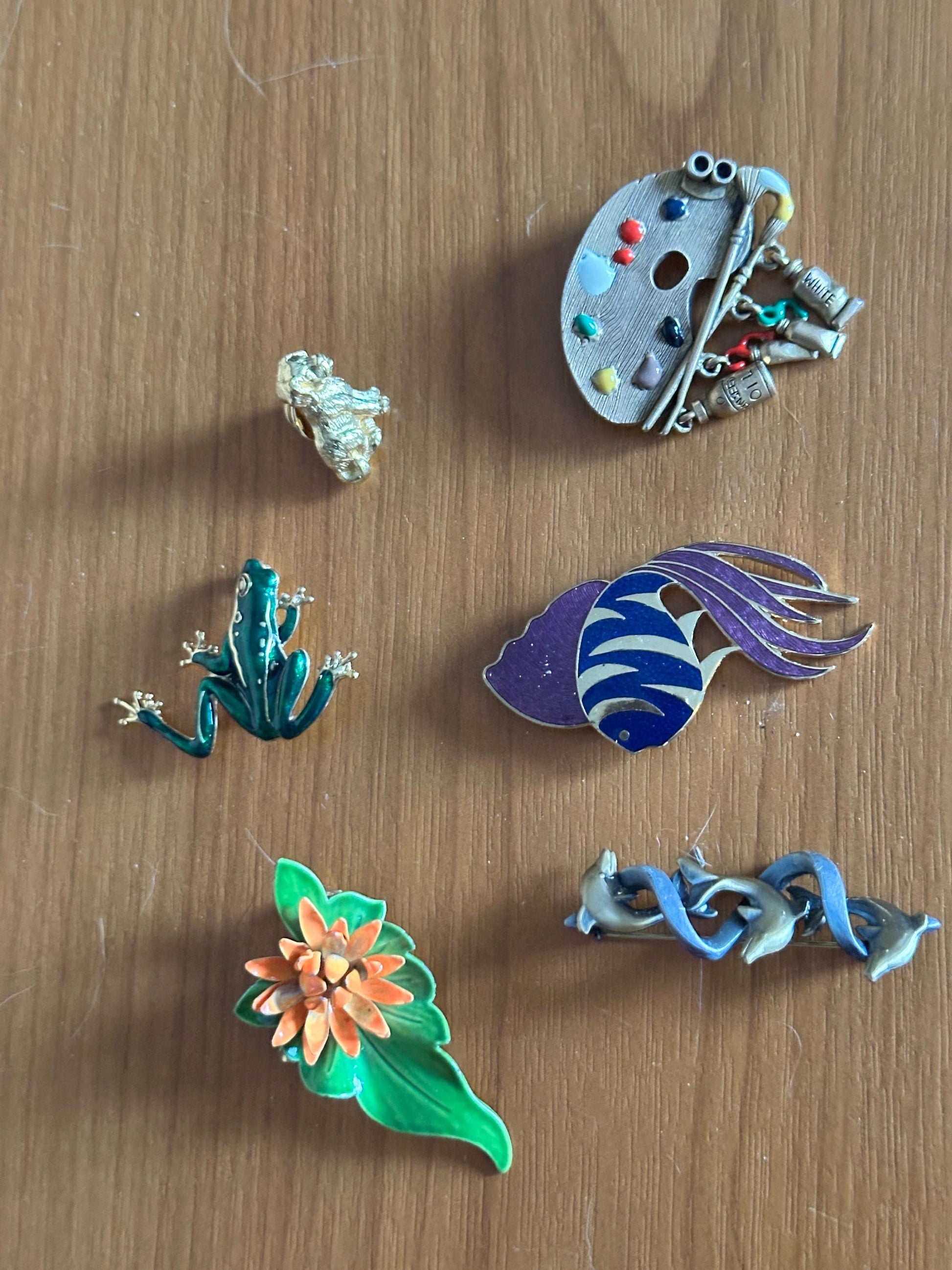 • Green enamel frog with detailed legs • Purple and blue stylized fish • Dolphin trio bar brooch • Gold Toned Metal Paint Pallet and Cute Colorful Tubes of Paint • Bright orange flower with green leaf (lily pad-inspired design)Each brooch has its own personality and vintage charm, making this a wonderful mixed lot for styling on jackets, hats, bags, or display boards.Details: • Era: Likely 1980s–1990s • Materials: Mixed metal, enamel accents • Theme: Animals / Nature / Whimsical • Closure: Standard pin backs (rolling safety clasps where applicable) • Sold as a set of five (plus small dog accent pin)Condition: Good vintage condition with light wear consistent with age. Minor surface wear and slight enamel imperfections may be present. All clasps appear functional. Please review photos closely for detail and condition.Perfect for: • Vintage jewelry collectors • Cottagecore or playful styling • Animal lovers • Gift giving • Resale bundles