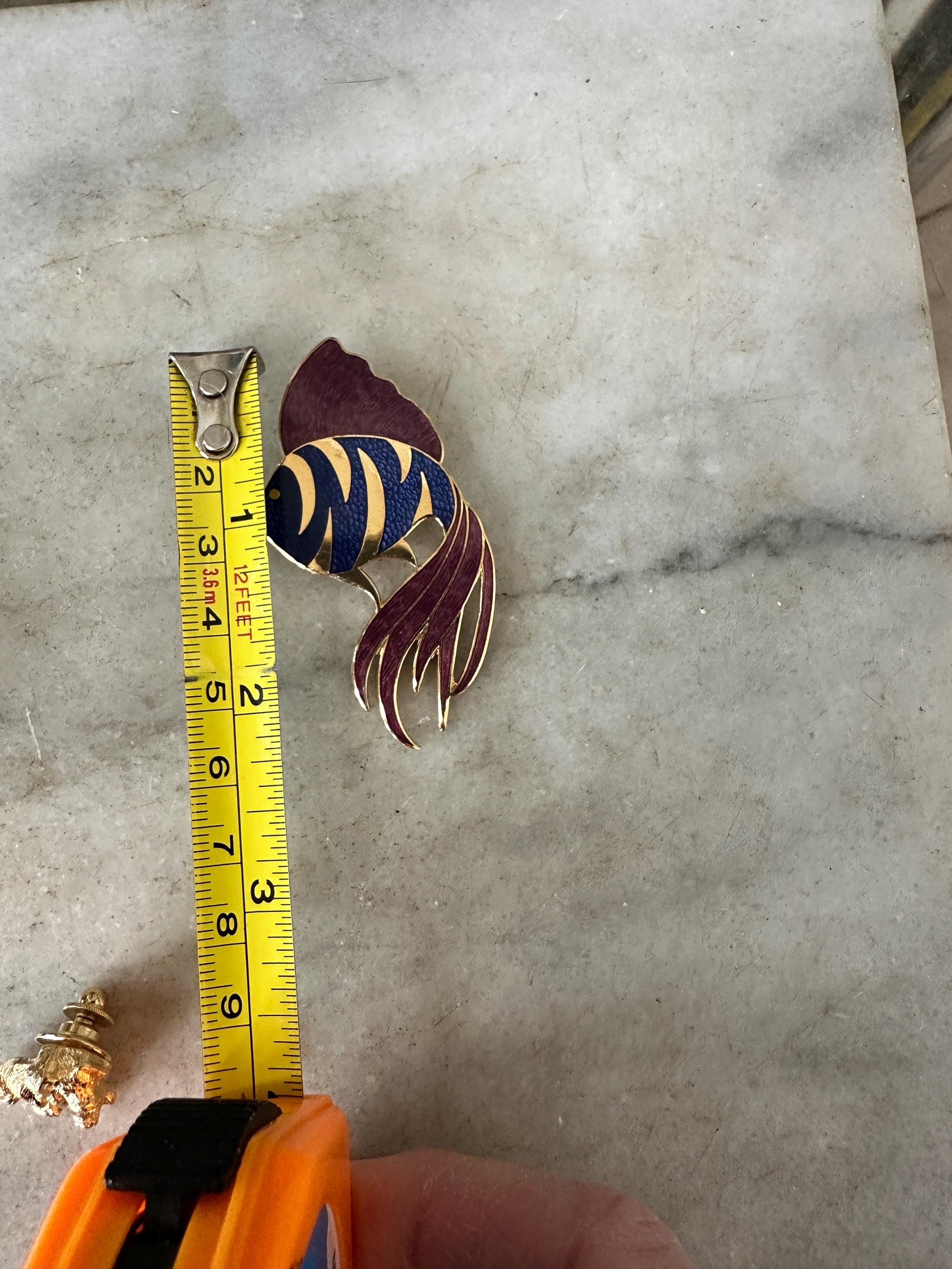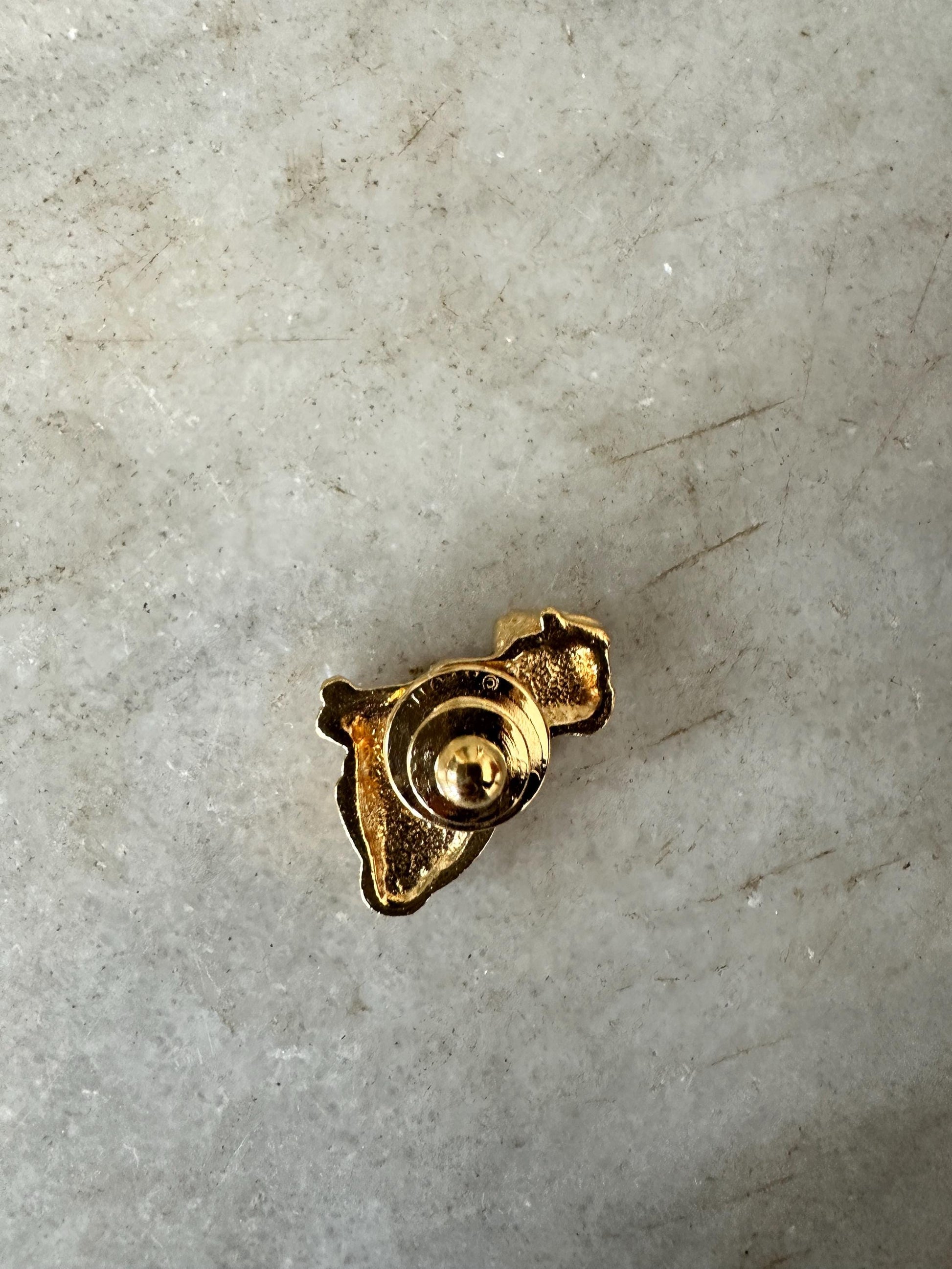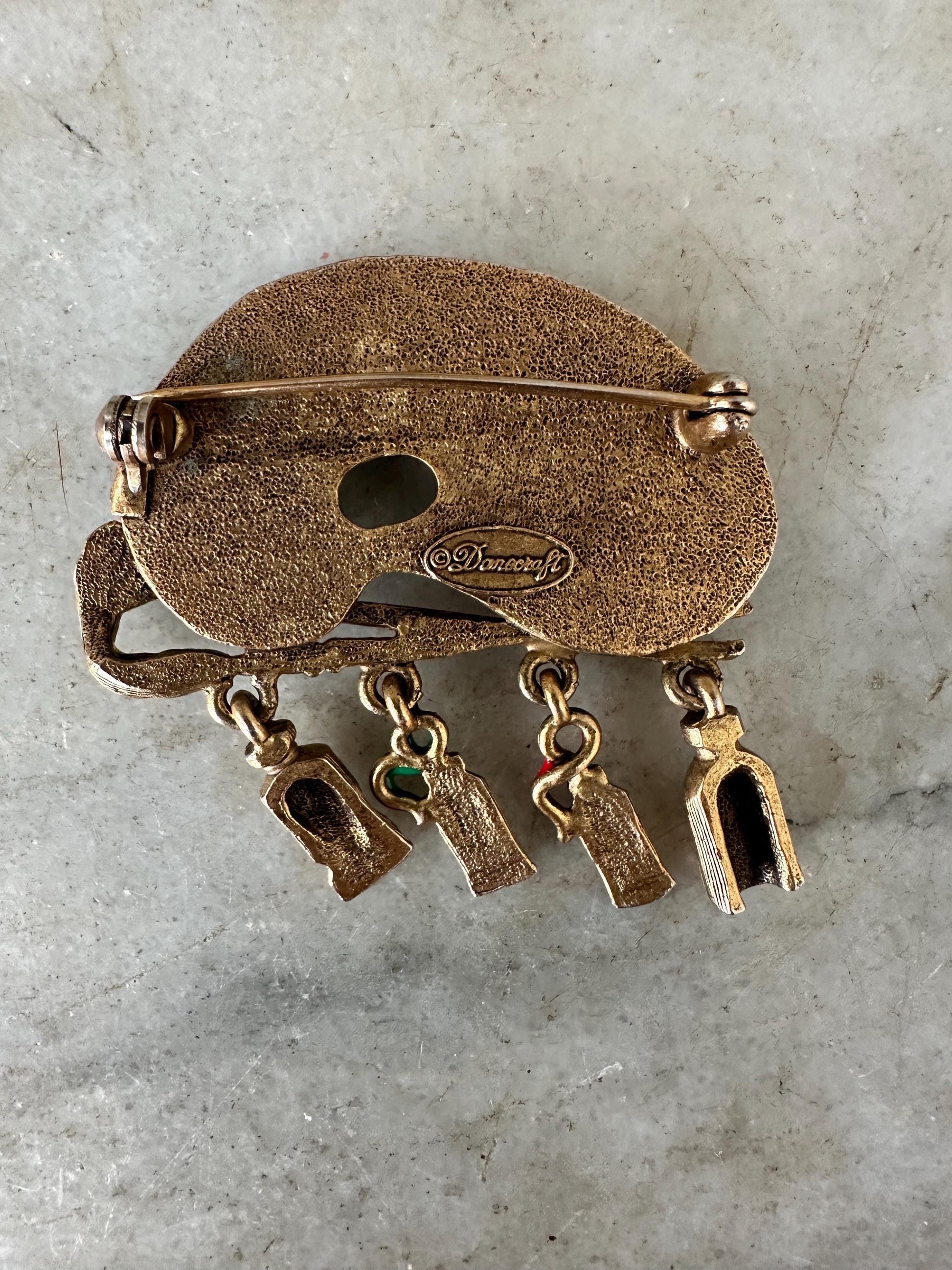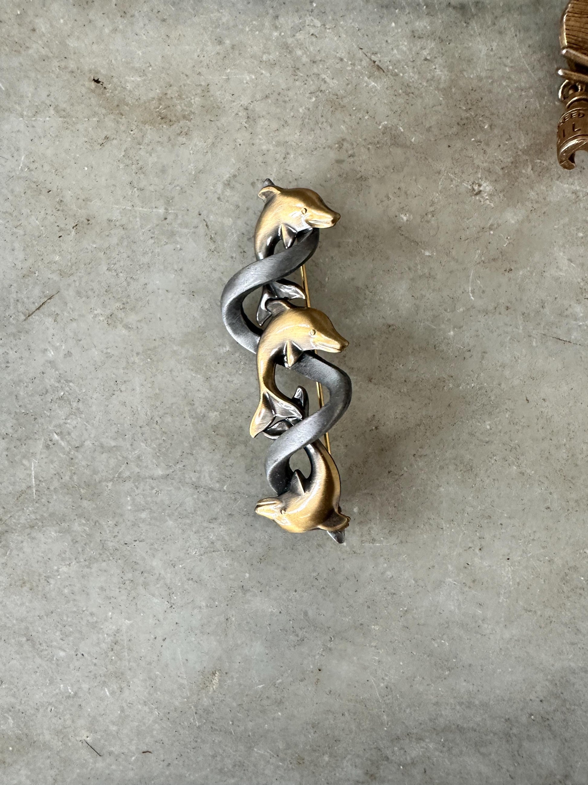 • Green enamel frog with detailed legs • Purple and blue stylized fish • Dolphin trio bar brooch • Gold Toned Metal Paint Pallet and Cute Colorful Tubes of Paint • Bright orange flower with green leaf (lily pad-inspired design)Each brooch has its own personality and vintage charm, making this a wonderful mixed lot for styling on jackets, hats, bags, or display boards.Details: • Era: Likely 1980s–1990s • Materials: Mixed metal, enamel accents • Theme: Animals / Nature / Whimsical • Closure: Standard pin backs (rolling safety clasps where applicable) • Sold as a set of five (plus small dog accent pin)Condition: Good vintage condition with light wear consistent with age. Minor surface wear and slight enamel imperfections may be present. All clasps appear functional. Please review photos closely for detail and condition.Perfect for: • Vintage jewelry collectors • Cottagecore or playful styling • Animal lovers • Gift giving • Resale bundles