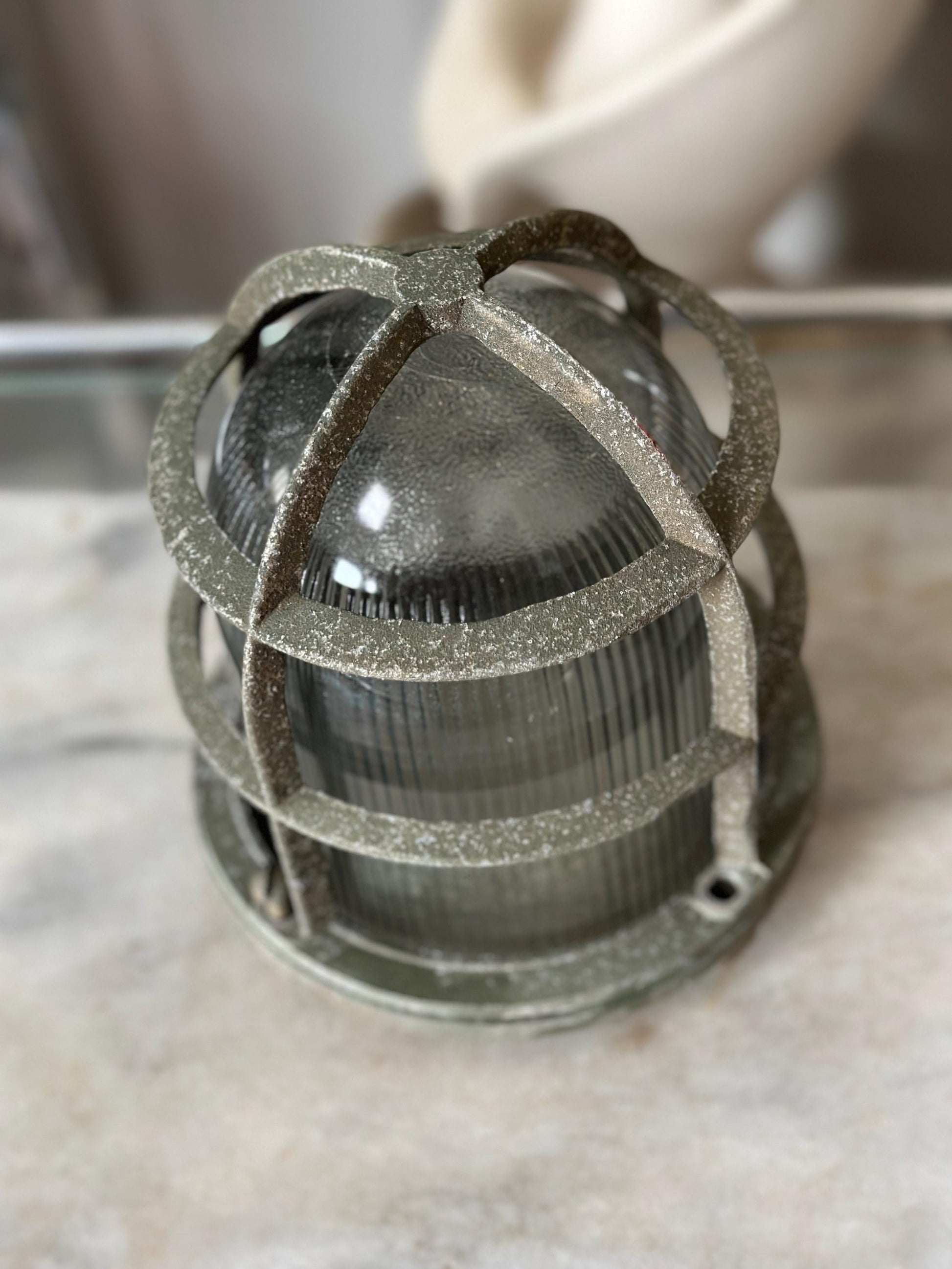 Vintage Explosion Proof Industrial Cage Light Frame w/ Rab Glass Shade. The glass globe has some paint on it and needs to be washed well. Selling as found. Still displays well.Great piece to be restored and added to a working light fixture.Cage measures approximately 7.25” x 6.5” with a 5” Opening.In good vintage condition. No chips or cracks.Glass shade measures 6.75” x 5.25 with a 4 1/8” opening at the bottom.A wonderful addition to your primitive or industrial decor.