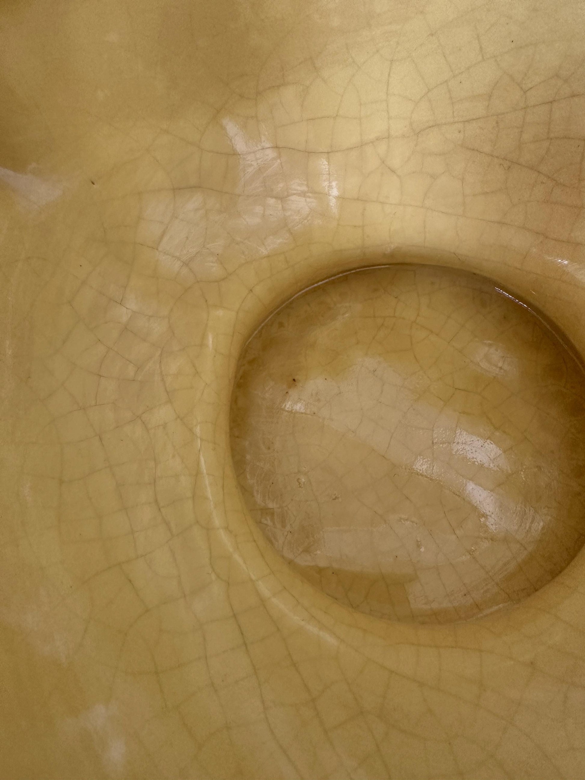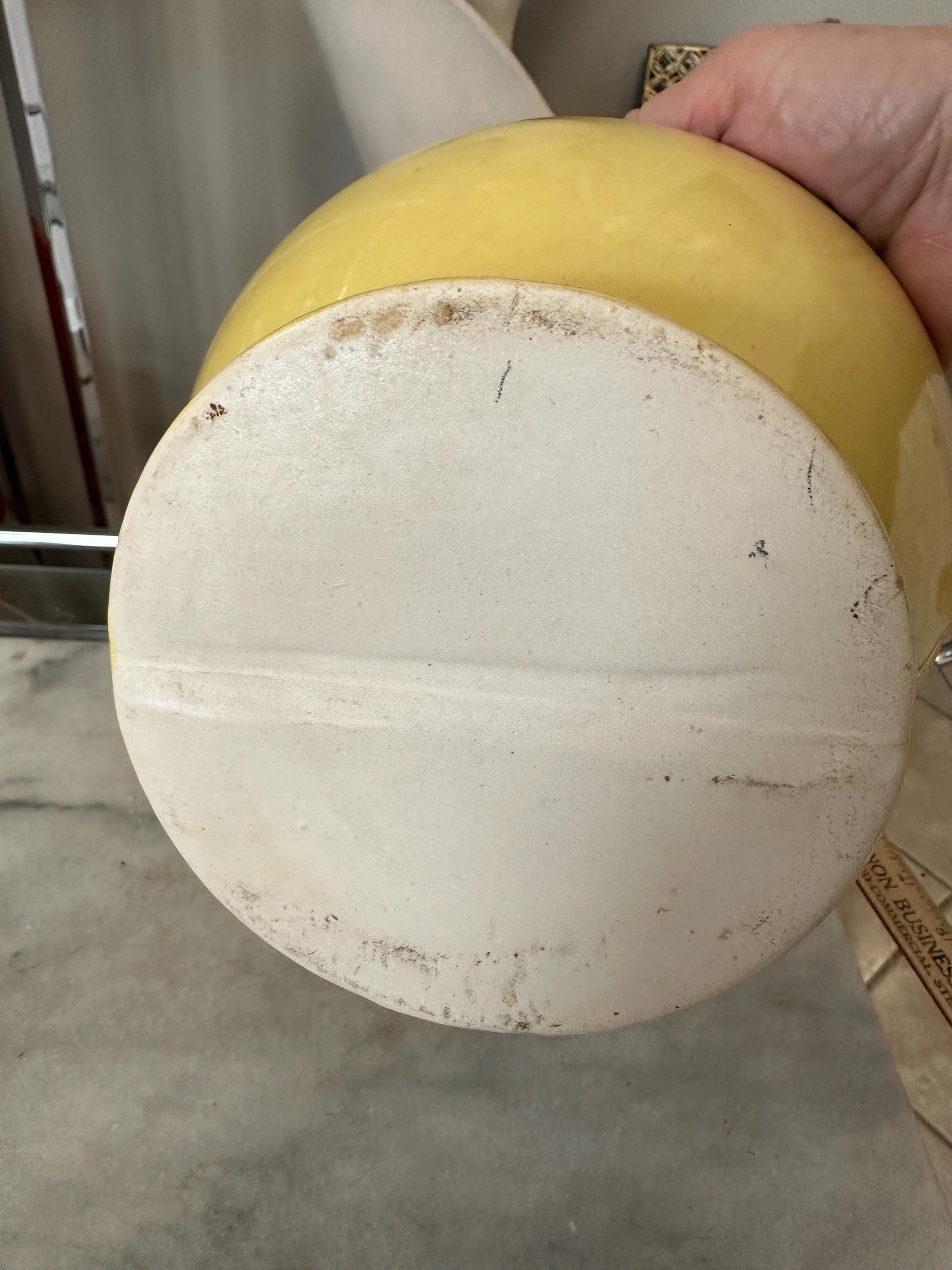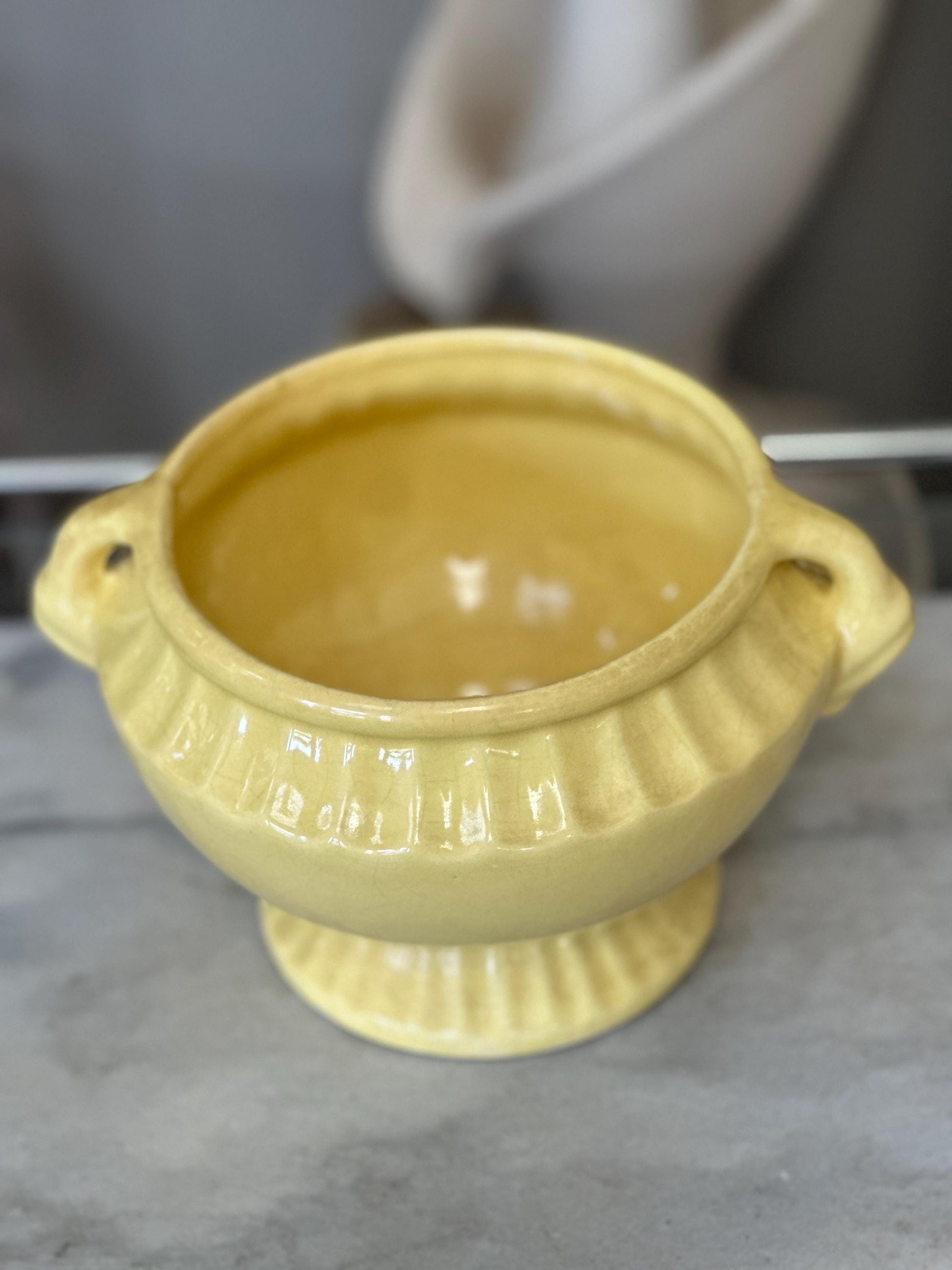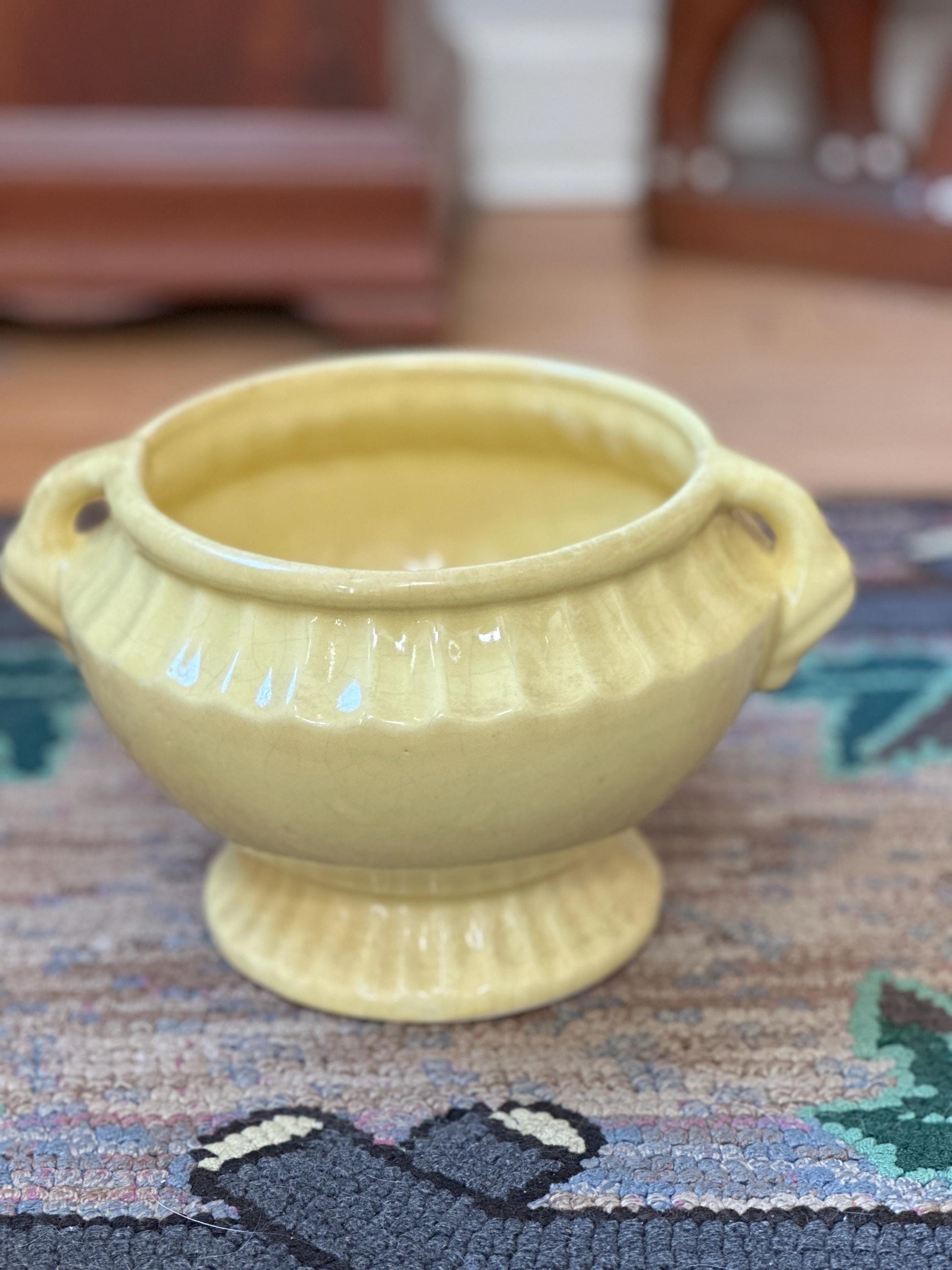Vintage Glossy Yellow Urn-like Planter by Fredericksburg Pottery of Ohio. Scalloped detail and swan-like handles. Signed #201 USA. Very nice piece.In good vintage condition with some natural speckling. No chips or cracks but some age related crazing on the inside of the piece.Please see all photos.Approx. measurements: 8"x9"x5"A wonderful addition to a USA pottery collection. perfect for your cottage chic or boho chic decor.
