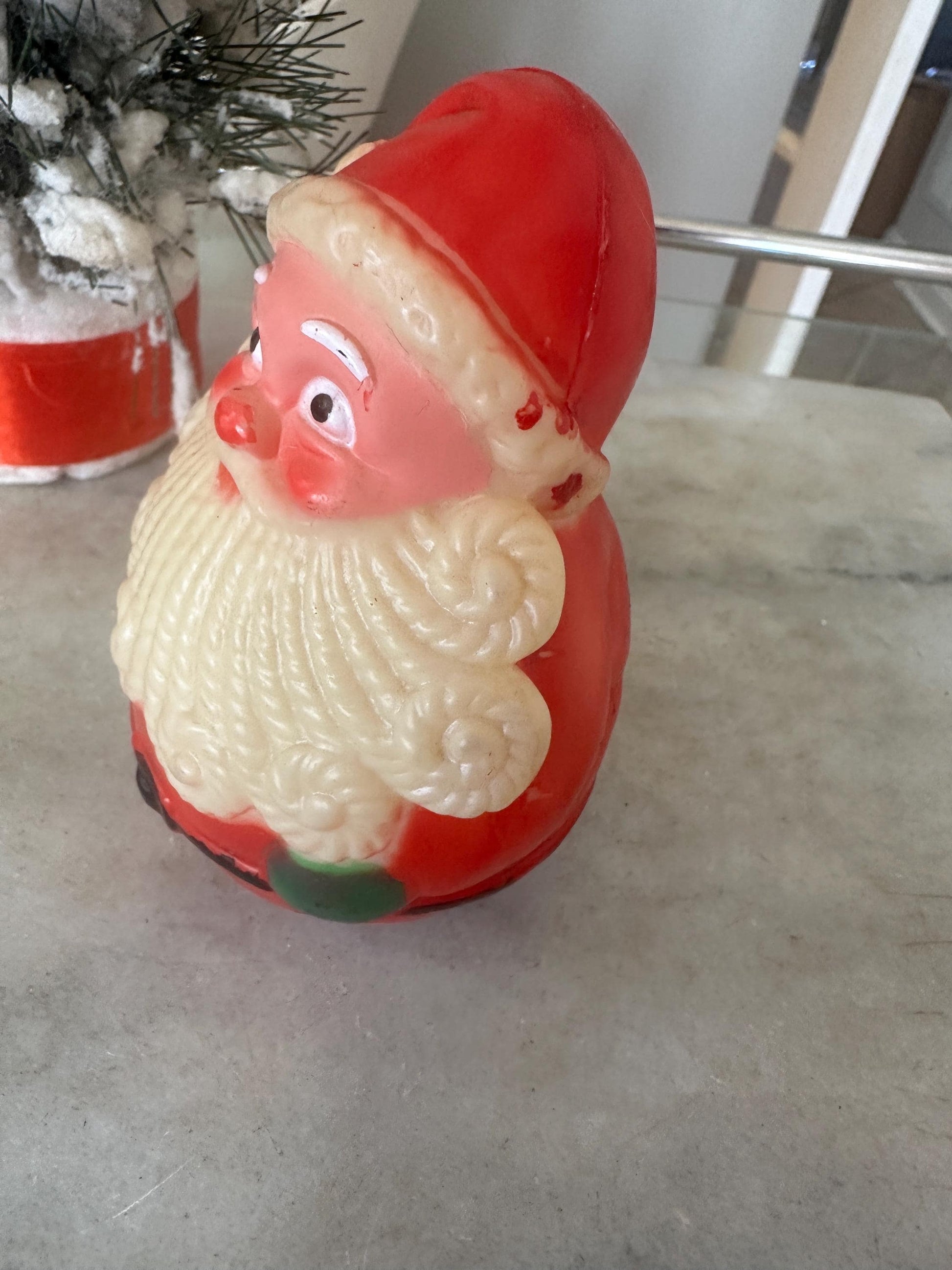 Add a dose of retro holiday cheer to your collection with this vintage Fun World Inc Roly Poly Santa Claus toyMade of colorful molded plastic and produced in Hong Kong, this classic wobble (roly poly) Santa features a bell inside that gently jingles when rocked—just like beloved mid-century and vintage holiday toys.With Santa’s rosy cheeks, textured white beard, and cheerful expression, this piece is perfect for vintage Christmas décor, toy collectors, or nostalgic holiday displays.Details