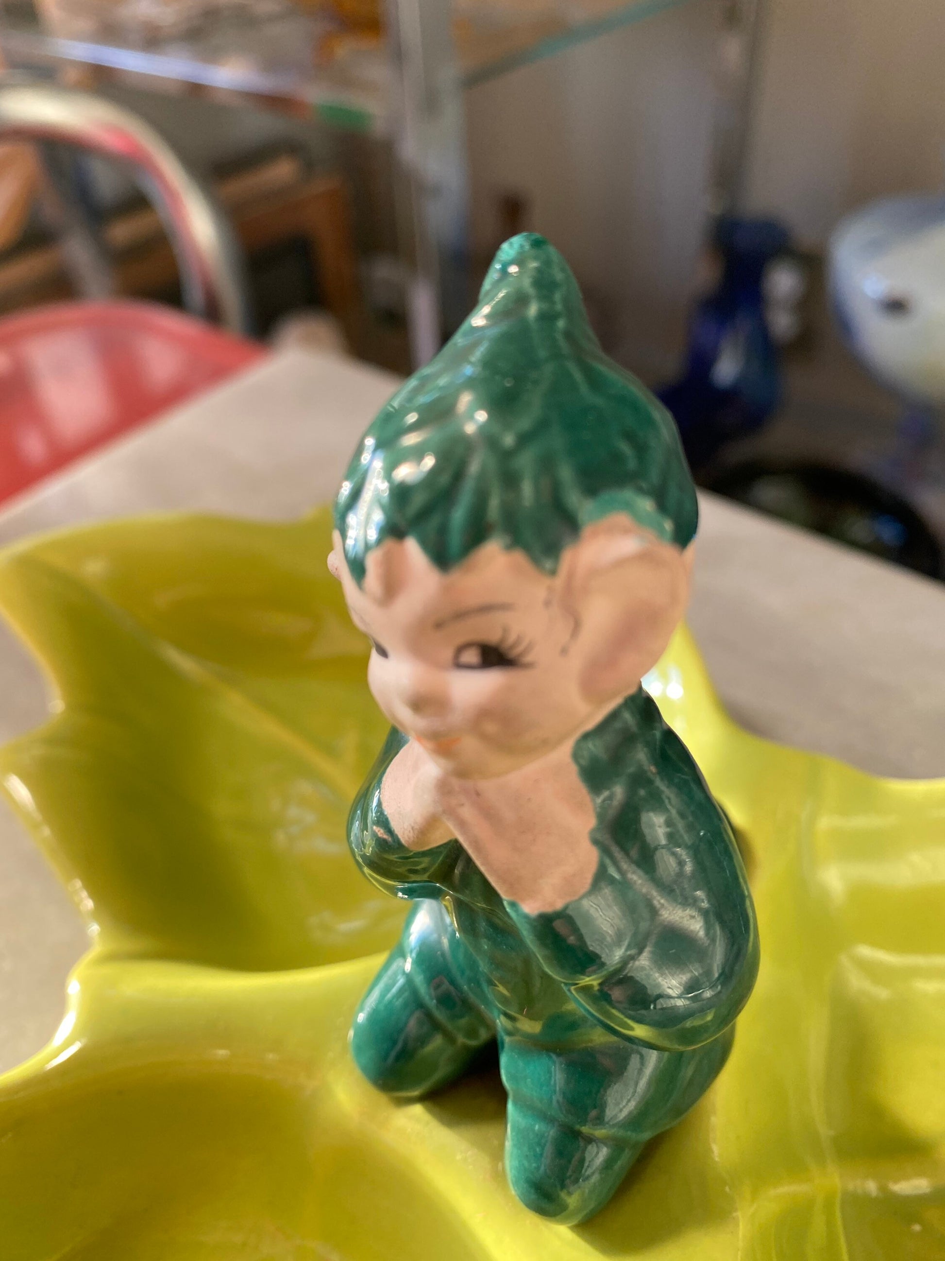 Vintage Gilner Pixie Elf Pottery Leaf Candy Dish - 1940s Kitsch Tray