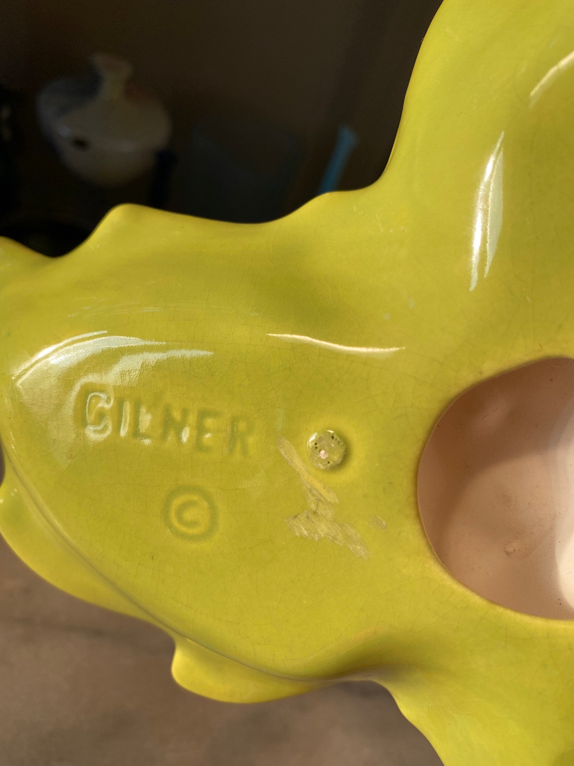 An adorably kitschy hand-painted Gilner pixie elf pottery dish/tray/platter from th 1940s.The piece measures roughly 4-5/8” tall by 9-1/2” wide by 9” deep overall and is ready to use or display!In good vintage condition with no major chips or cracks. There is a rough are or nick at the top of his hat that can be felt bit not really visible to the eye. There is also a small chip on the top of one leave. Please see last two photos for details.A wonderful addition to an elf commectikn. This would be great as part of your Christmas display.