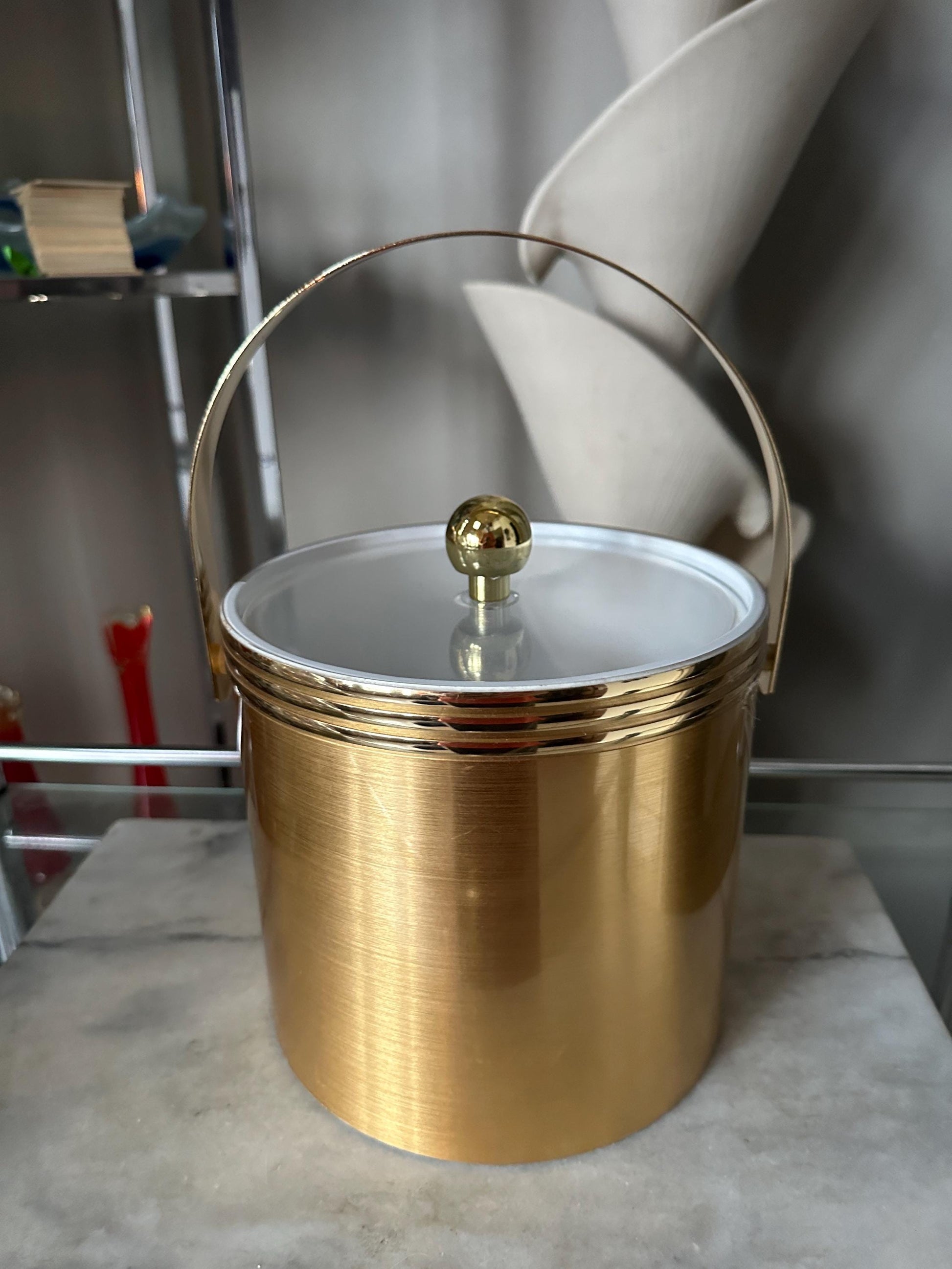 Stylish metallic gold finish Sturdy clear lucite lid with gild knob Includes original metal ice tongsPerfect for entertaining, bar carts, retro-themed parties, or as a collector’s display pieceDimensions (approx.):Height: [Insert measurement] Diameter: [Insert measurement]Good vintage condition with light signs of age and use. Minor scuffs consistent with vintage wear. Lid and tongs are intact and functional. Please see photos for full details.Ideal for vintage lovers, MCM collectors, or anyone who appreciates retro barware. Makes a unique housewarming or holiday gift!