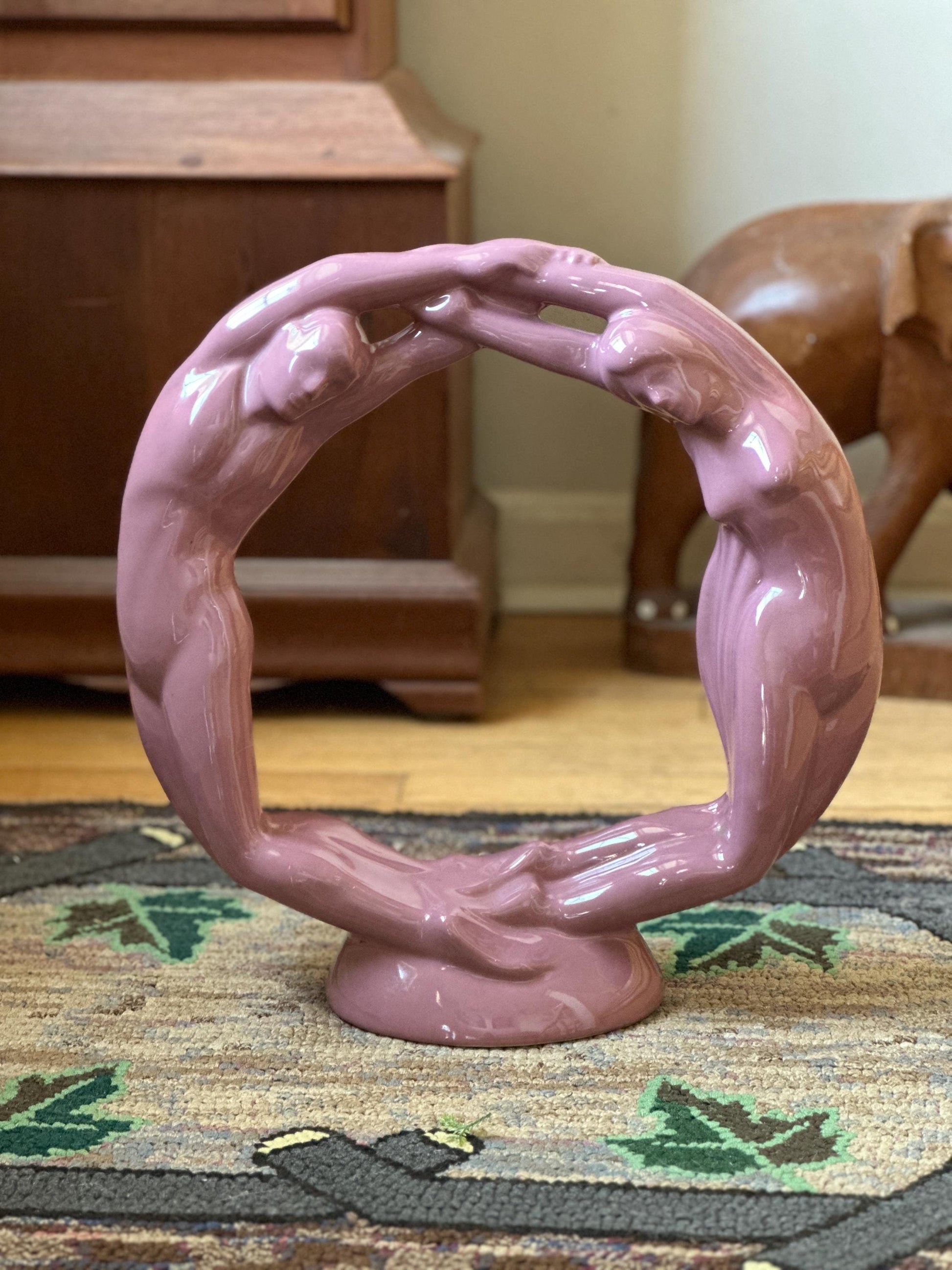 Haeger Pottery Mauve Pink Circle Of Love Sculpture, Vintage 90s Art Deco Style Man and Woman Eternity Circle Ceramic Art DecorHaeger Pottery Mauve Pink Circle Of Love Sculpture. Large Art Deco style ceramic Man and Woman Eternity circle made by Haeger Potteries. Glossy finish. Joined hands of the couple create a graceful circle on a round base. Original Haeger sticker on the bottom Made in USA dated 1992. Substantial weighs almost 6 lbs.In very good vintage condition with no chips or cracks. Measurements: 15" high / 14.5" wide / 3.5" deepA lovely piece of Vintage Ceramic Art decor. Perfect Retro Anniversary or Wedding gift.