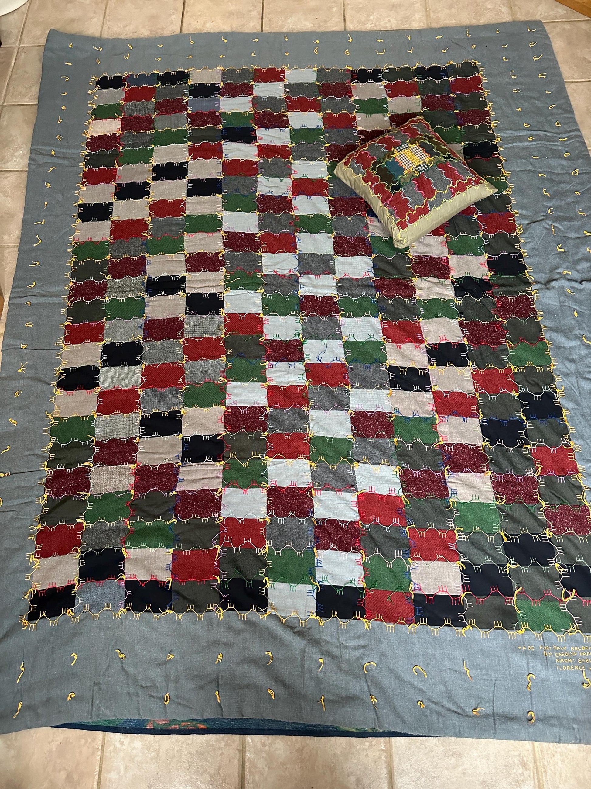 Artist-Signed: Dated 1969, signed by folk artistTechnique: Handcrafted with embroidered goose stick stitchingColors: Blue with multicolored patchwork squares (many wool); golden fabric backingMaterial: Lightweight cottons, wools and lily blends blend (likely vintage-era textiles)Size: 74ā x 88ā (twin/full size)Includes: Matching pillow šæ Condition:Good vintage condition with minor expected wear consistent with age. No rips or stains. We did not put in washing machine because of the many wool patches. Recommend having this dry cleaned.Perfect For: Folk art and vintage textile collectors Cottagecore, Americana, or farmhouse decor Thoughtful, meaningful gift for vintage loversBring home a heartfelt slice of American folk history with this timeless quilt and matching pillow. Each stitch tells a story ā ready to become part of yours.