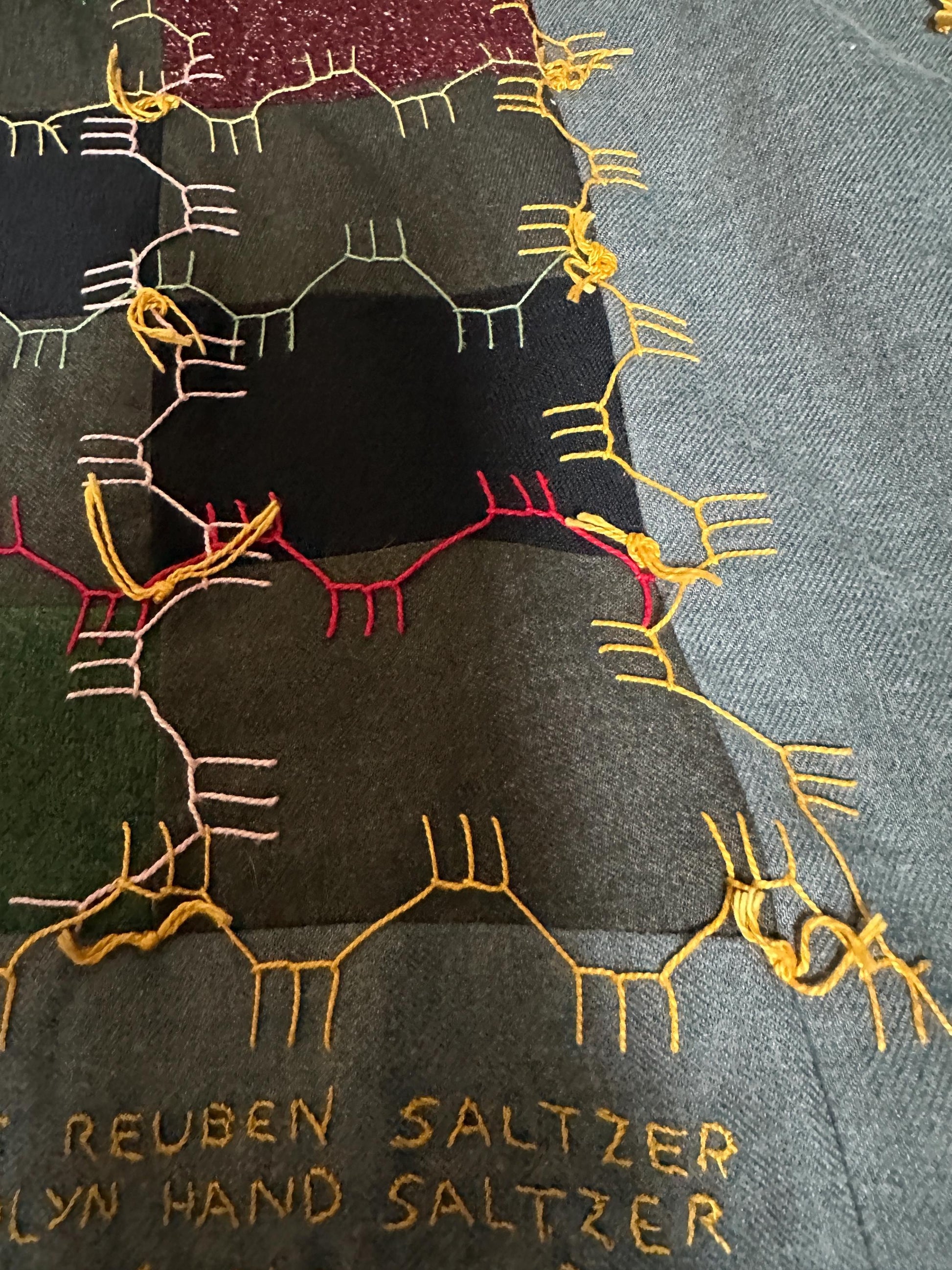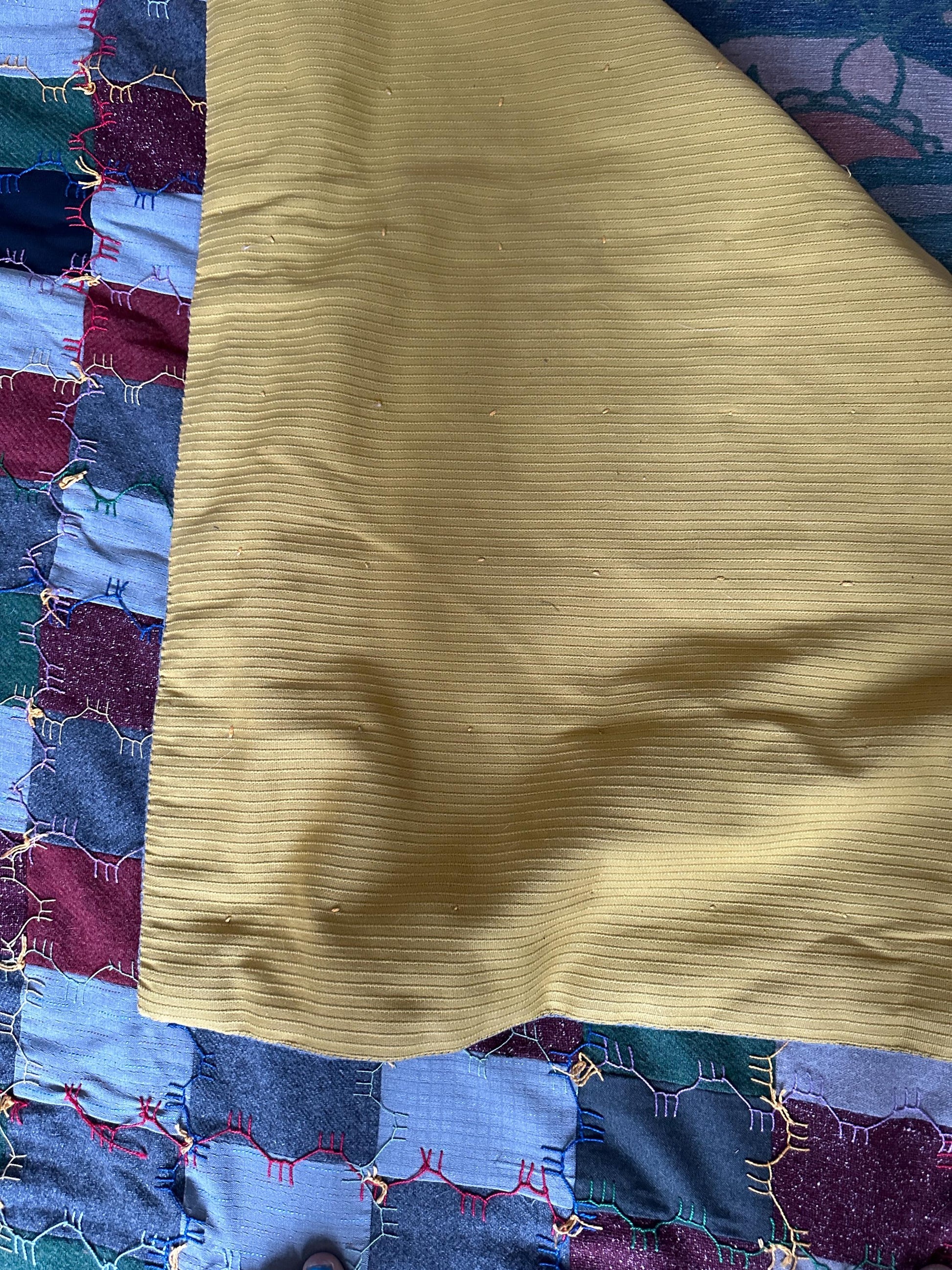 Discover a true piece of Americana with this authentic 1969 vintage patchwork quilt, lovingly handcrafted and signed by a folk artist. This one-of-a-kind textile treasure features a stunning goose stick embroidered stitching, adding unique charm and intricate detail throughout.Set on a soft blue background, the quilt showcases a vibrant mix of multicolored fabric patches, many are wool - we think these are uocycled old suits. Eac patch was thoughtfully arranged for a beautiful, timeless effect. The golden fabric backing adds a warm, luxurious contrast, making it just as striking from the reverse side.This is a lightweight quilt, perfect for the warmer months or as a throw.Perfect for collectors of folk art, lovers of vintage textiles, or anyone seeking a cozy, eye-catching heirloom piece. Also includes a matching pillow, making this set both beautiful and practical.Features: