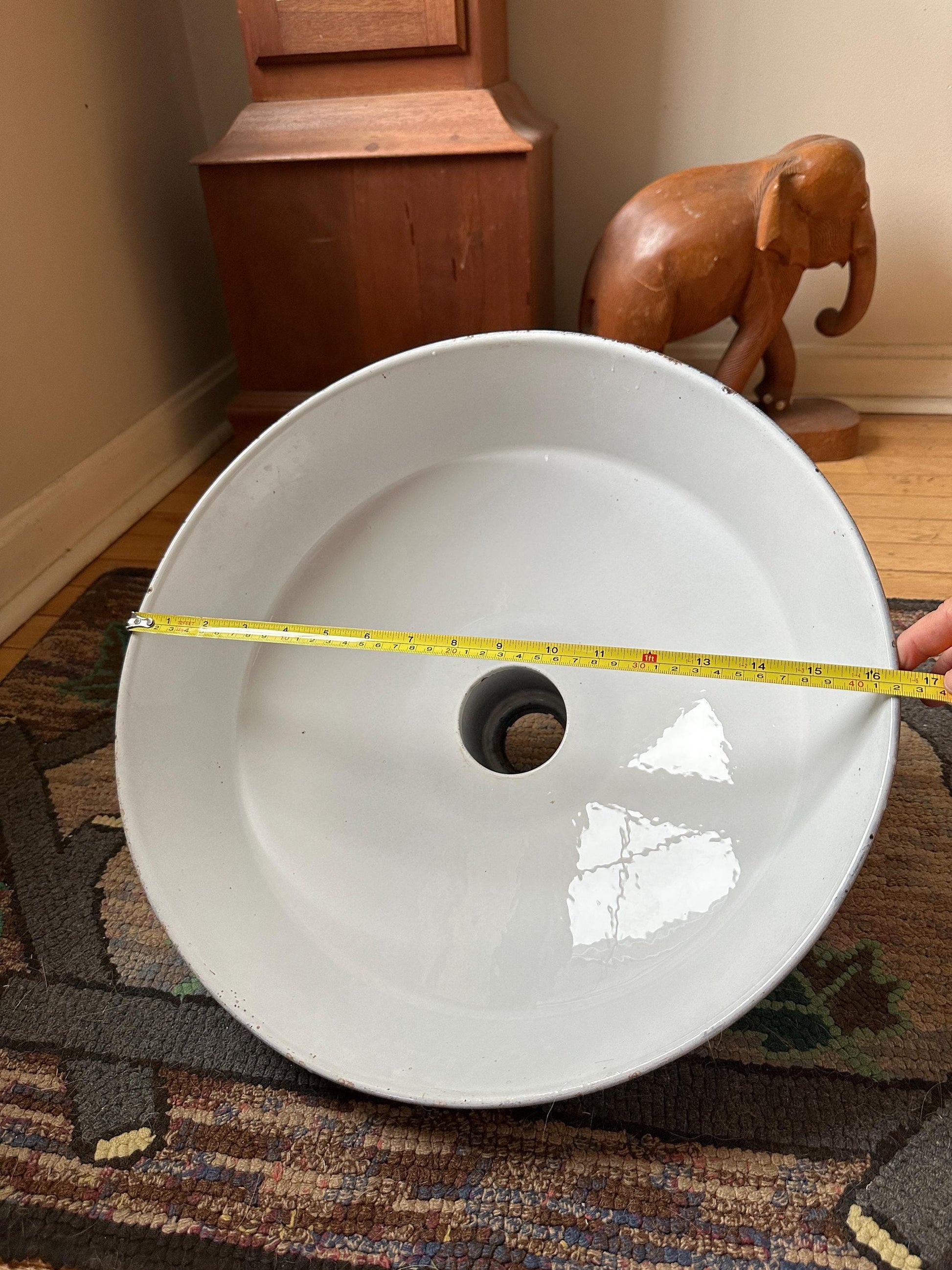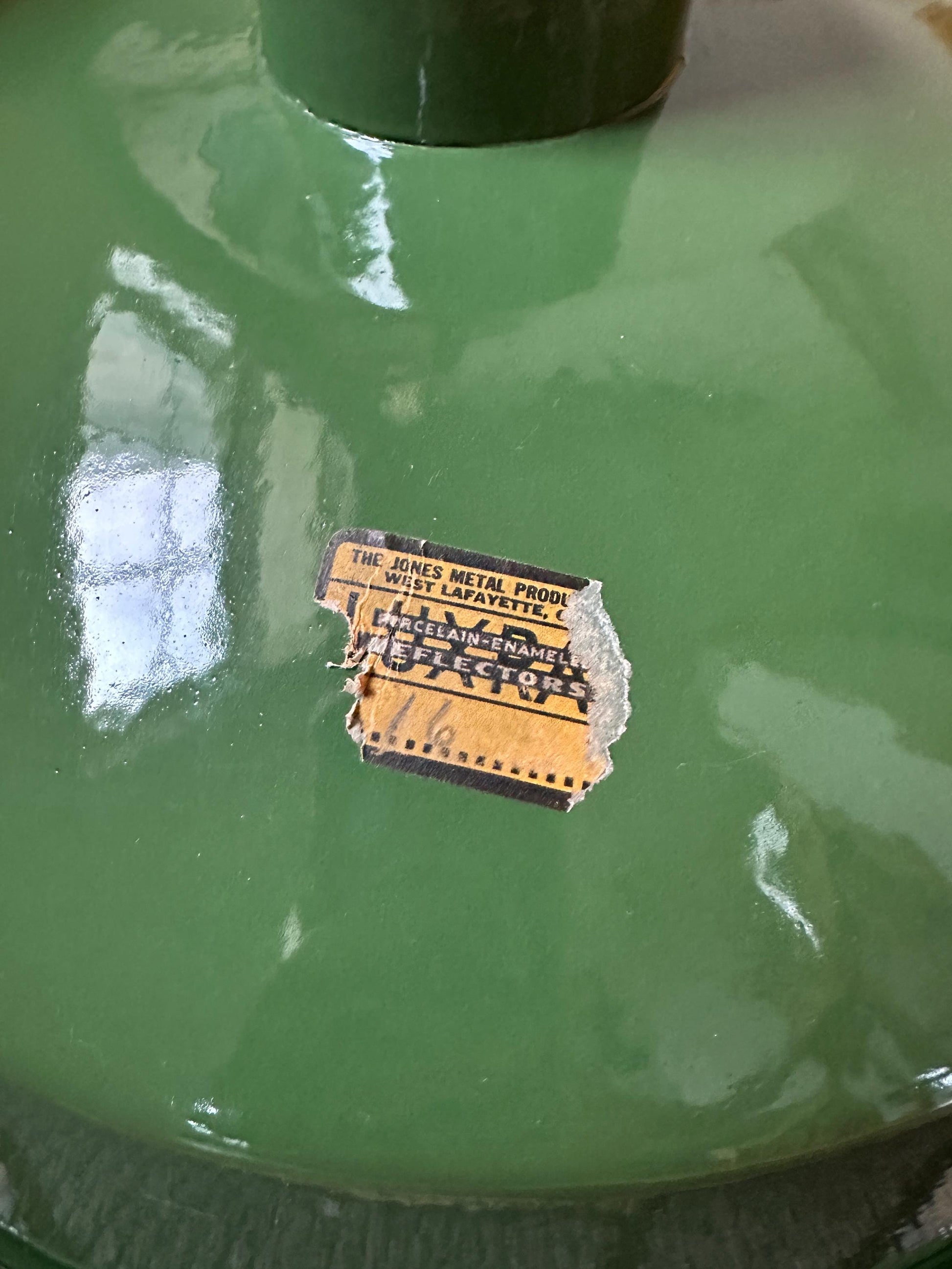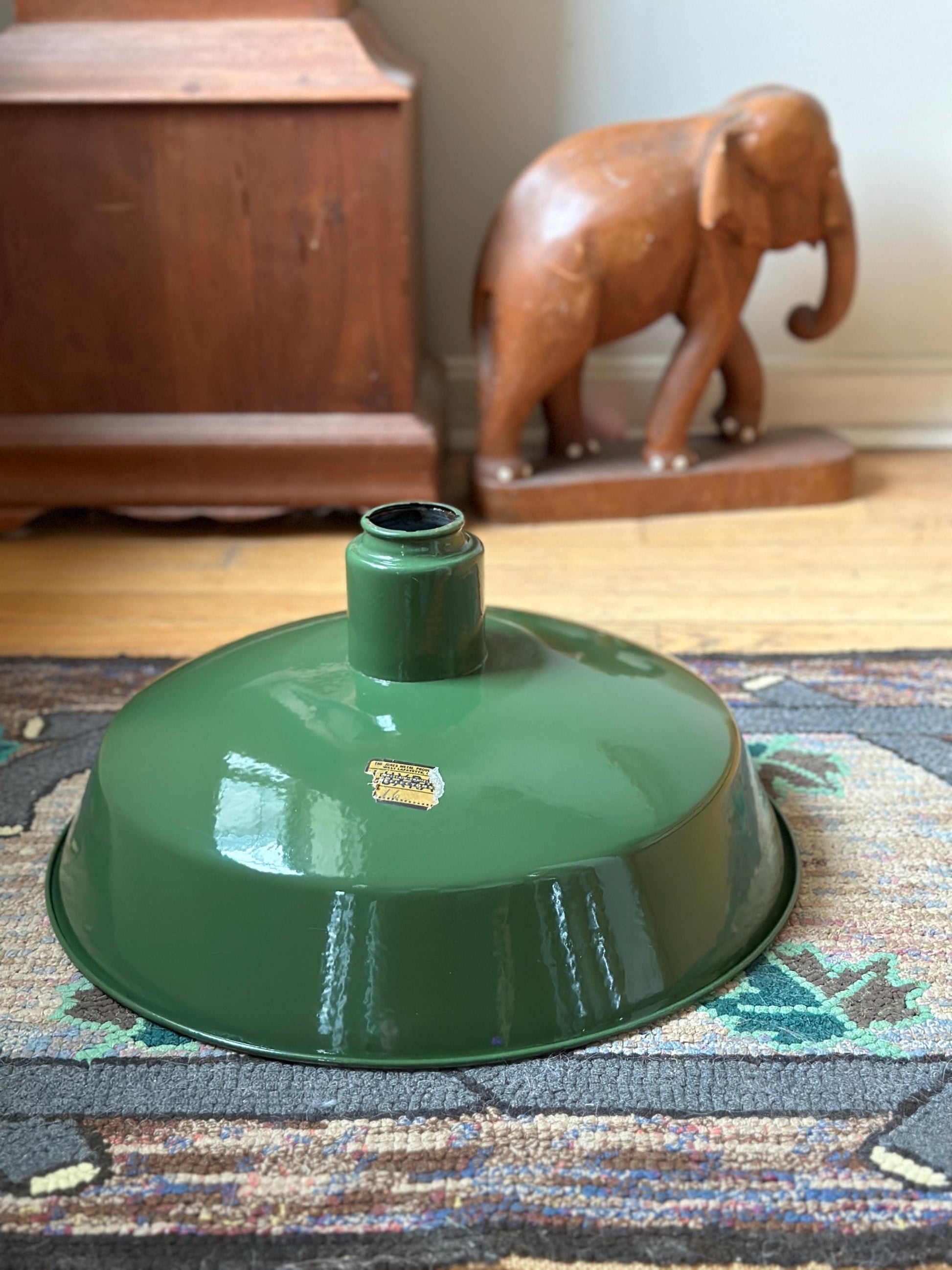 Vintage 16" Luxray Green Porcelain Enamel Yard Barn Light Gas StationVintage 16” Green Porcelain Industrial Lampshade Industrial Hanging Light Shade - Rustic Green LampshadesA classic vintage porcelain shade. Green on the outside white on the inside.This measures 16” diameter by roughly 8" tall. Shows it’s age with rust, dents, dings, blemishes, scratches, and a few chips. See pictures for close ups. Thoroughly hand washed with Dawn dish soap and sanitized but otherwise in as found condition. Dark discoloration may come off with a more heavy duty cleaner at buyer's discretion. Please see pictures for more details. If you have any questions feel free to ask!