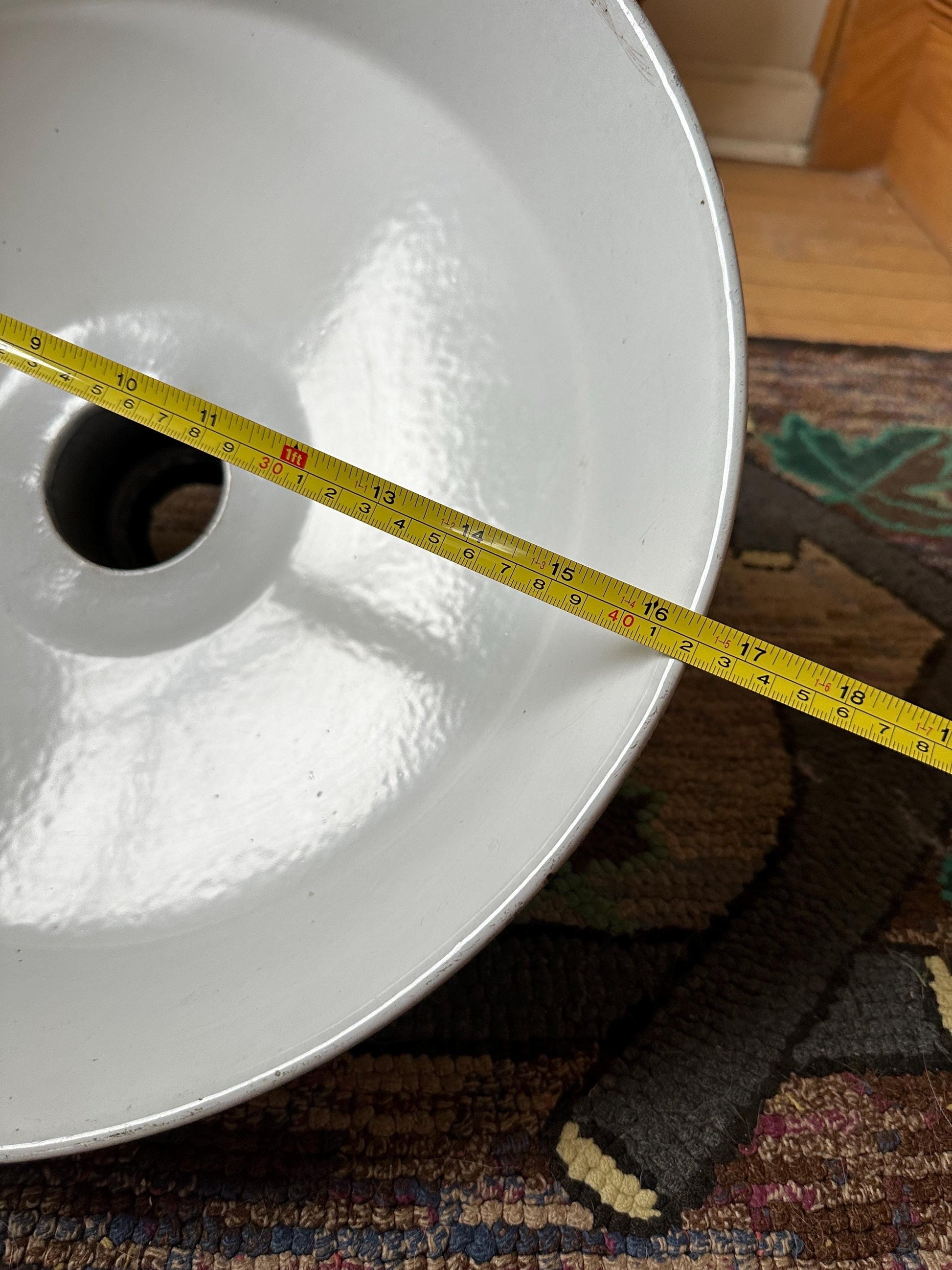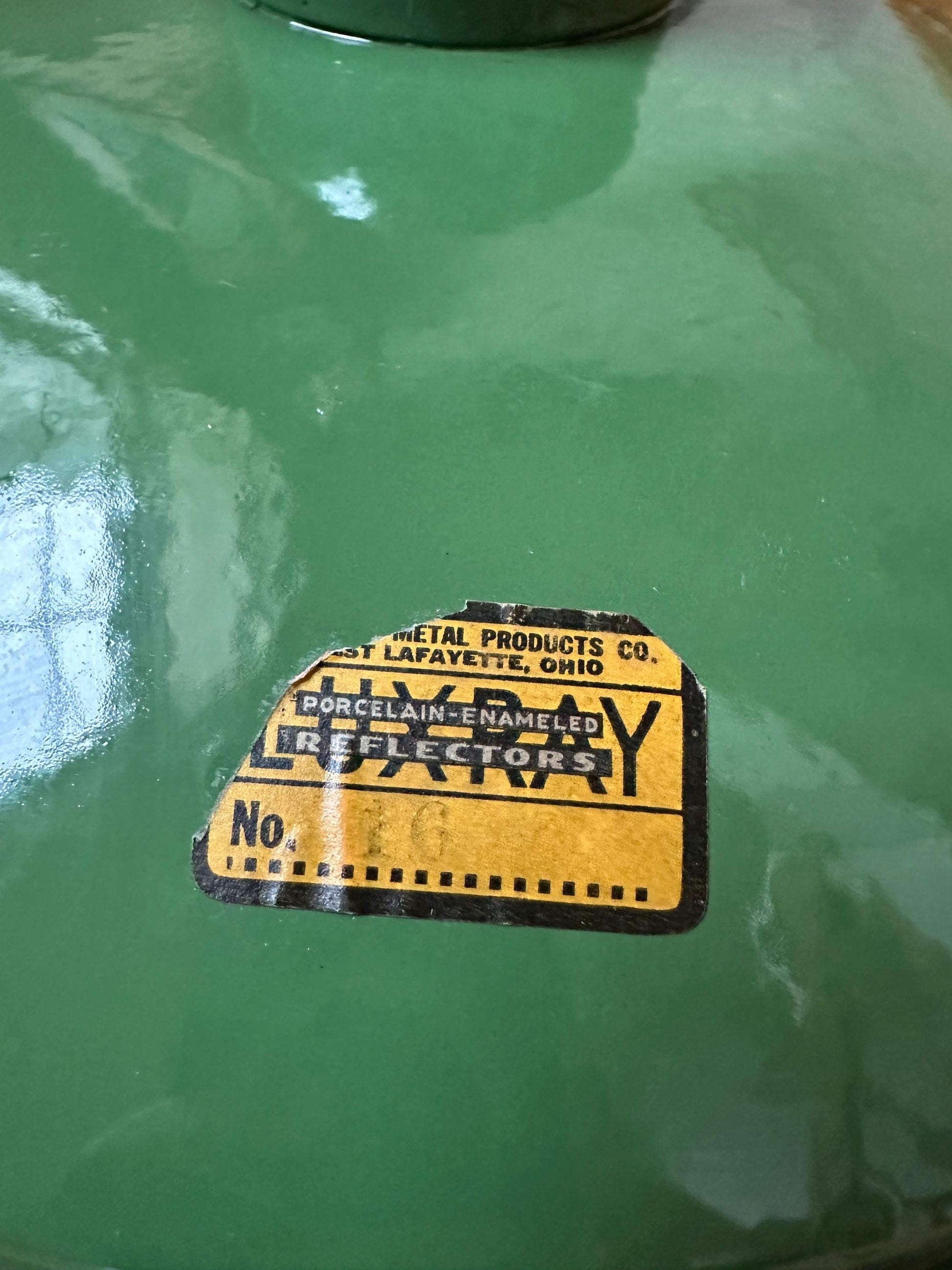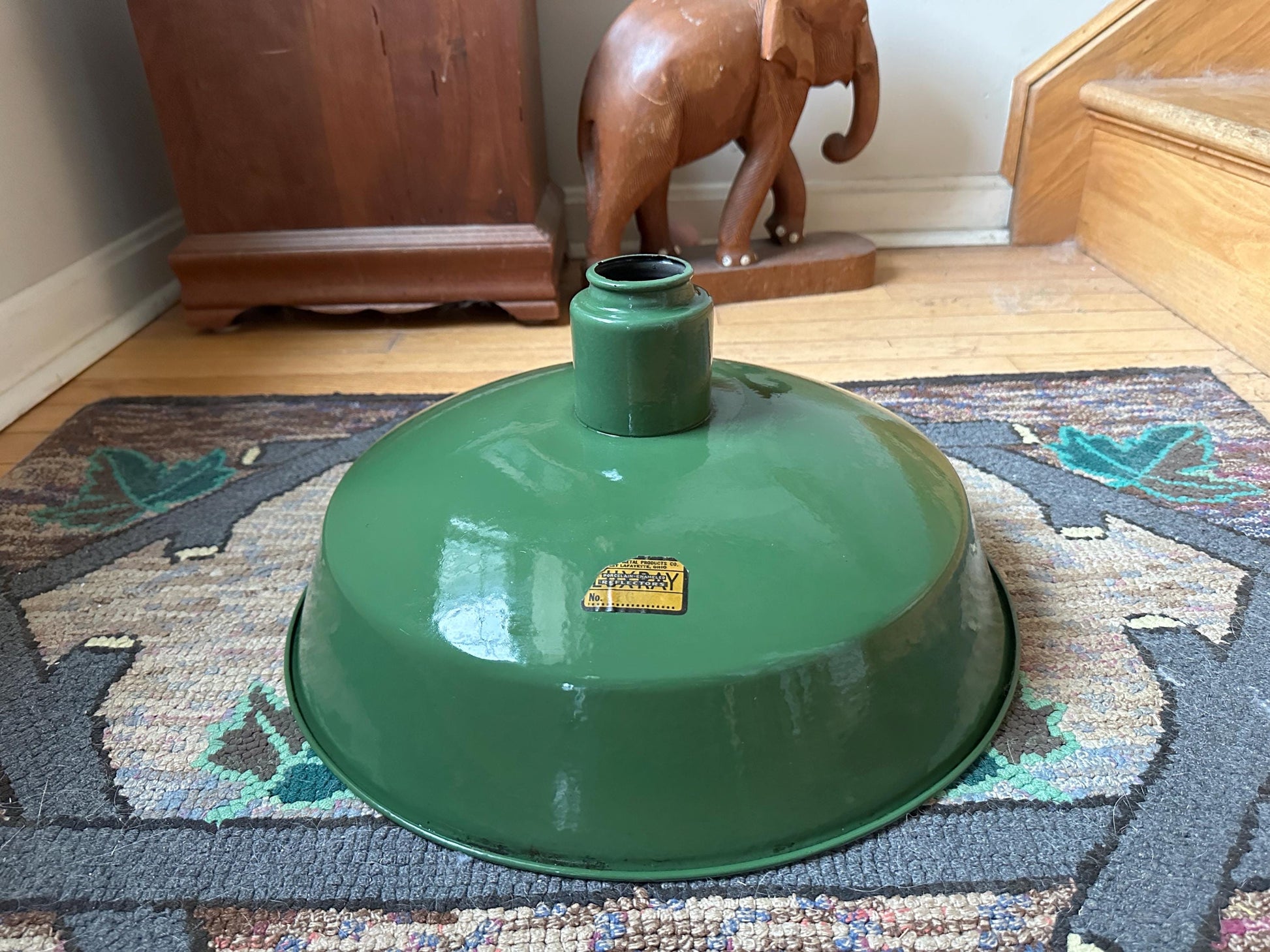 Vintage 16" Luxray Green Porcelain Enamel Yard Barn Light Gas StationVintage 16” Green Porcelain Industrial Lampshade Industrial Hanging Light Shade - Rustic Green LampshadesA classic vintage porcelain shade. Green on the outside white on the inside.This measures 16” diameter by roughly 8" tall. Shows it’s age with rust, dents, dings, blemishes, scratches, and a few chips. See pictures for close ups. Thoroughly hand washed with Dawn dish soap and sanitized but otherwise in as found condition. Dark discoloration may come off with a more heavy duty cleaner at buyer's discretion. Please see pictures for more details. If you have any questions feel free to ask!