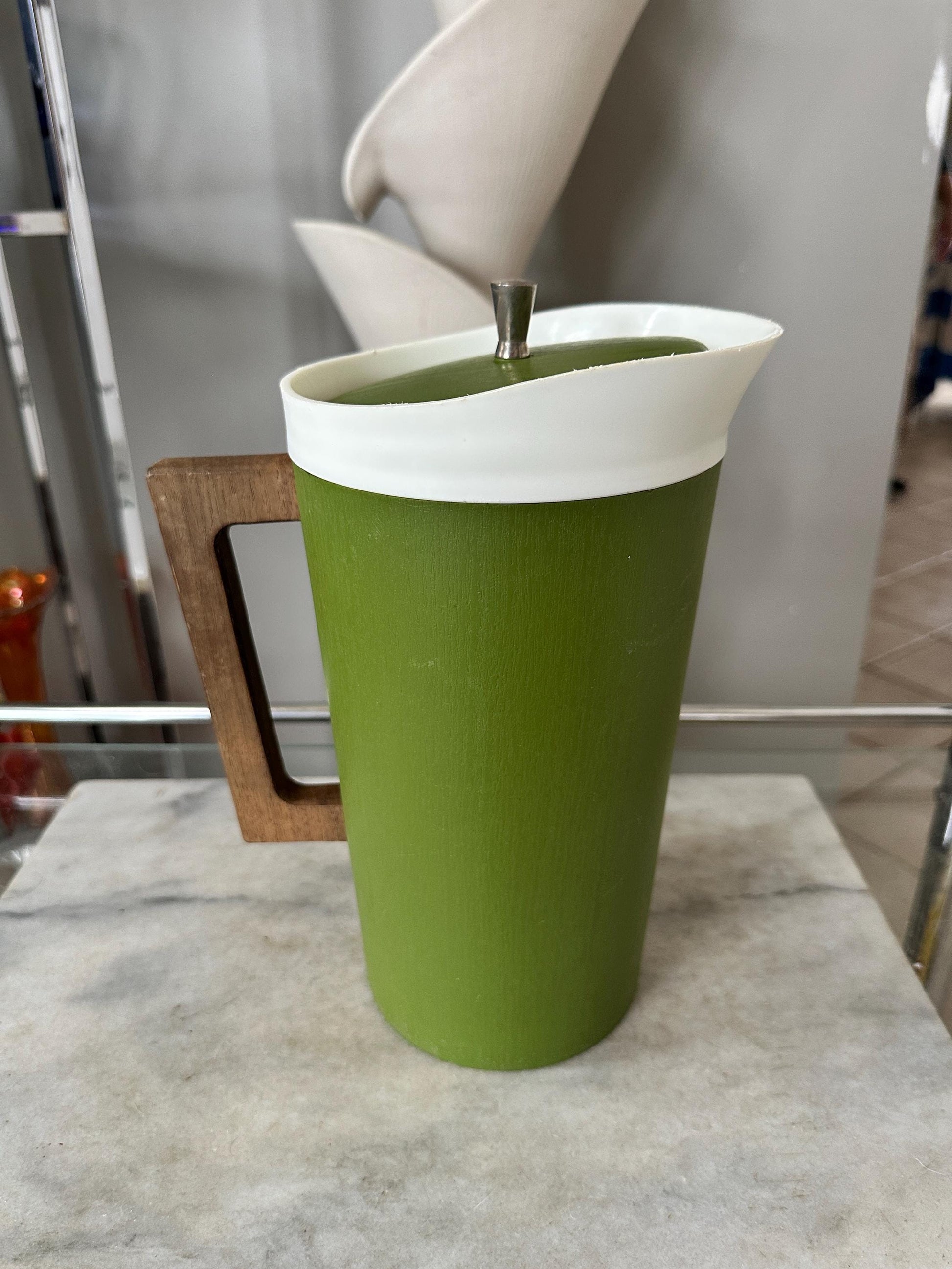 Add a bold pop of retro color to your kitchen with this vintage Mid Century Modern 2-quart pitcher in classic avocado green. Featuring a contrasting white rim, fitted lid with knob finial, and sculptural wooden handle, this piece perfectly captures the clean lines and organic materials of 1960s–70s design.The tall cylindrical shape and earthy green tone make it ideal for displaying on open shelving, styling a bar cart, or using for iced tea, lemonade, or batch cocktails at your next gathering.Details: