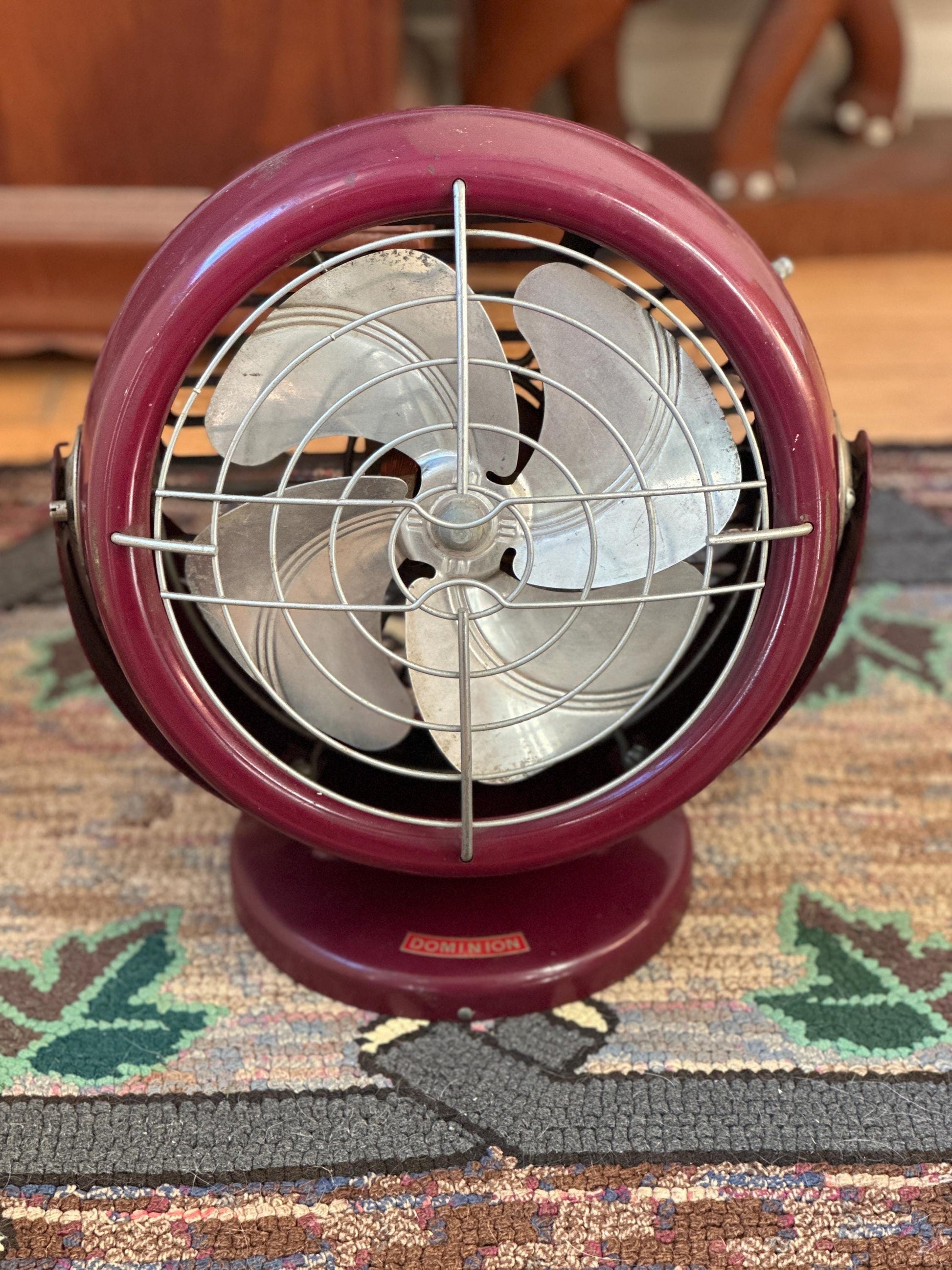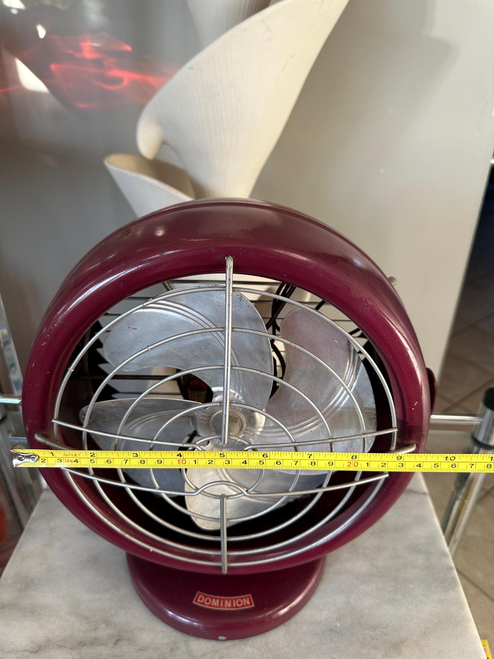 Vintage Mid Century Dominion Fan Model No. 2005-A Industrial 1 Speed Works.Cool old fan from estate sale. Still works though it is not quiet. Could use a good cleaning and some minor finish issues at the top that are hard to notice.Measures 12.75” x 9.5”Rare Burgundy color. View pictures for more details. Thanks
