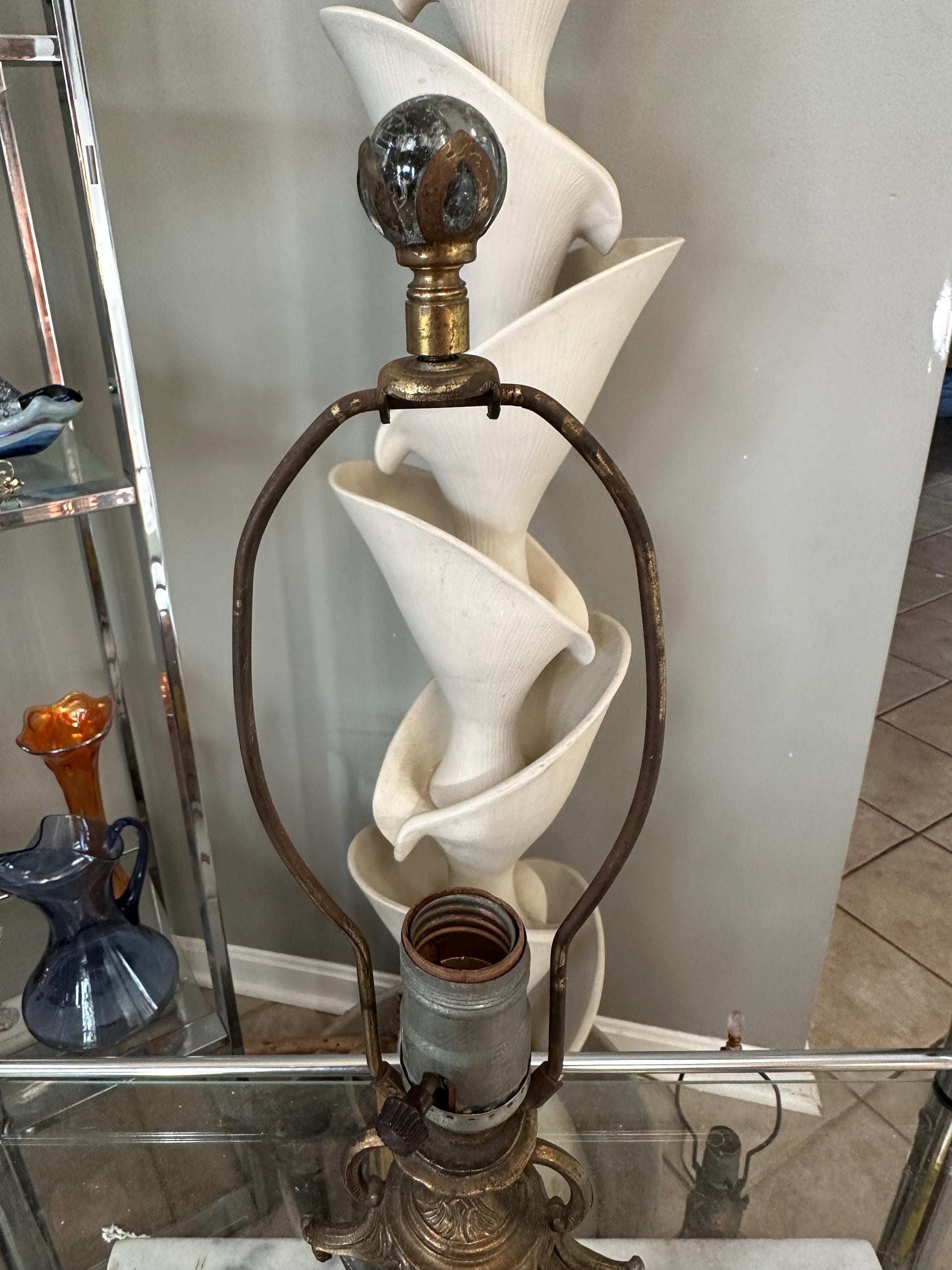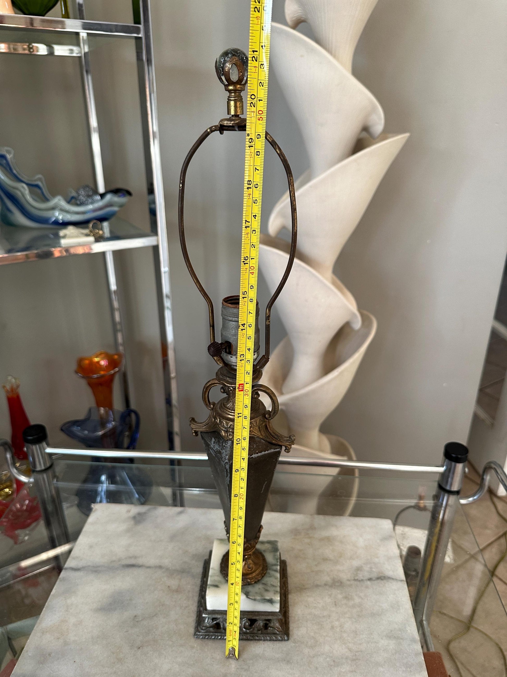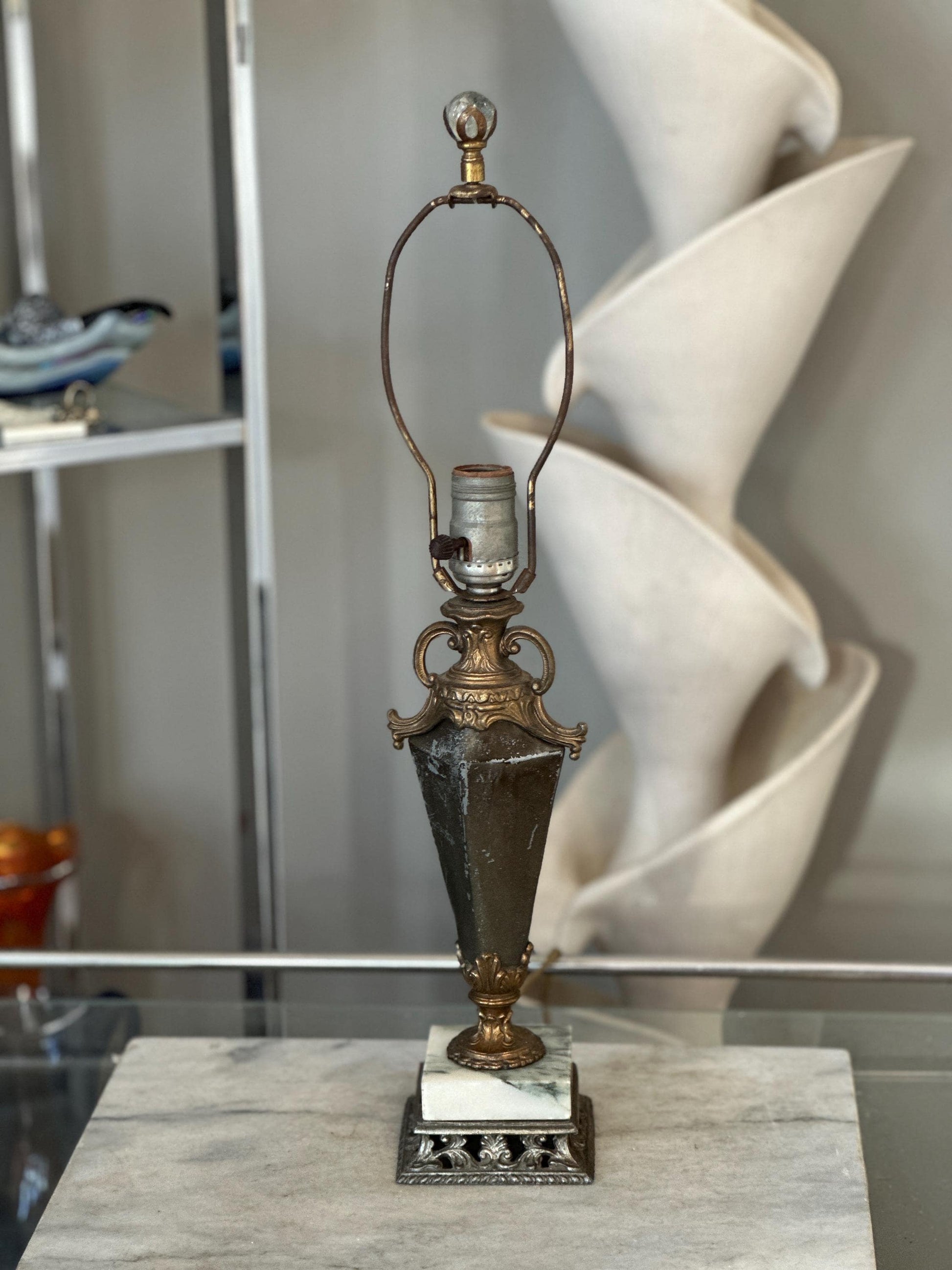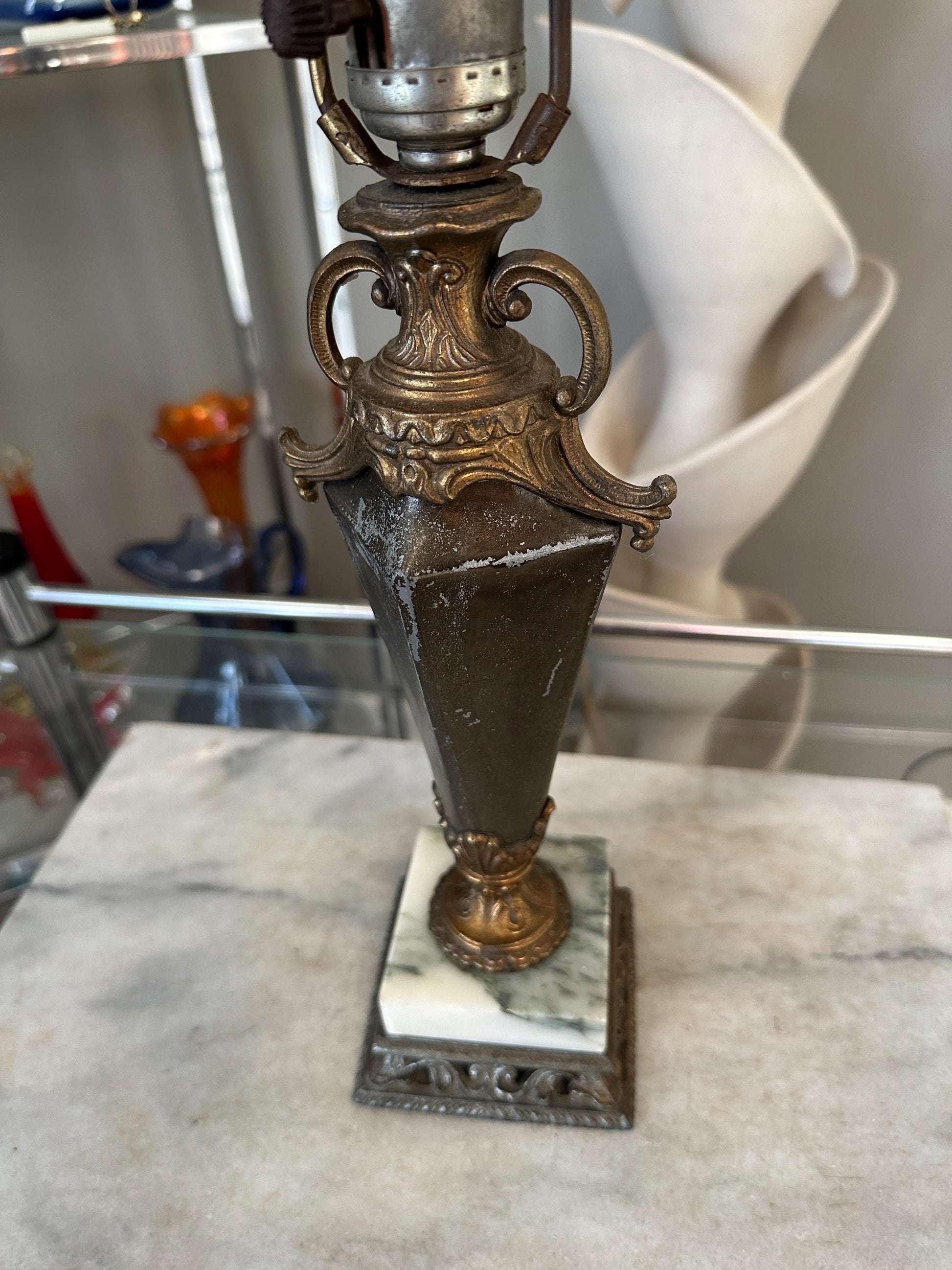 Style: Neoclassical / Classical Revival Era: Vintage Height: Approximately 22 inches (to finial), 14.75” (to socket.)Materials: Ornate brass or bronze-tone metal body White marble base Form: Urn-shaped column with scroll handles Socket: Standard rotary socket Color Palette: Aged brass/bronze, white marble (Shade not included.)Decorative metal and glass finial.Condition Good vintage condition. Visible patina and surface wear consistent with age Metal shows natural darkening and character Marble base is intact with light wear Wiring and socket appear vintage; rewiring is recommended if intended for daily usePlease review all photos carefully, as they are part of the description.Perfect For Traditional or neoclassical interiors Library, study, or formal living room Antique and vintage décor collectors Hollywood Regency or European-style homesVintage table lamp, neoclassical lamp, marble base lamp, brass urn lamp, classical lighting, antique style lamp, traditional décor, vintage brass lamp, European décor