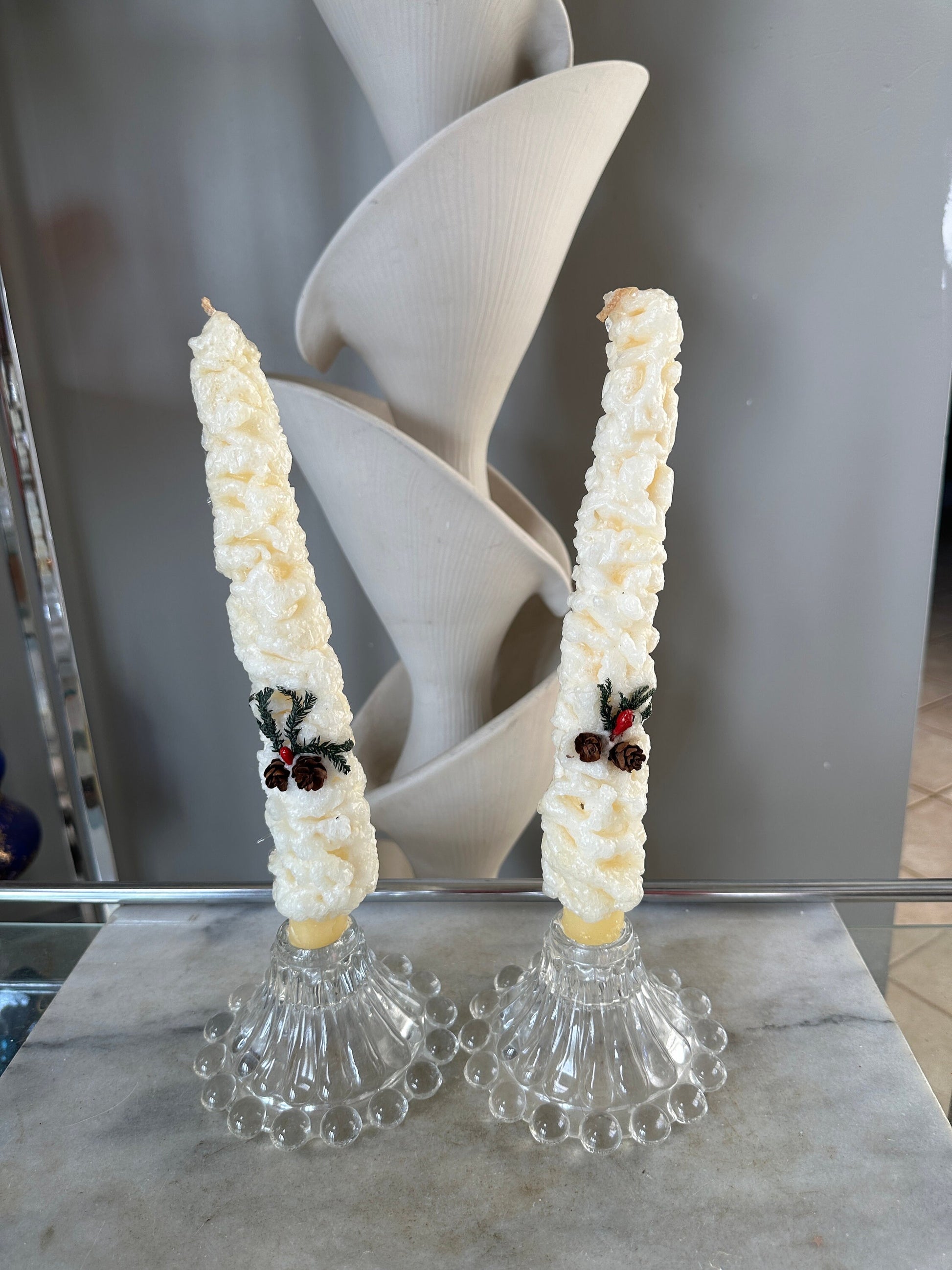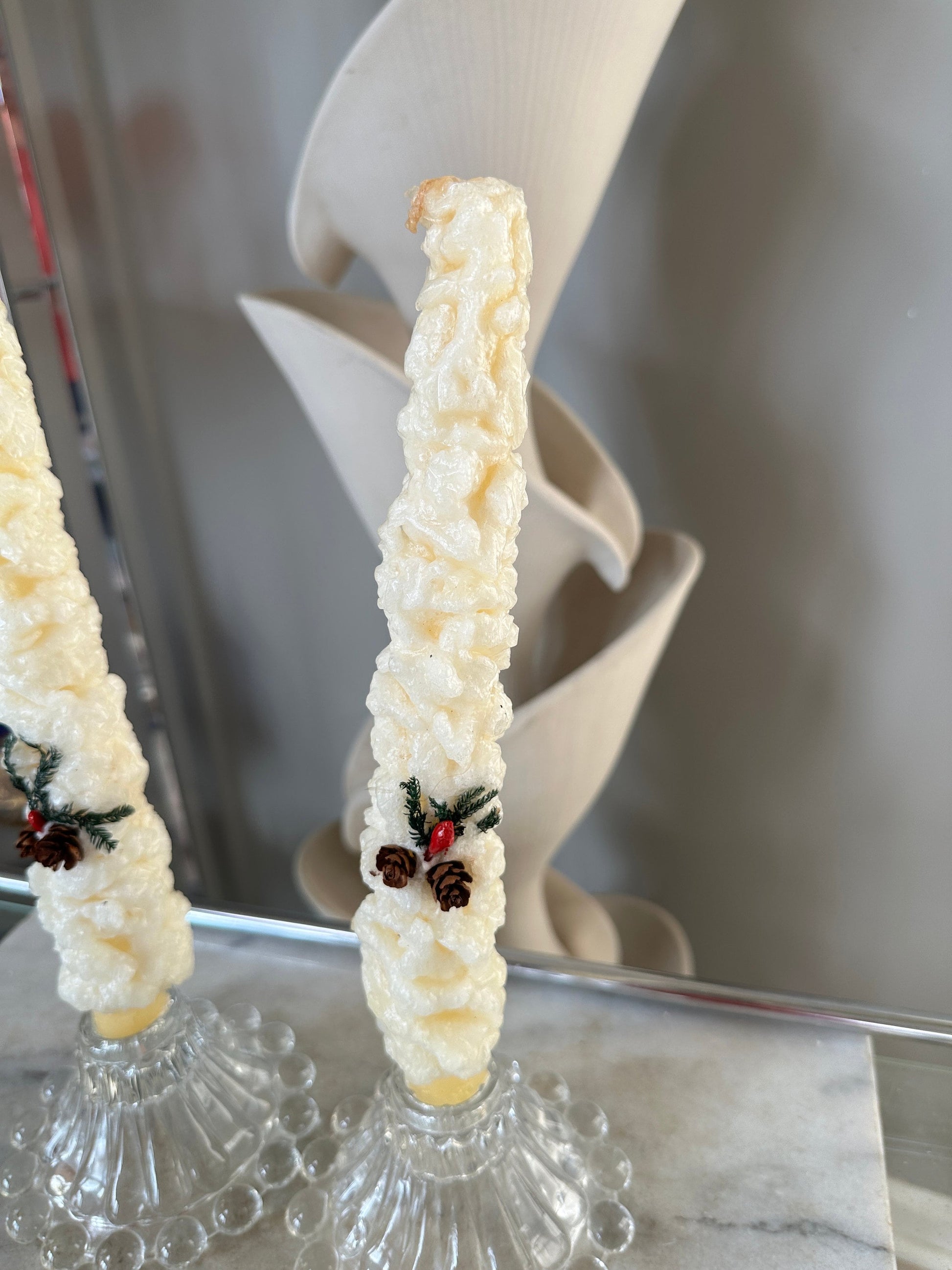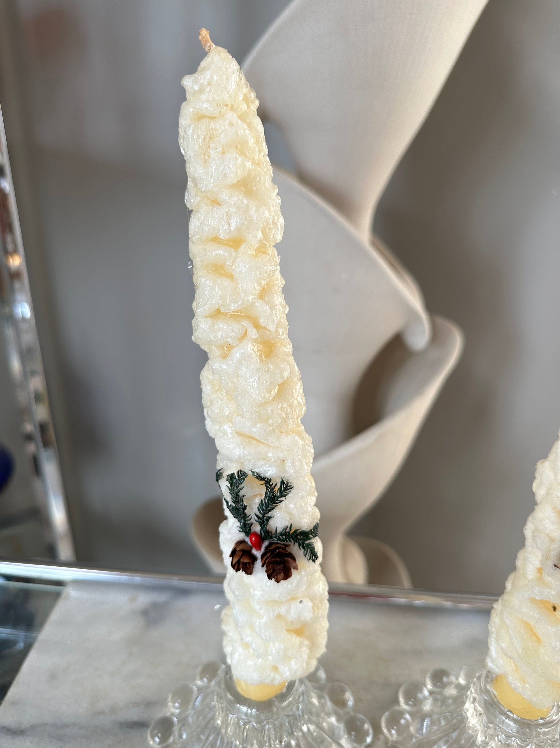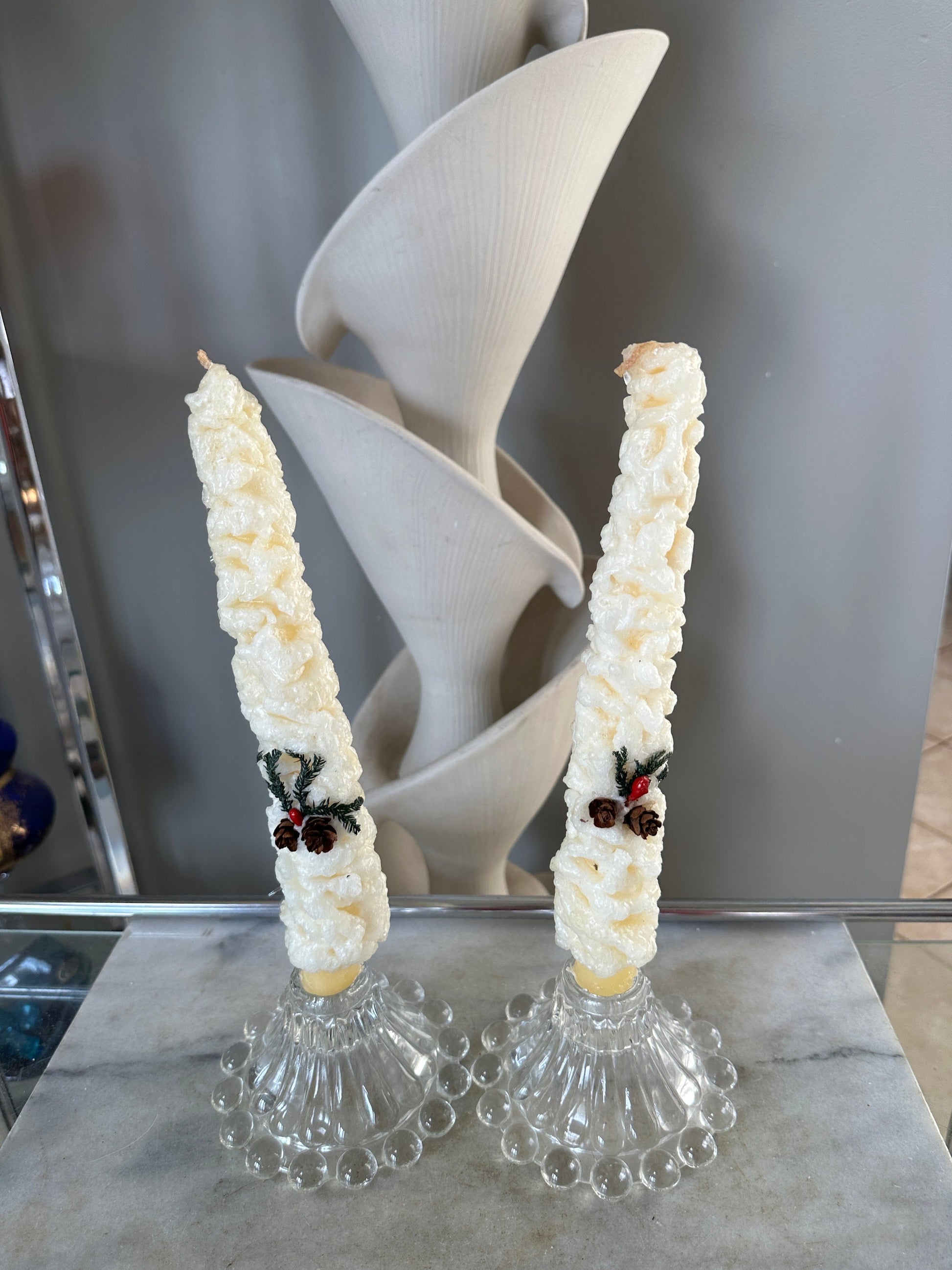 A set of two Christmas Taper Candles by Penn Wax Works from the 1950s - in original box.Features a whited adorned with white “snow” accents made of wax as well as small pine cones and leaves.Each candle measures 12” long and .75” across at the bottom.These have never been used.Candles will come in the original box. product number 246.Candles are in overall good vintage condition. No chips or cracks, but both candles are warped/flattened on the bottom. These still stand in candle holders - but lean a little. Please see photos.Perfect for your vintage Christmas display.