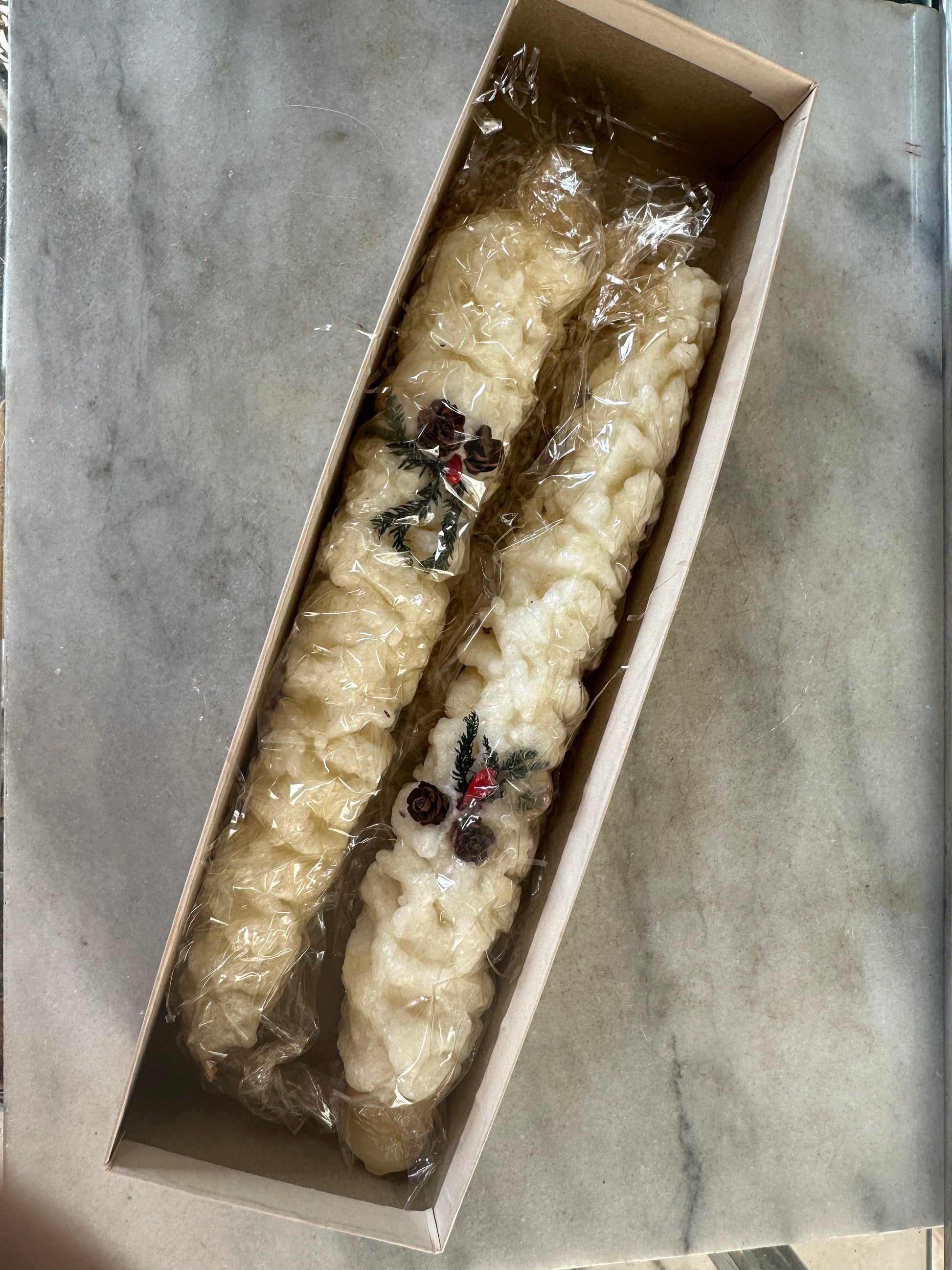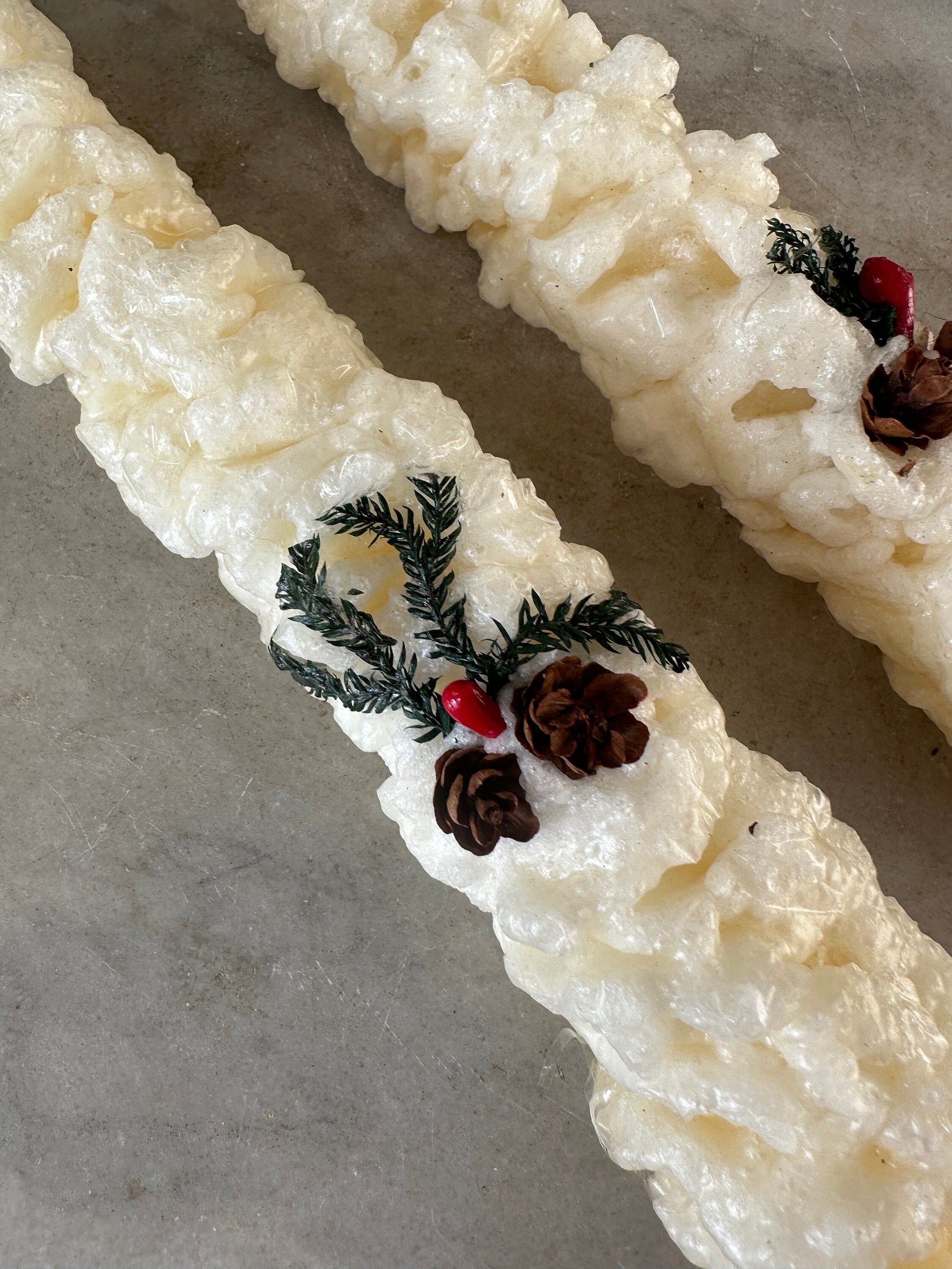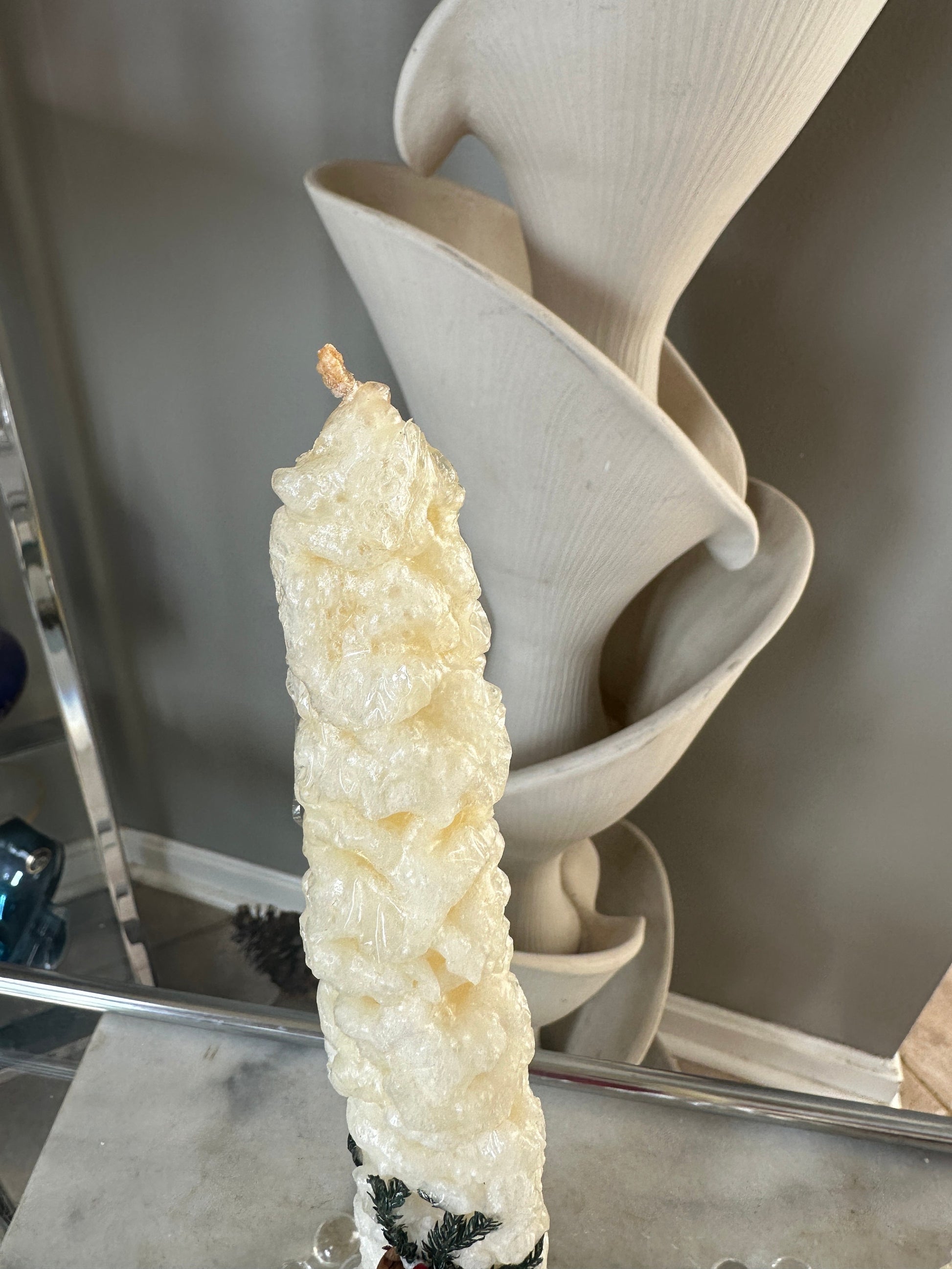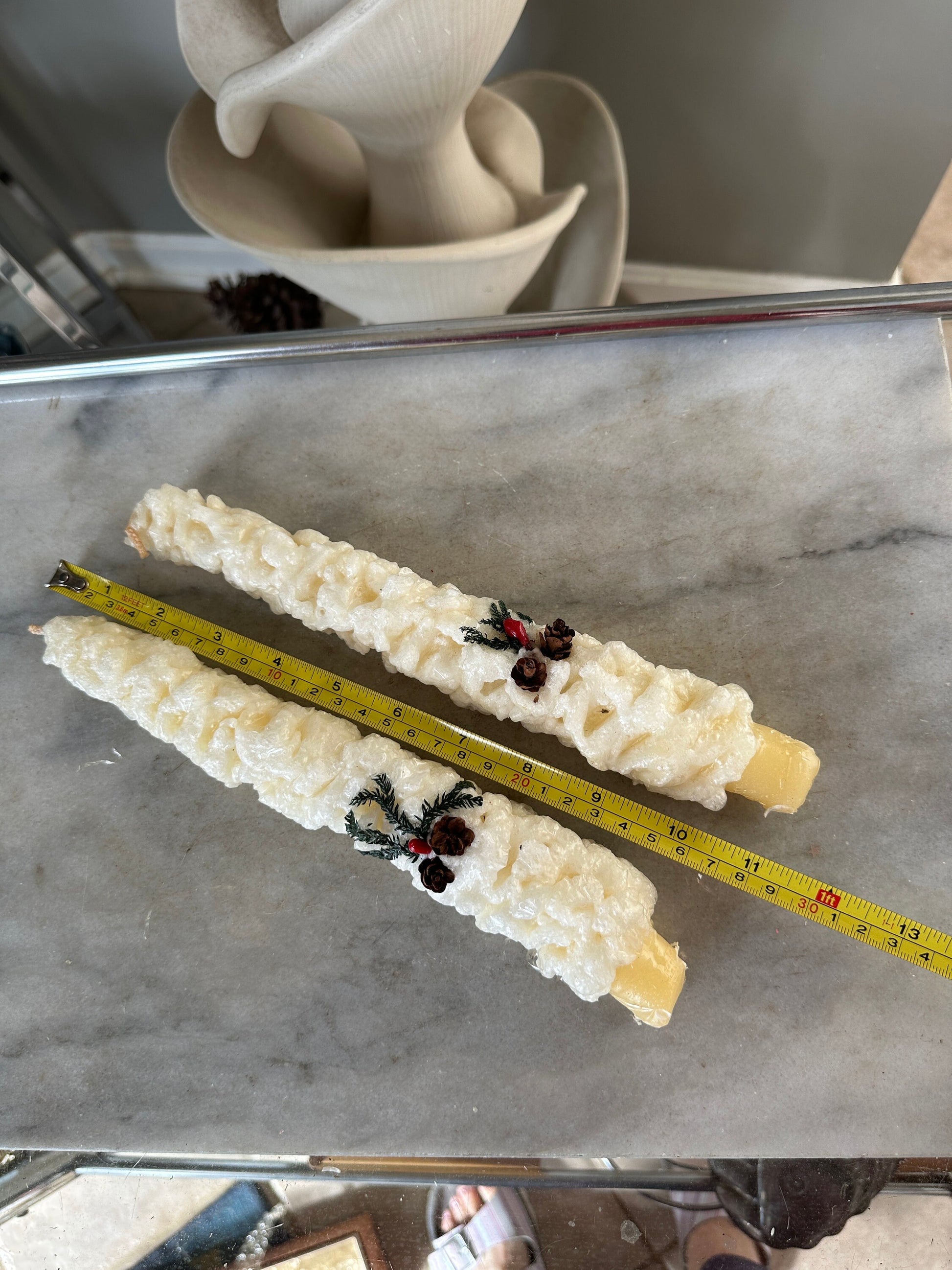 A set of two Christmas Taper Candles by Penn Wax Works from the 1950s - in original box.Features a whited adorned with white “snow” accents made of wax as well as small pine cones and leaves.Each candle measures 12” long and .75” across at the bottom.These have never been used.Candles will come in the original box. product number 246.Candles are in overall good vintage condition. No chips or cracks, but both candles are warped/flattened on the bottom. These still stand in candle holders - but lean a little. Please see photos.Perfect for your vintage Christmas display.