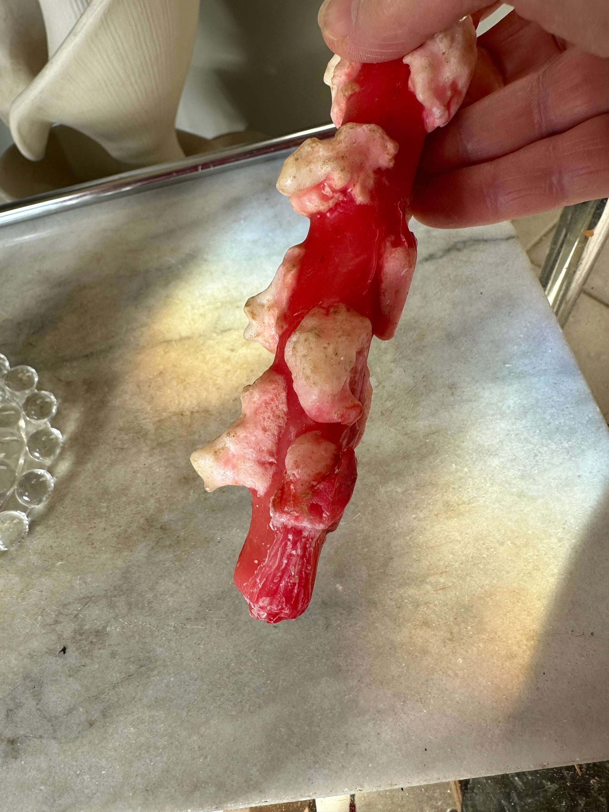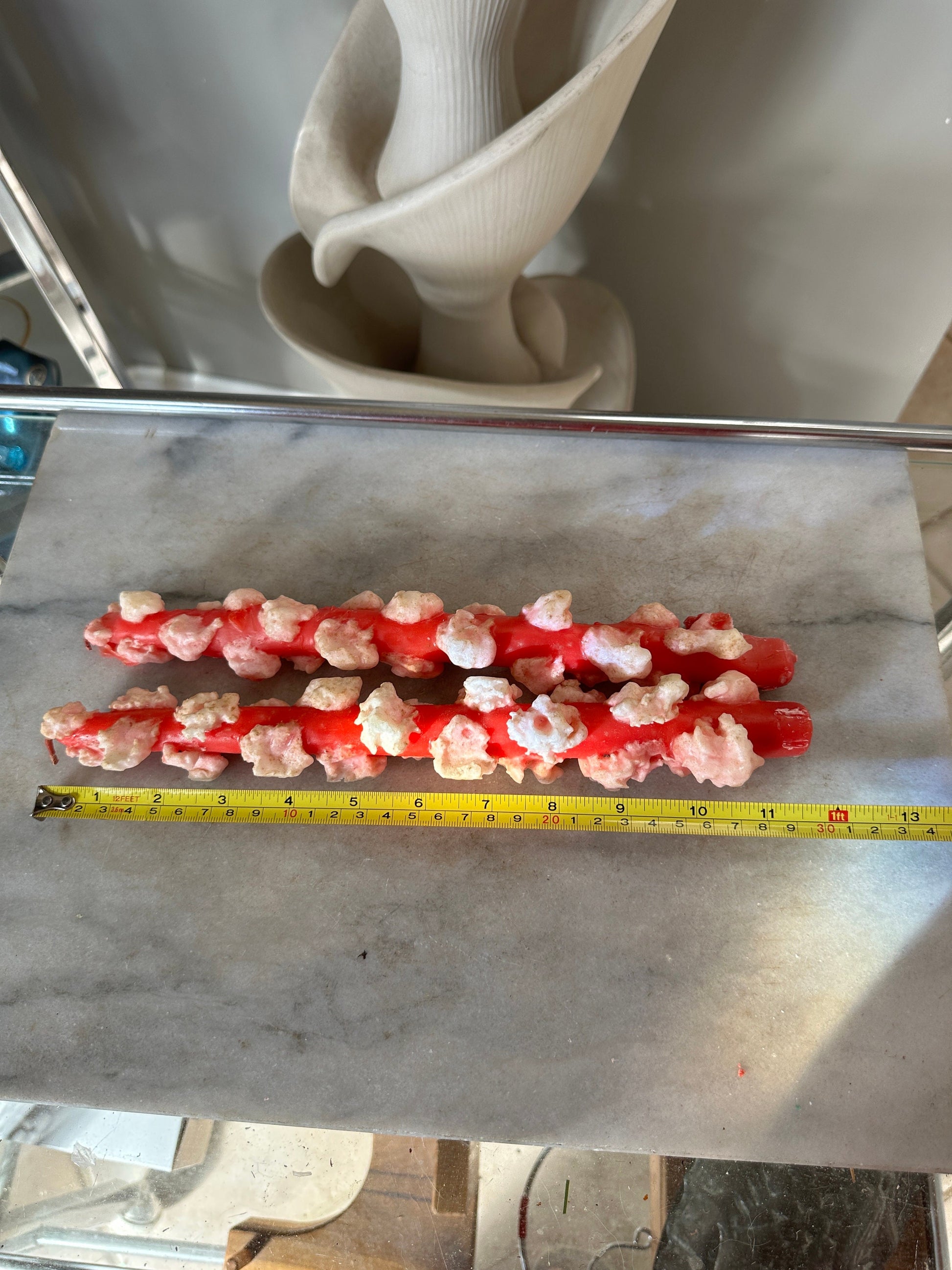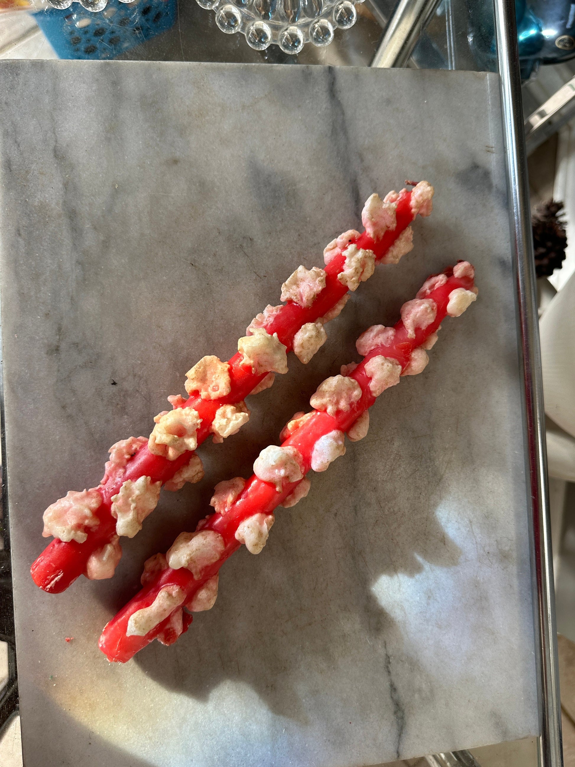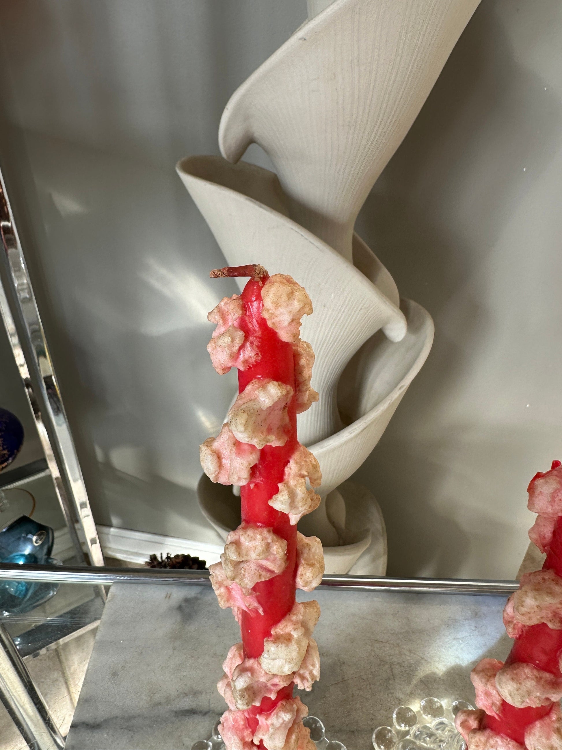 A set of two Christmas Taper Candles by Penn Wax Works from the 1950s - in original box.Features a red candle adorned with white “snow” accents made of wax.Each candle measures 12” long and .75” across at the bottom.These have never been used.Candles will come in the original box. product number 270.Candles are in overall good vintage condition. No chips or cracks, but one candle is warped/flattened on the bottom. It still stands upright in a candle holder.perfect for your vintage Christmas display.