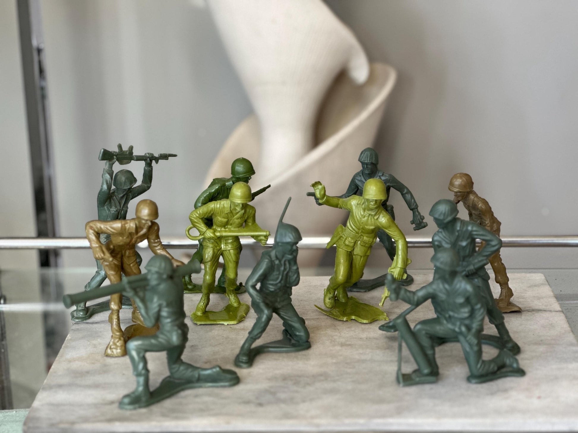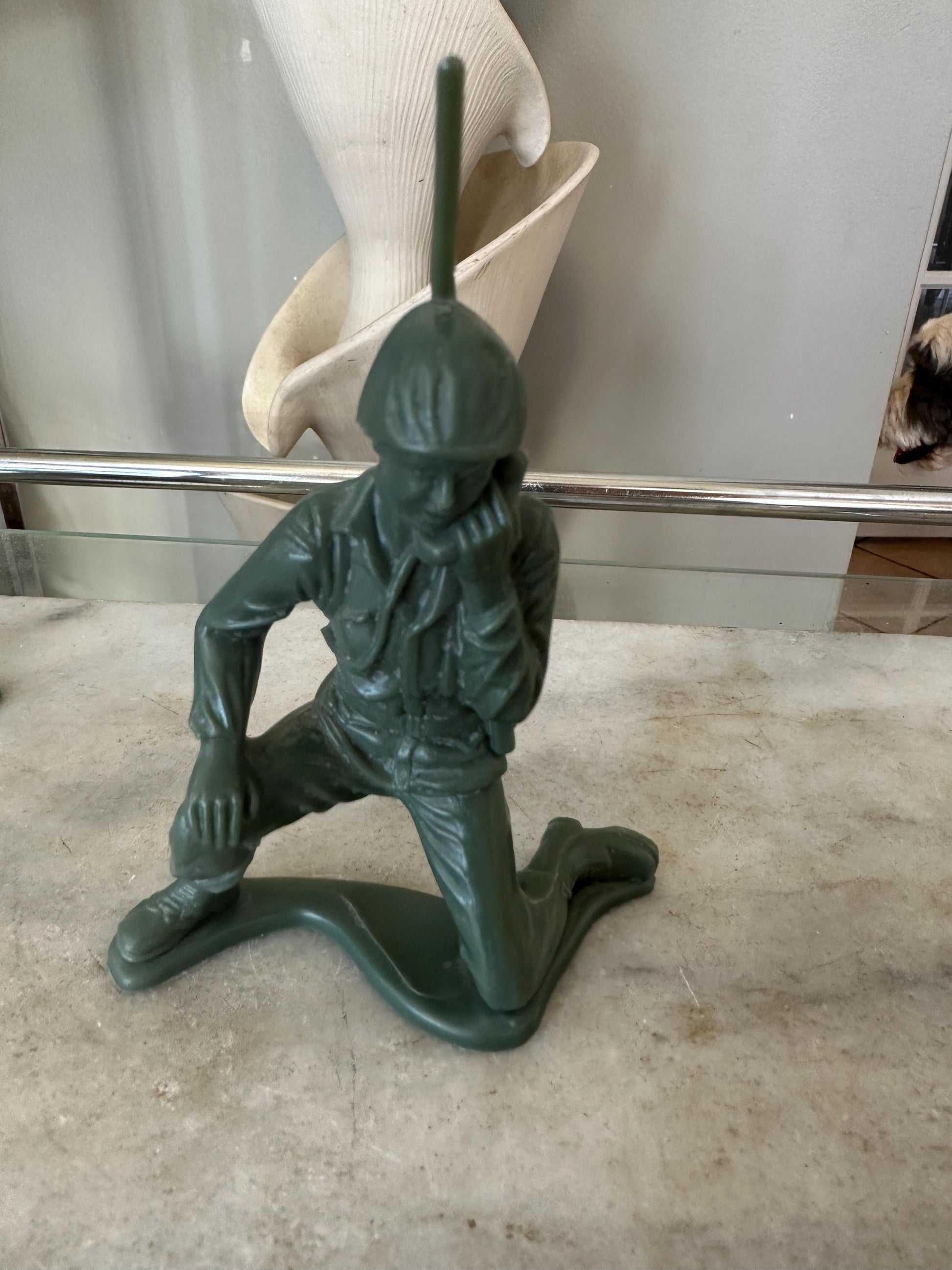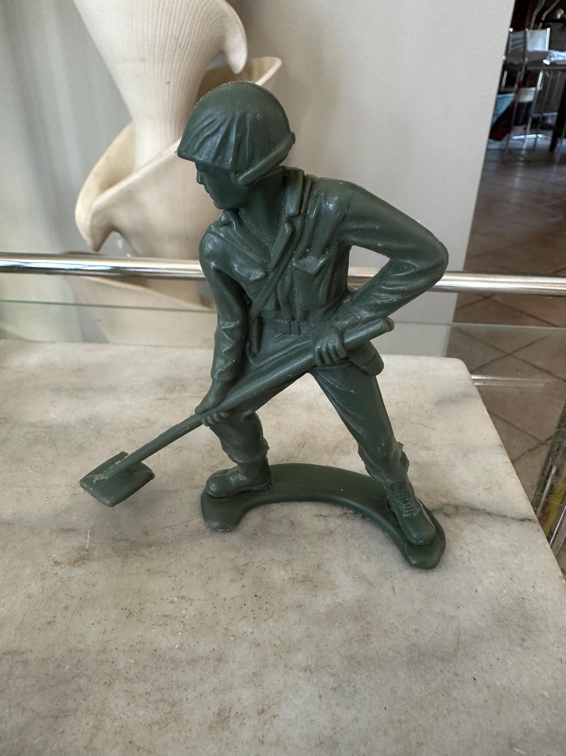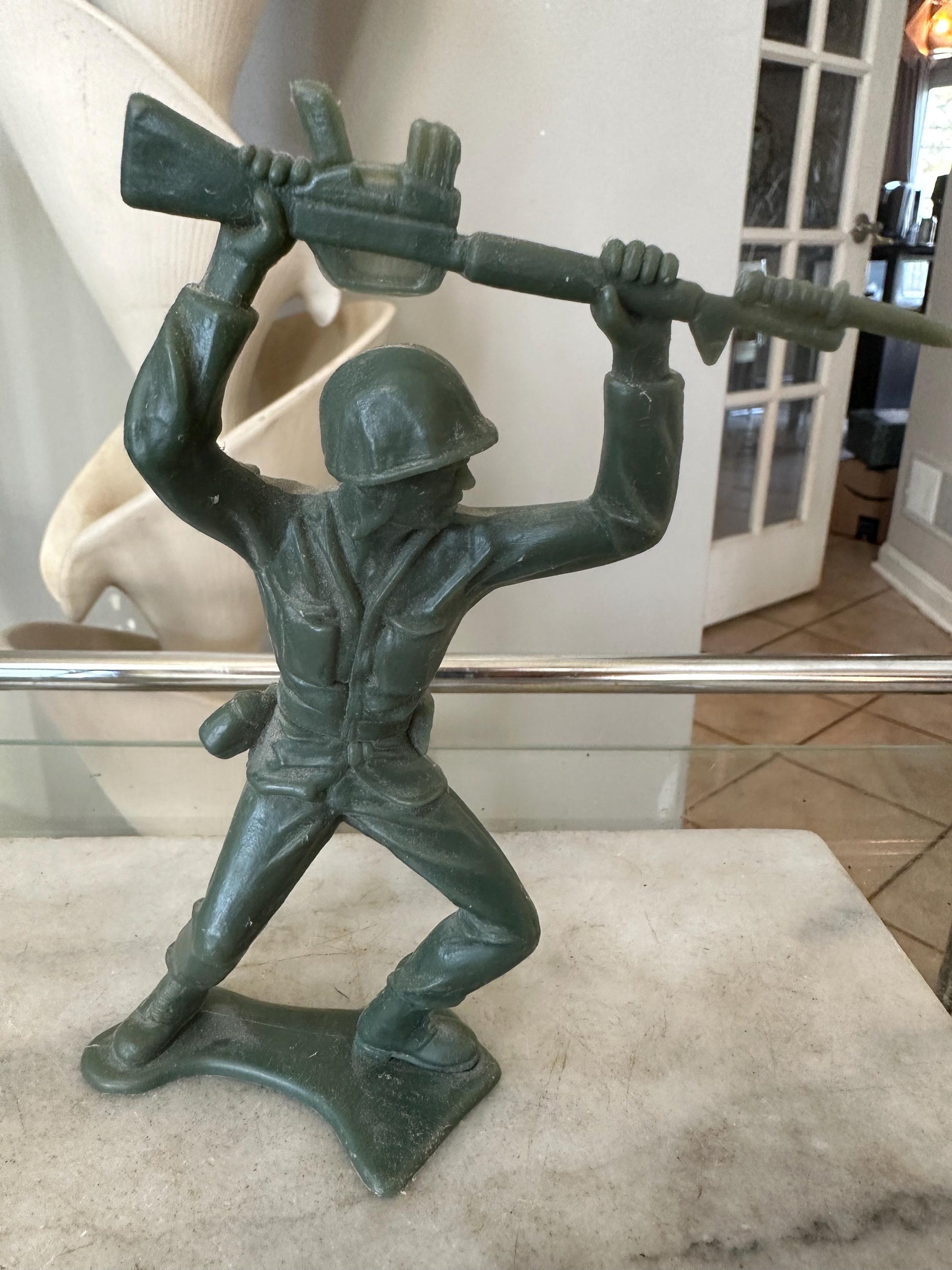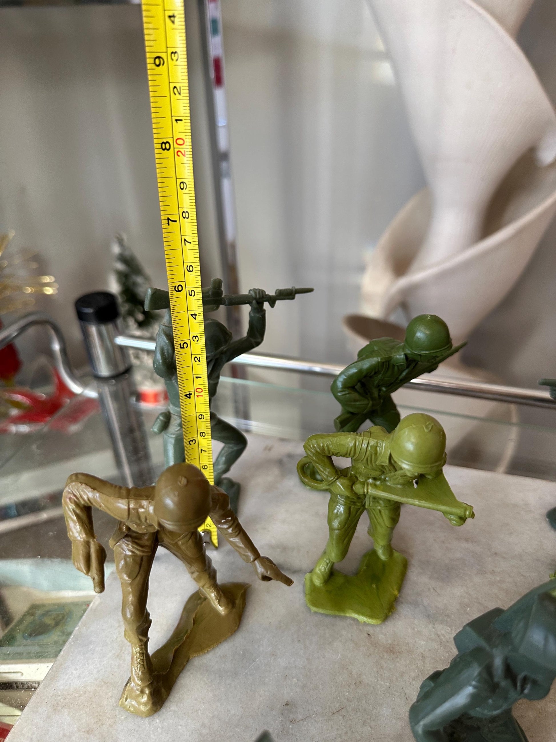 Great vintage lot of 11 large plastic toy soldiers, perfect for collectors, display, or nostalgic play. This collection includes 6 Tim-Mee 6-inch plastic soldiers, a well-known and collectible American toy brand from the mid-20th century.These classic soldiers feature detailed molded poses typical of 1960s toy production and are larger than standard army men, making them ideal for shelf display or dioramas.Details