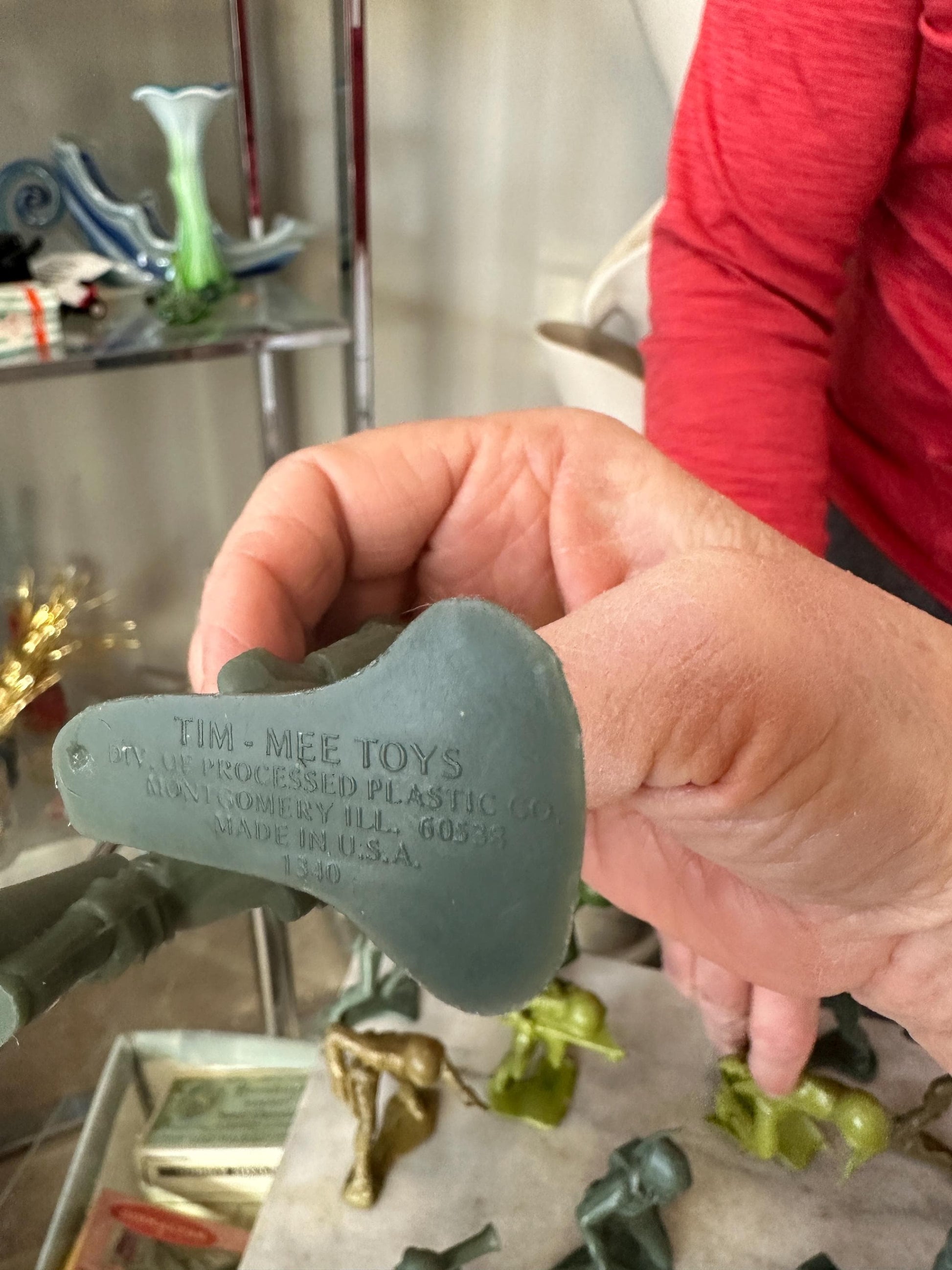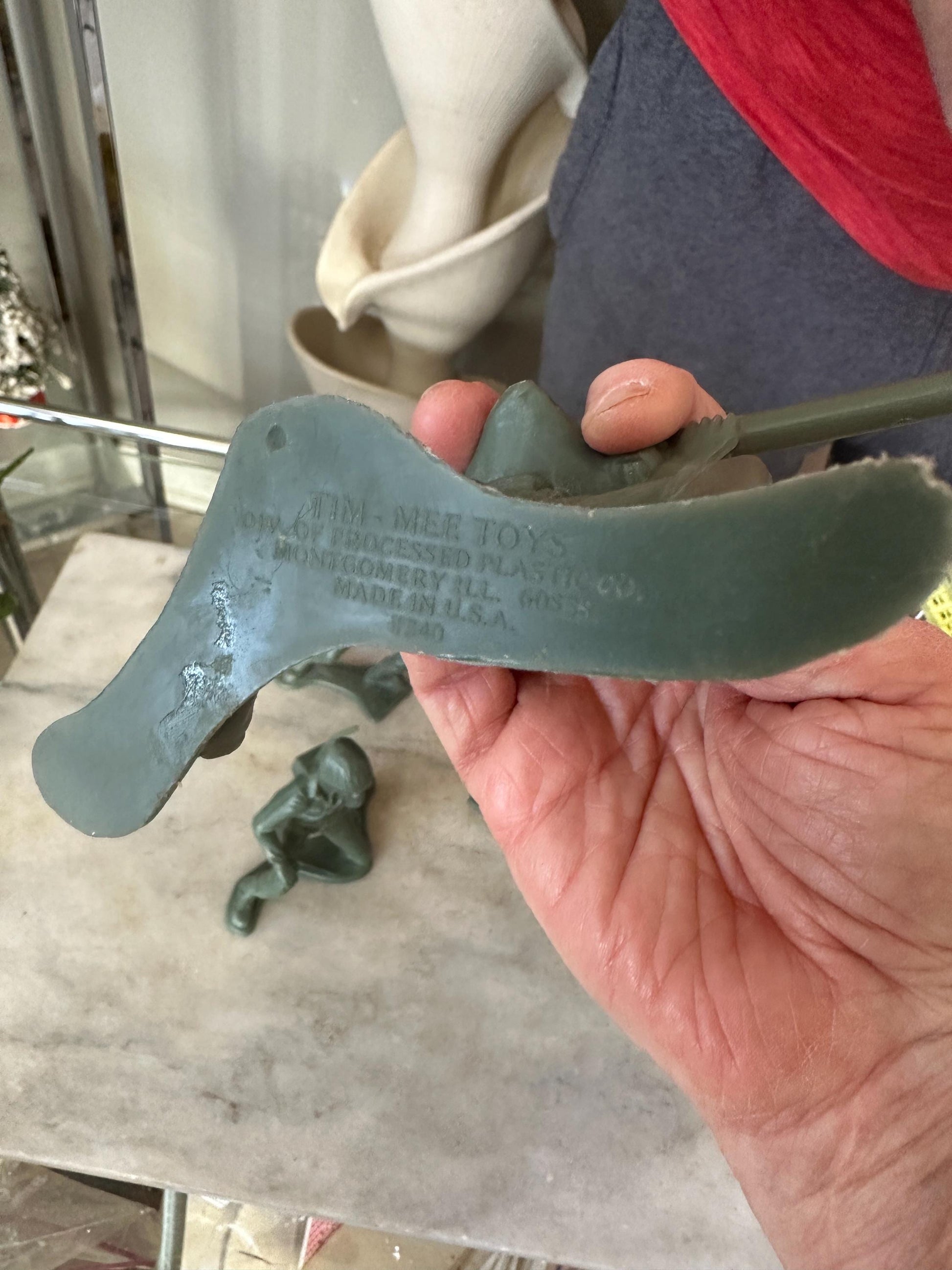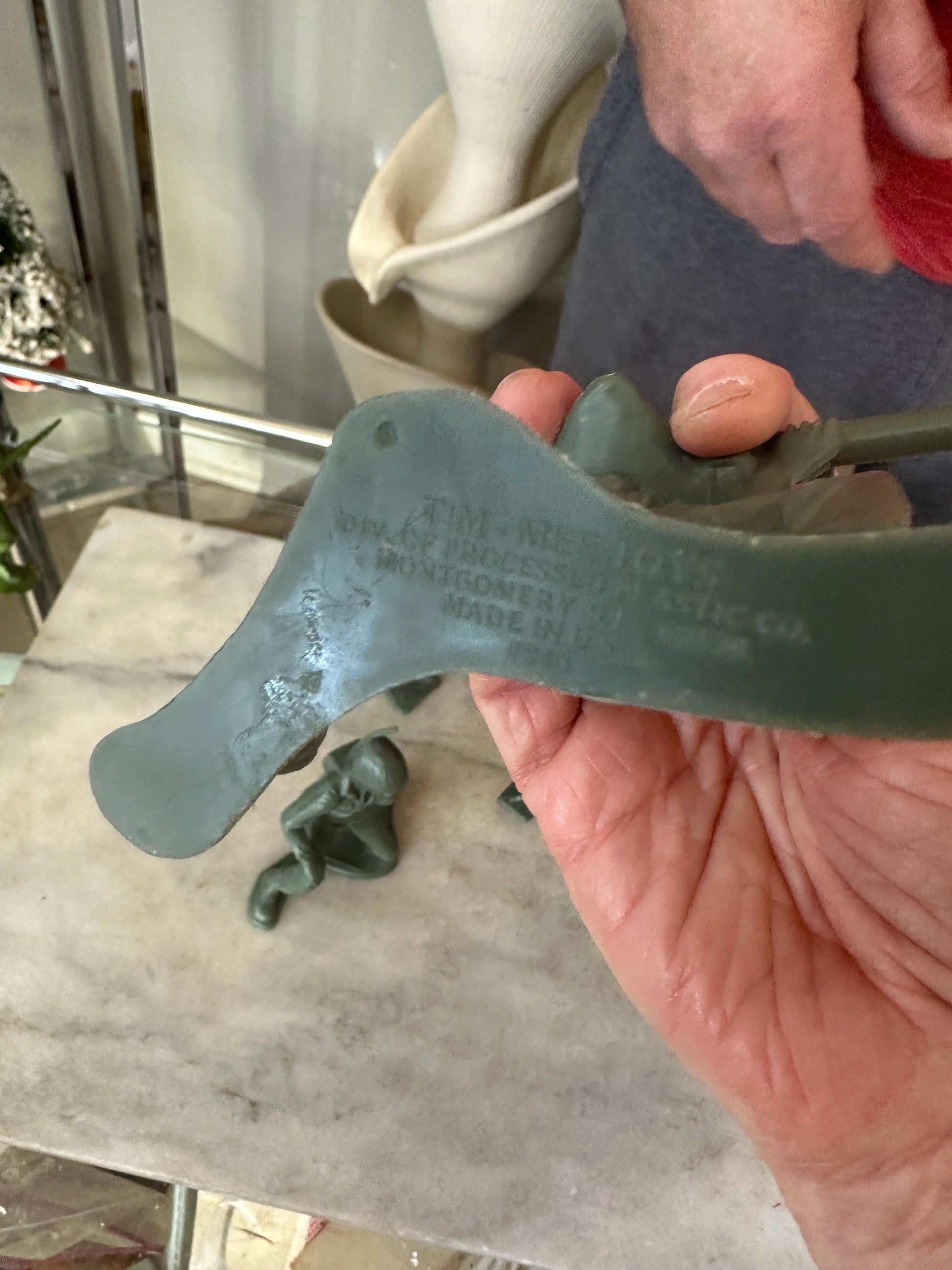 Total Pieces: 11 plastic soldiers Brand Included: Tim-Mee Tim-Mee Figures: 6 figures, approx. 6 inches tall Era: 1960s Material: Hard plastic Color: Mixed (typical army tones) Made in: USA (Tim-Mee)Condition Notes Good vintage condition overall. Expected signs of age such as surface wear, scuffs, or slight paint loss. No major cracks noted unless shown in photos. Please review images carefully for exact condition of each figure.Perfect For ✔ Vintage toy collectors ✔ Military memorabilia displays ✔ Mid-century Americana collections ✔ Dioramas or decorative use vintage toy soldiers, tim mee soldiers, plastic soldiers, 1960s toys, vintage army men, toy soldier lot, military toys, collectible toys, mid century toys, vintage plastic toys, americana collectibles, army figures, timmee soldiers