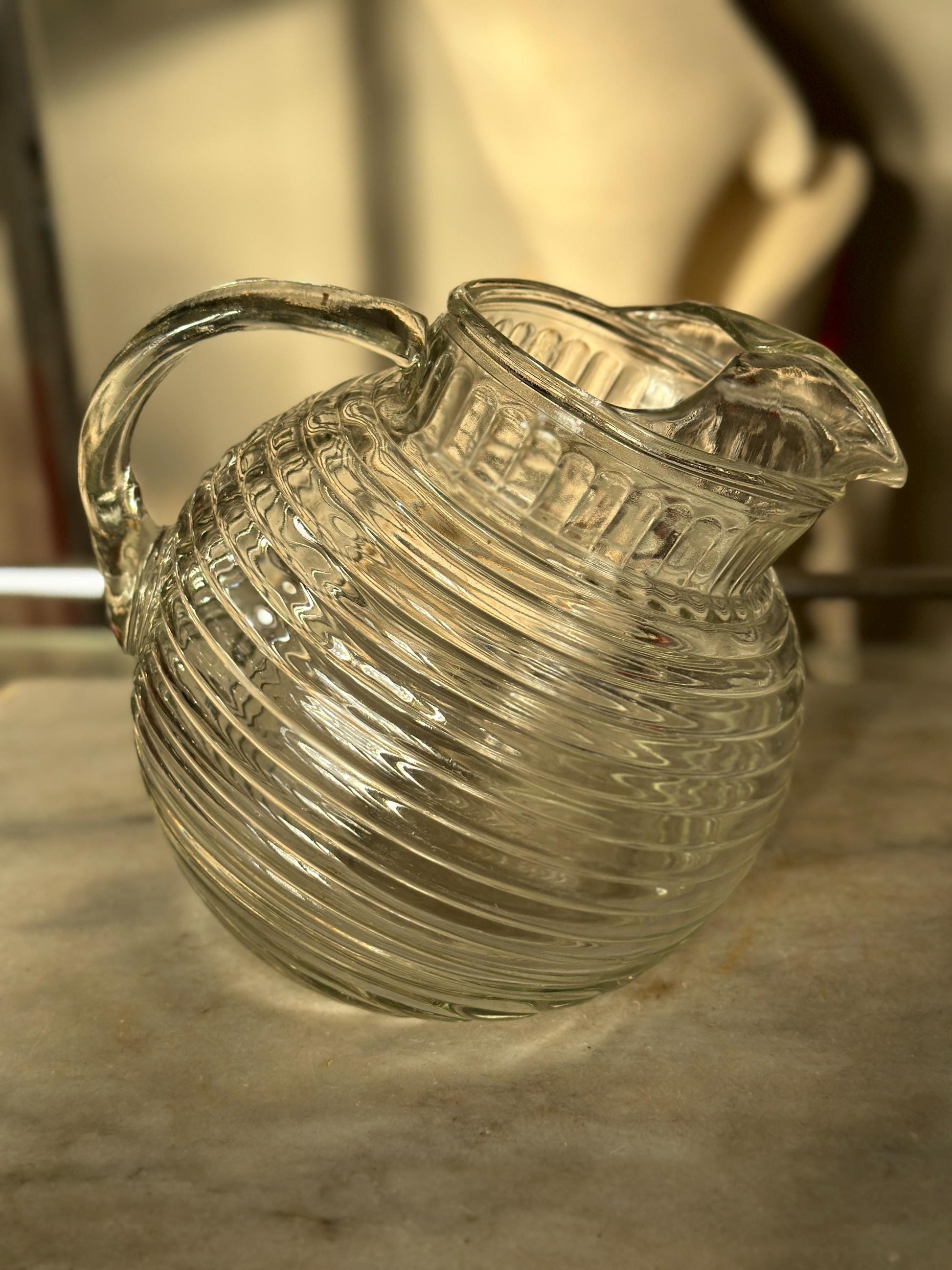 Add a touch of vintage elegance to your collection with this stunning clear ribbed ball pitcher. Crafted in the iconic ribbed ball (“Manhattan Style”), this 58 oz glass pitcher features a unique tilted ball shape and a built-in ice lip for effortless serving. A beautiful example of American glassware design, this piece combines both form and function.Features:An art deco pattern with horizontal ribbed lines