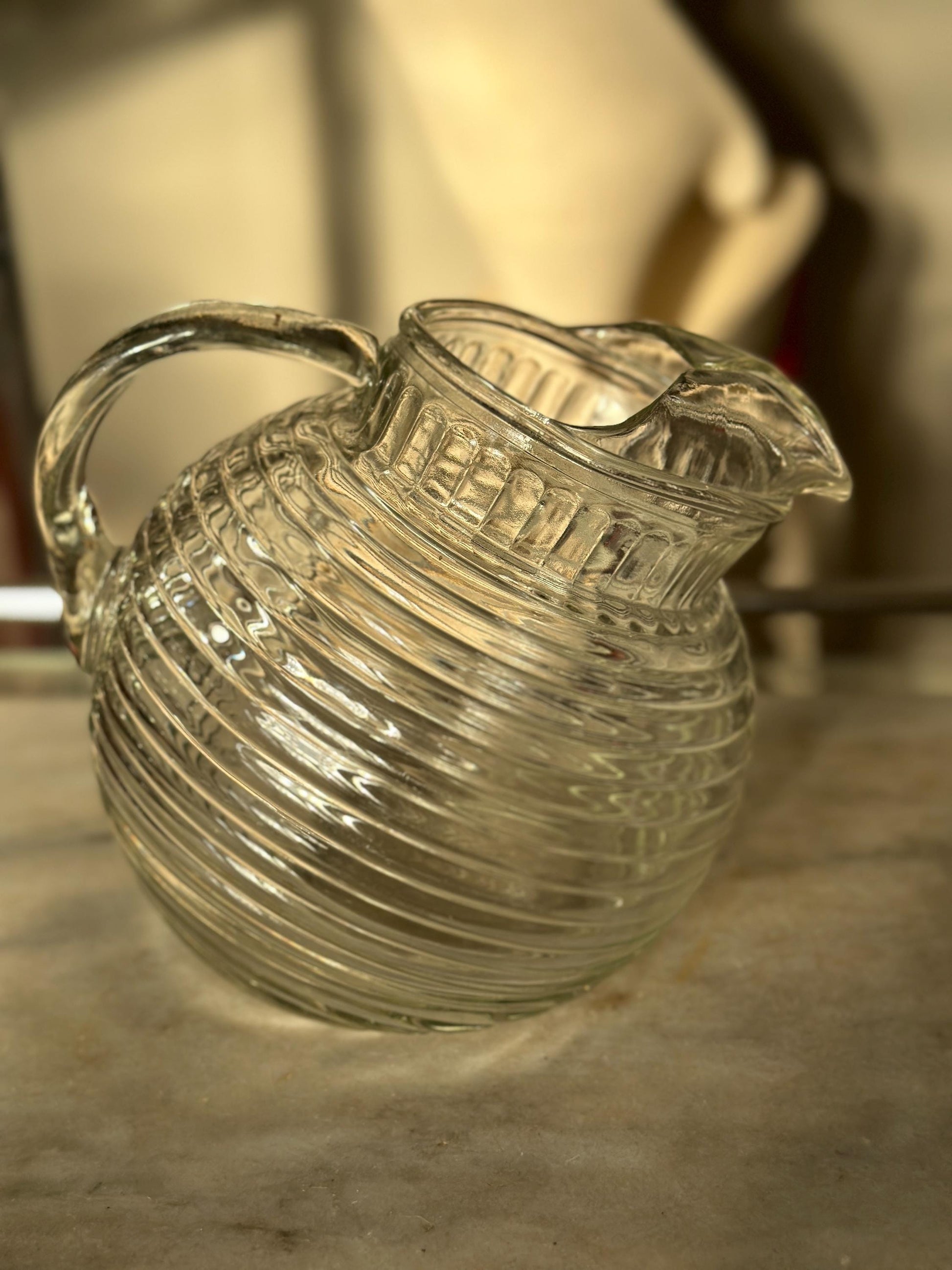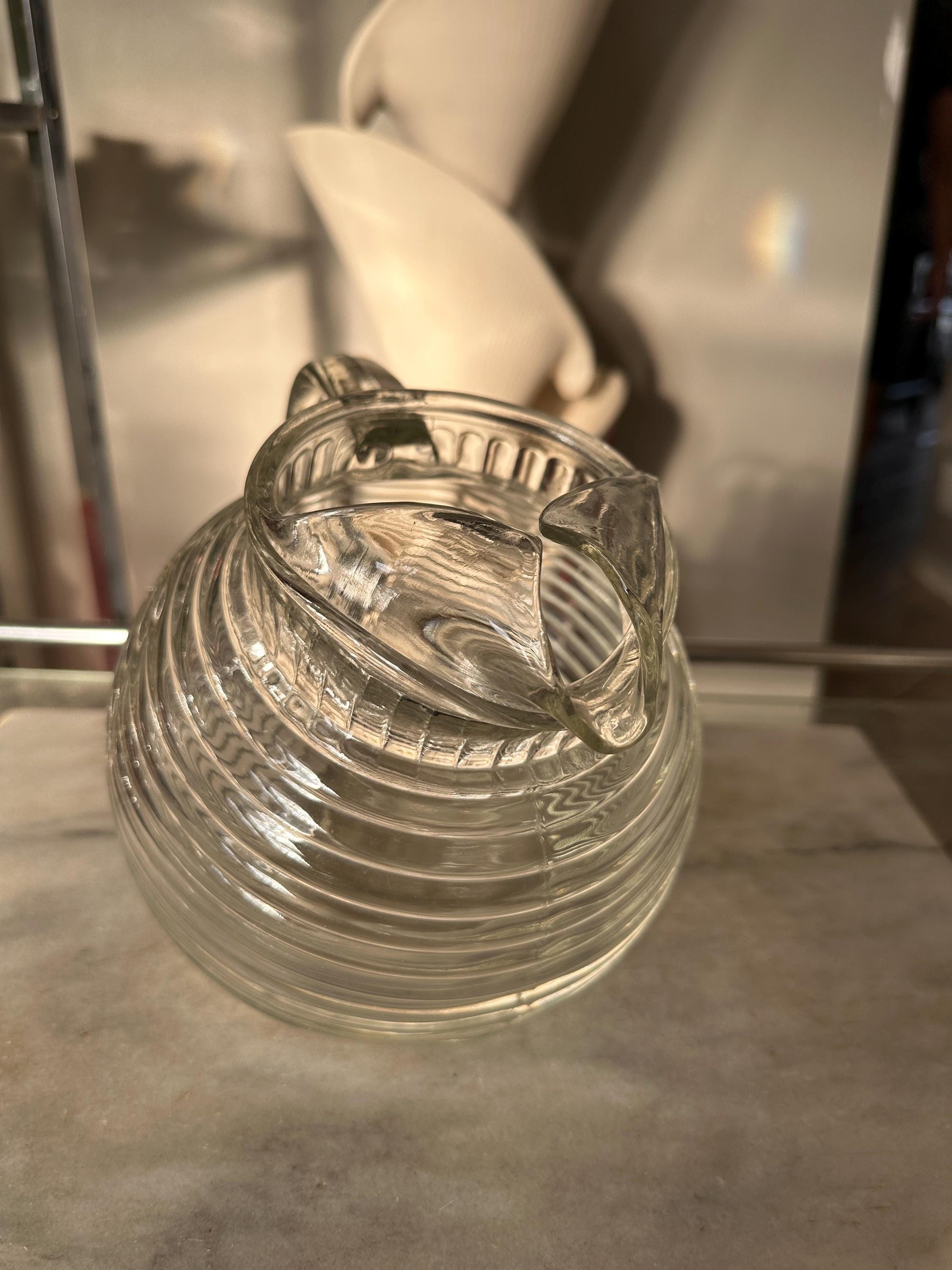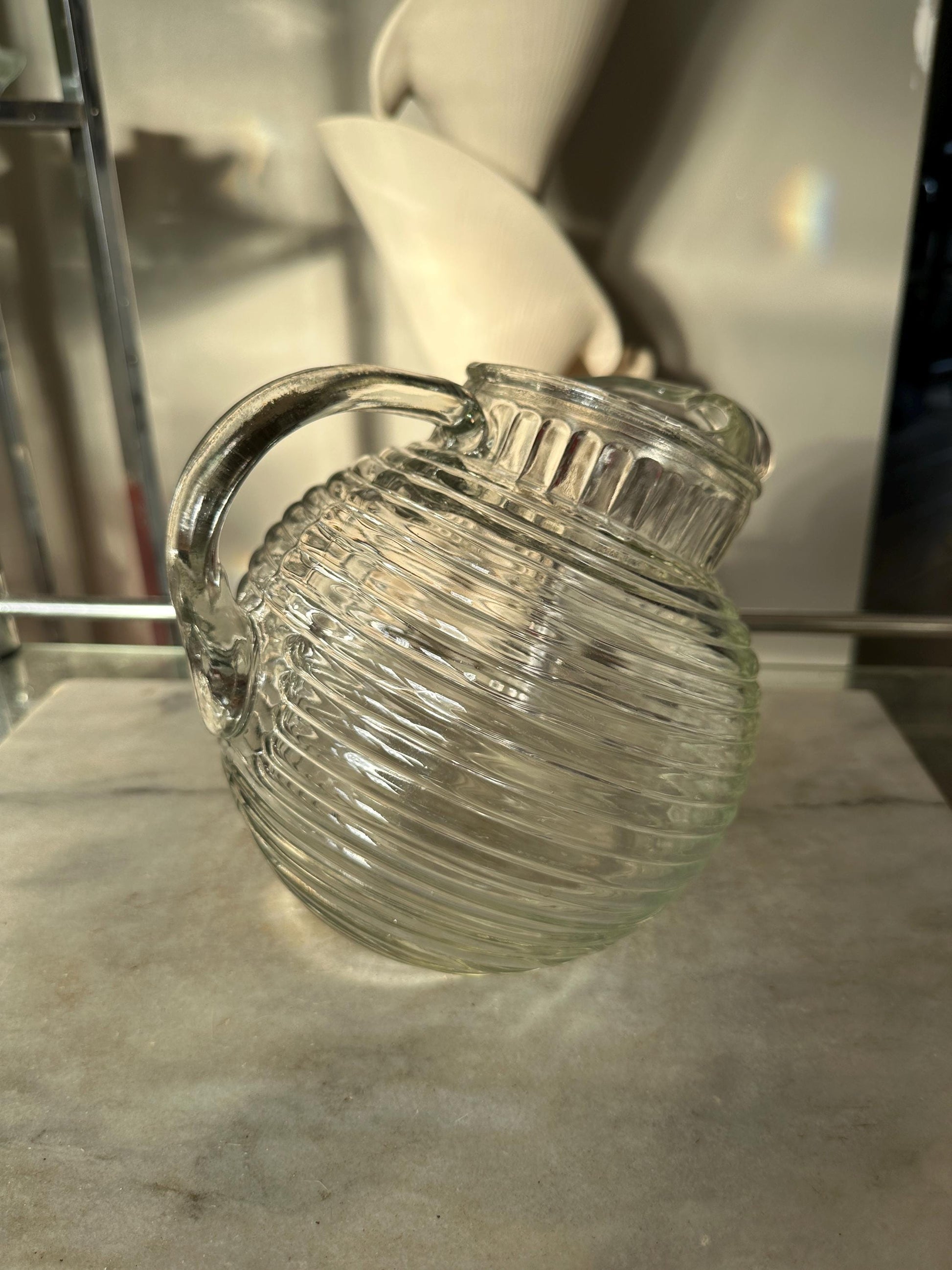 Tilted ball shape for a distinctive silhouette Built-in ice lip to catch ice while pouring Holds approximately 58 ounces Clear, heavy glass with excellent clarityCondition:This pitcher is in very good vintage condition with no chips, cracks, or repairs. Light signs of wear consistent with age and use. Please see photos for details.Dimensions (approx):Height: 7.5 inches Width (with handle): 7 inches Capacity: 56 ozPerfect for: Depression glass collectors Vintage kitchen and bar decor Unique housewarming or hostess gift Functional use for serving drinks or as a display pieceNo maker mark present.This timeless piece is a wonderful addition to any vintage glassware collection. Ships with care and protective packaging.