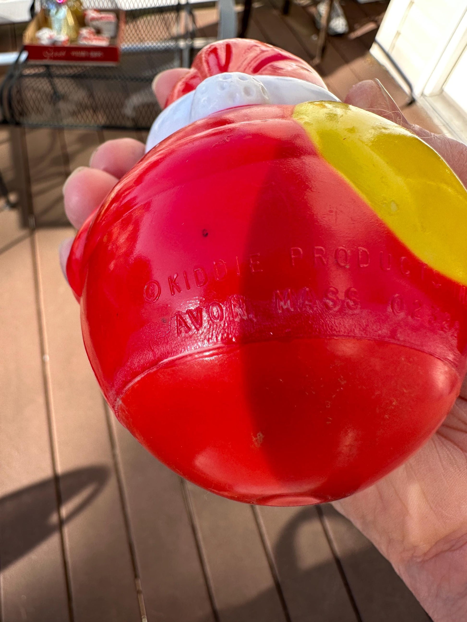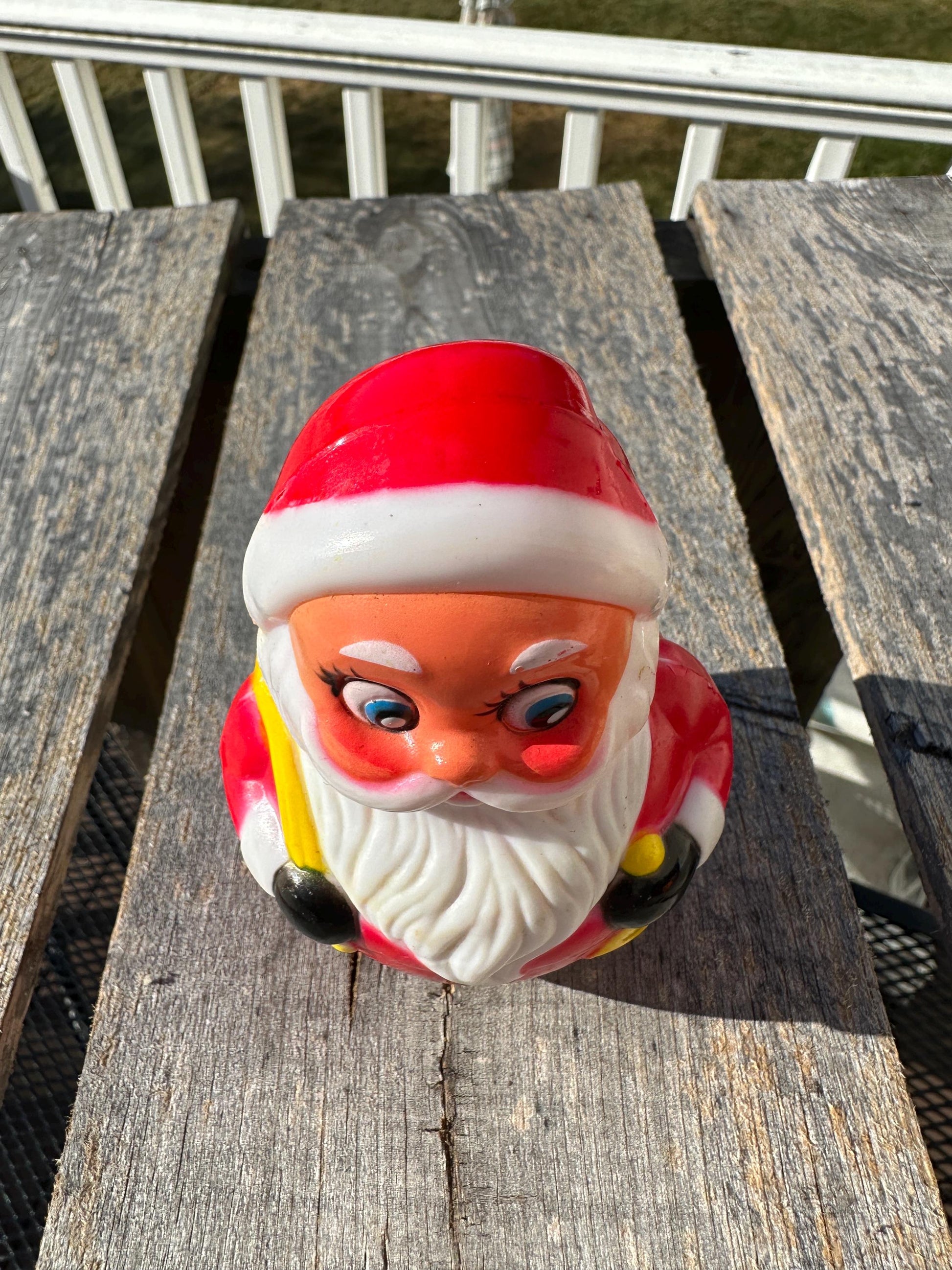 Vintage Kiddie Products roly poly musical Santa Claus figure.Has a few scuffs and some yellowing. Otherwise in very good condition. Please see photos. Colors are vibrant and crisp.4.5” tall.Musical bell no longer chimes when Santa is rolling around.In very good vintage condition.A fun and kitschy Santa that will be a perfect addition to your vintage Christmas decor.