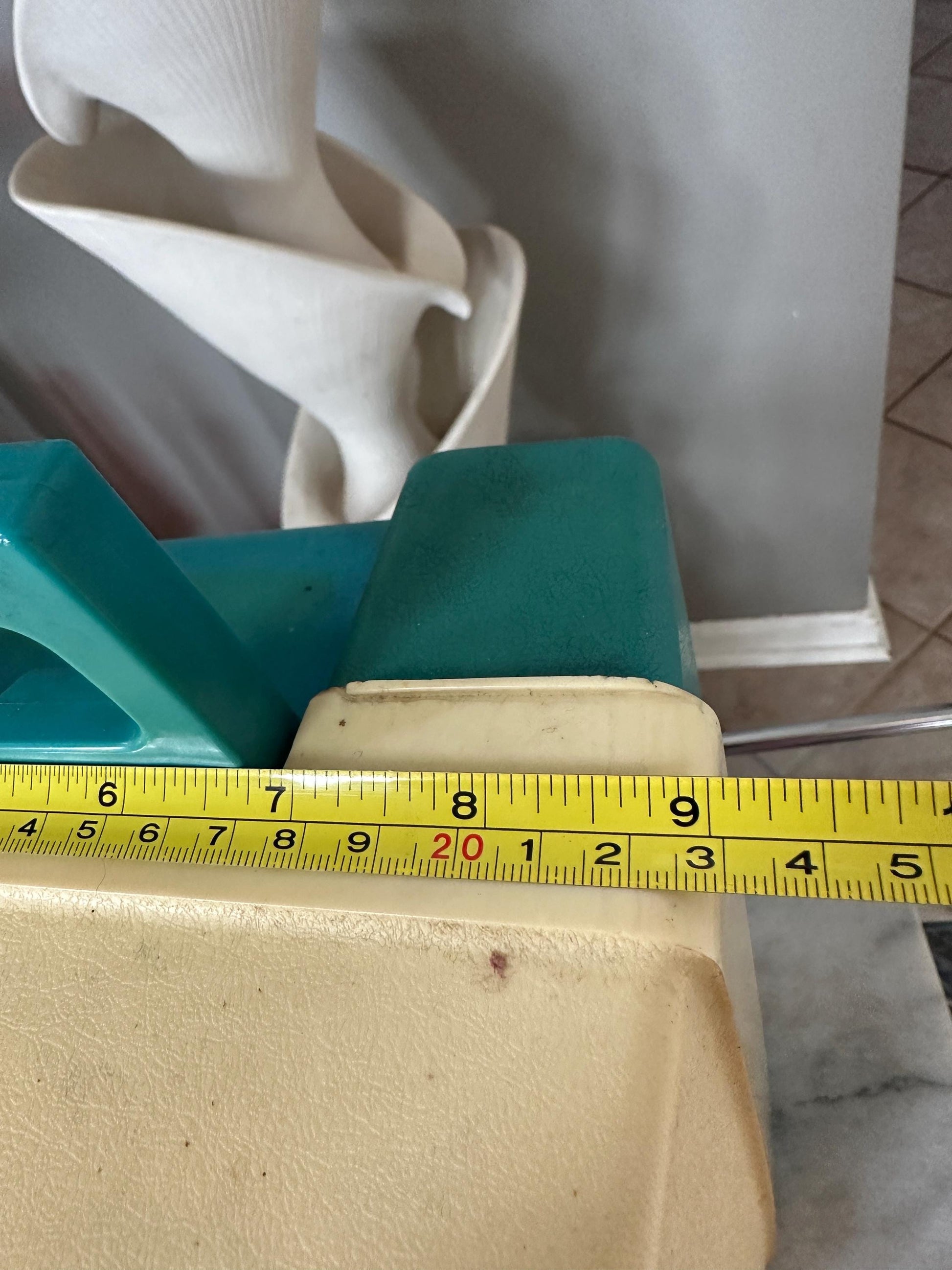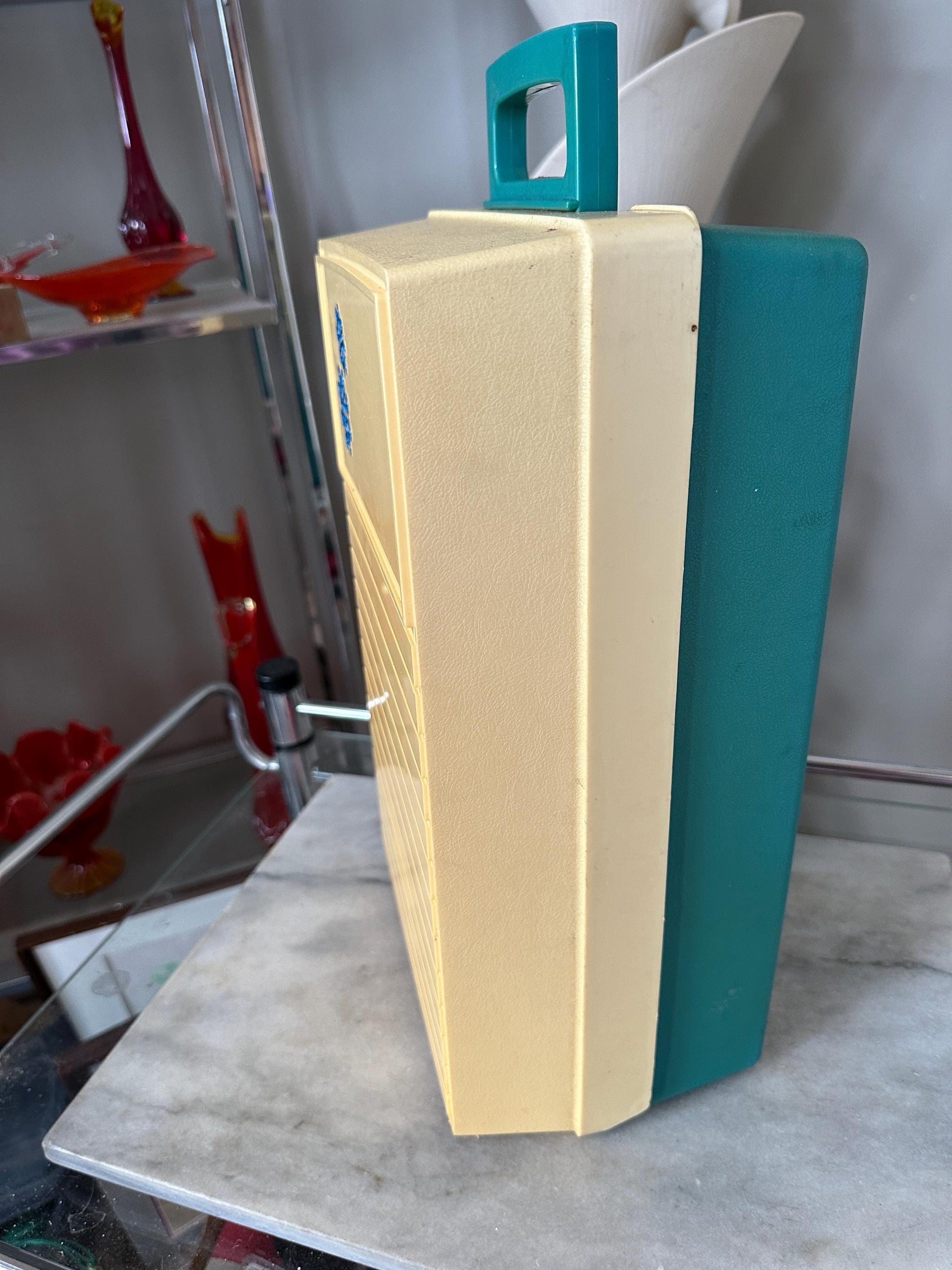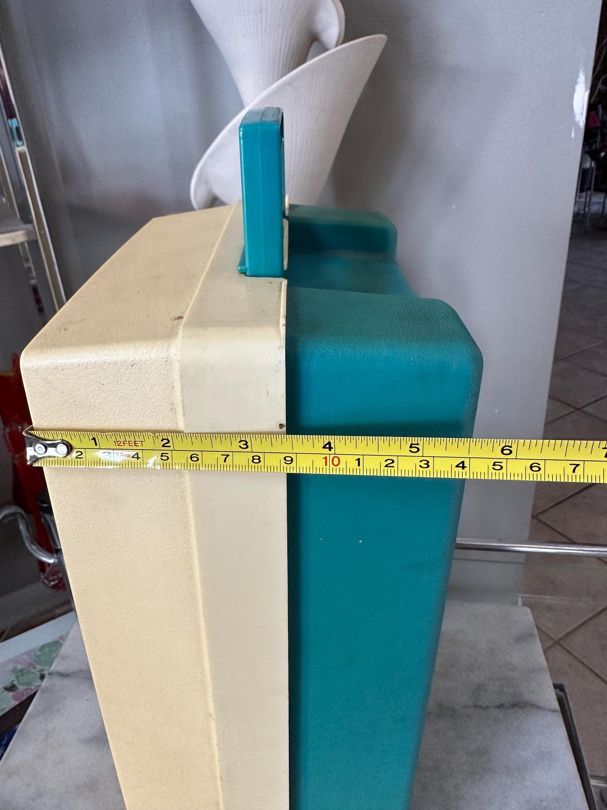 Vintage 1970's RUBBERMAID 12 CANS SIDEKICK COOLER RETRO Blue USA madeRubbermaid Sidekick cooler two tone blue and white. Measures 13.75 x 8.5 x 5.75. Keeps cool 12 cans of your favorite beverage. Made in USA.The cooler has a unique design you push the handle down to unlock the lid. The styrofoam on the inside is still good. The exterior is in ovetall good vintage condition. Some age related yellowing of the plastic on top. Could use a good cleaning.The inside dimensions are around 12" x 7" x 4 1/2".Perfect for your retro decor. Wonderful prop piece.