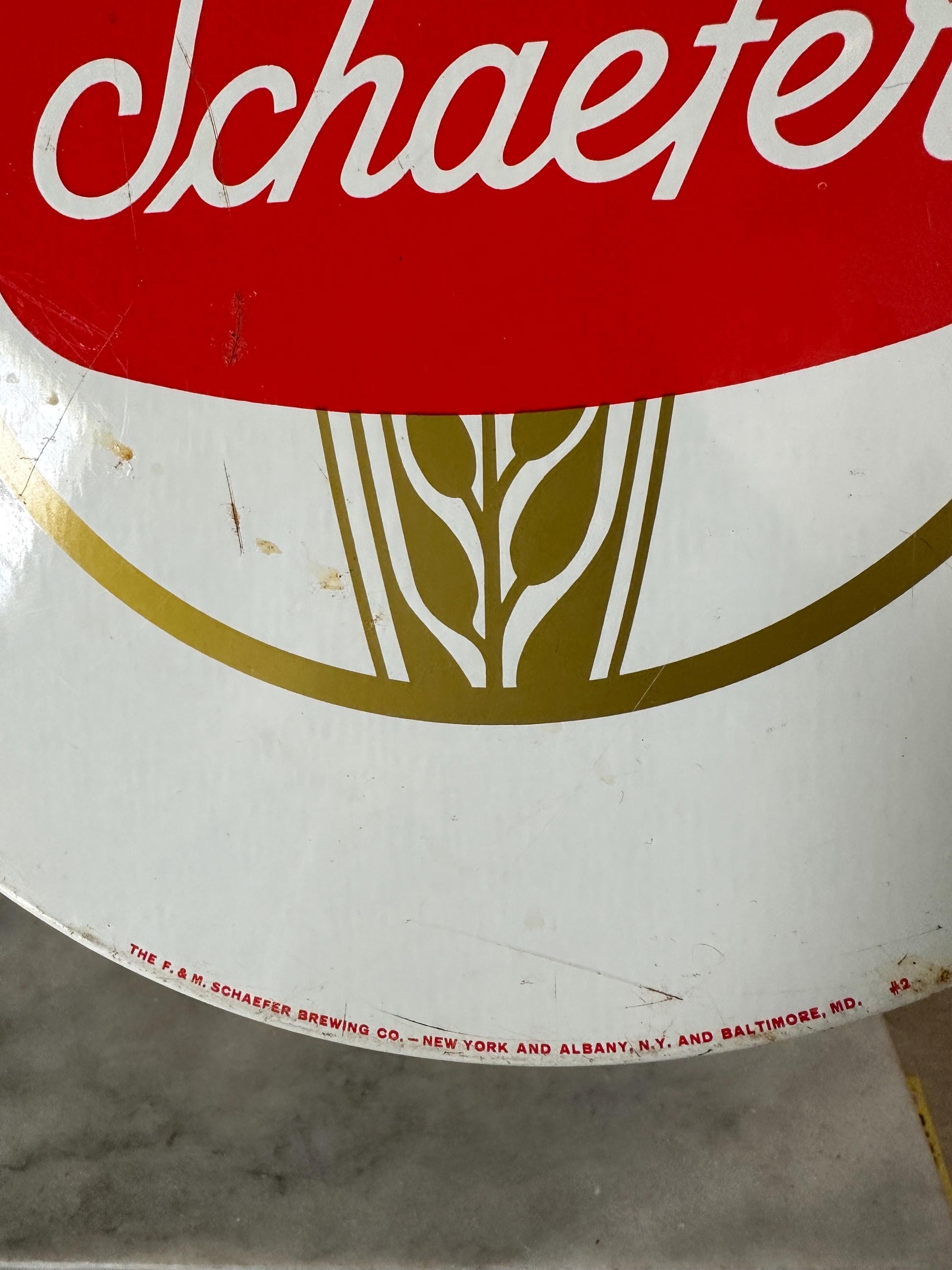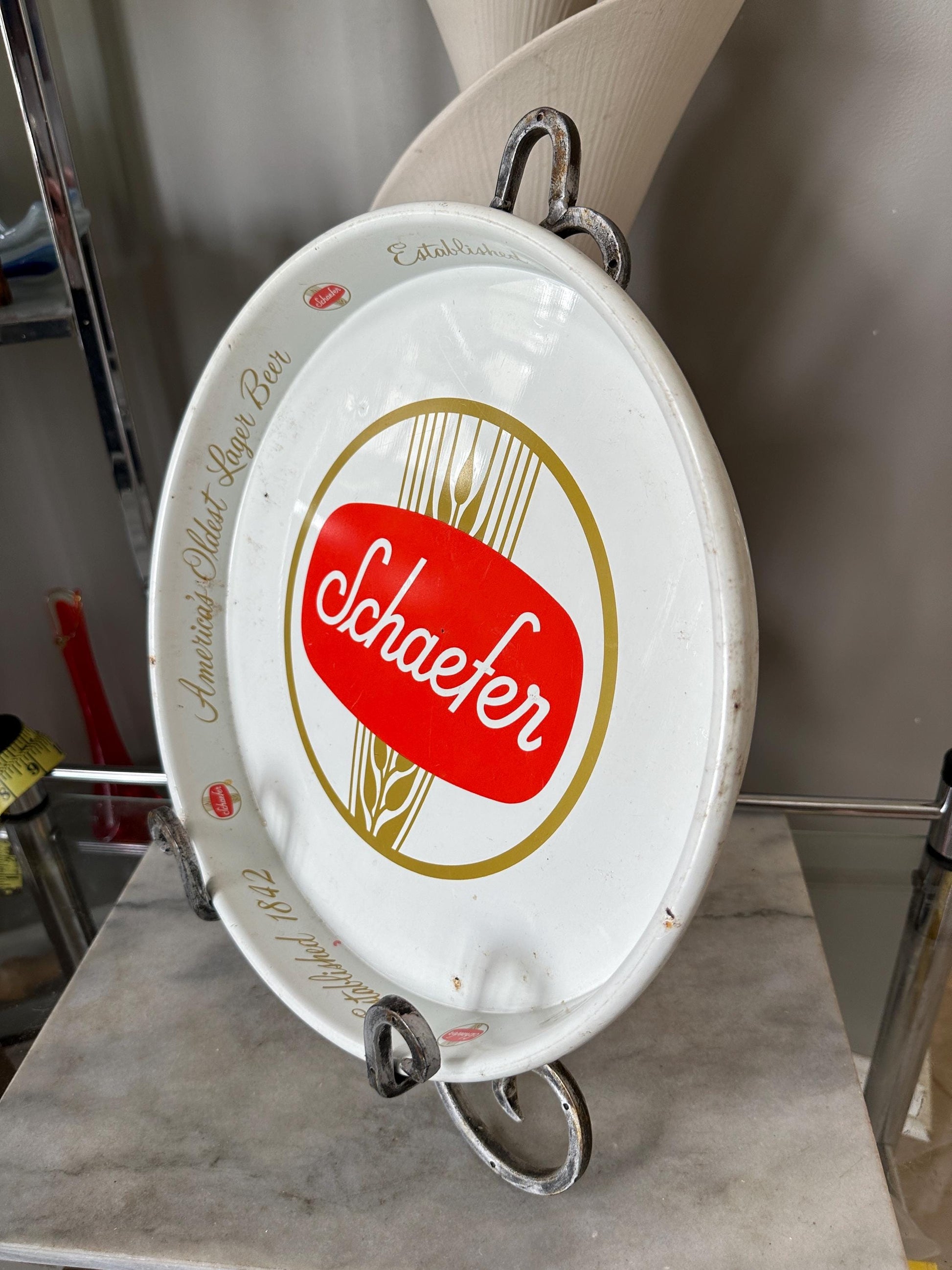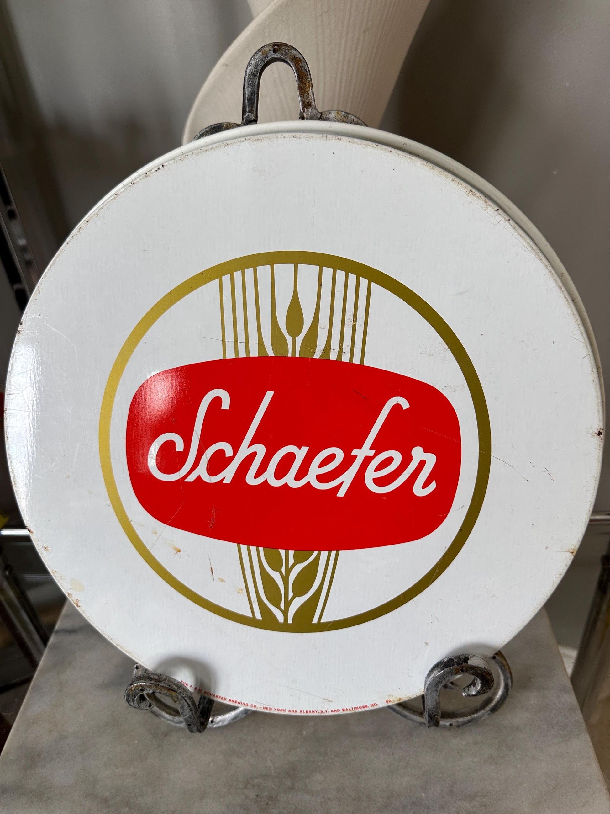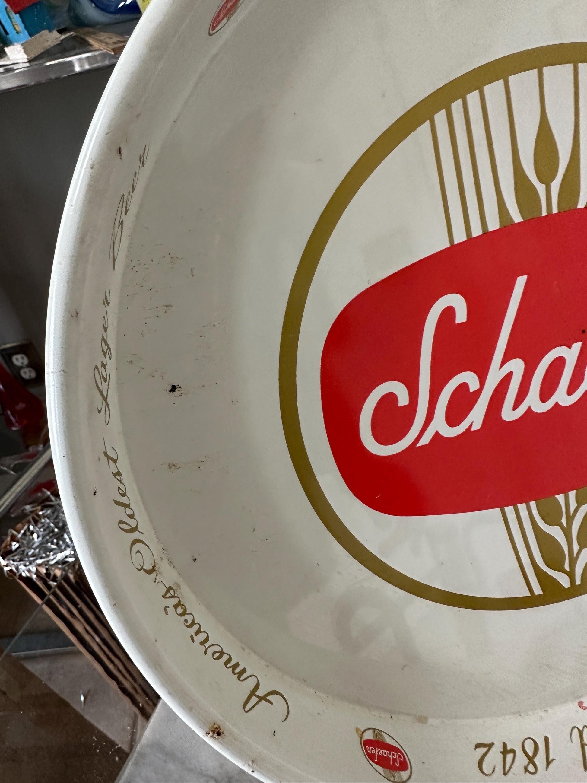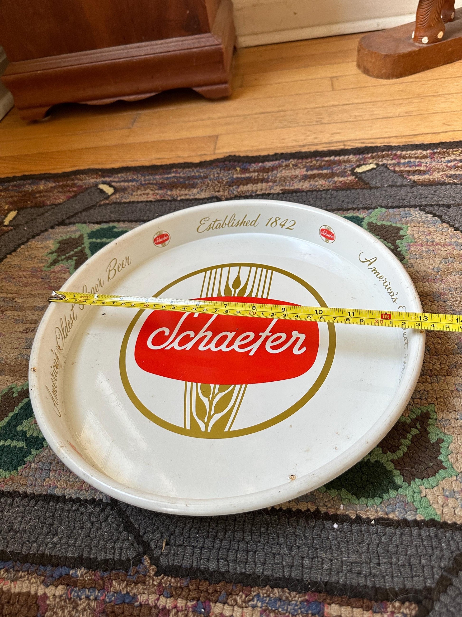 This authentic, Schaefer beer tray was made by and is estimated to be from the 1970s.These trays were originally made for restaurant and bar use. Now you can have one to serve family and friends at home!Measurements - 11 7/8” in diameter x 1 1/4” in height.Condition - Overall, this tray is good vintage condition. There are some minor scratches on the rim, front and back. Also some mi or finish loss and surface rust. Please see pictures.Perfect decor for your bar, man cave or den.