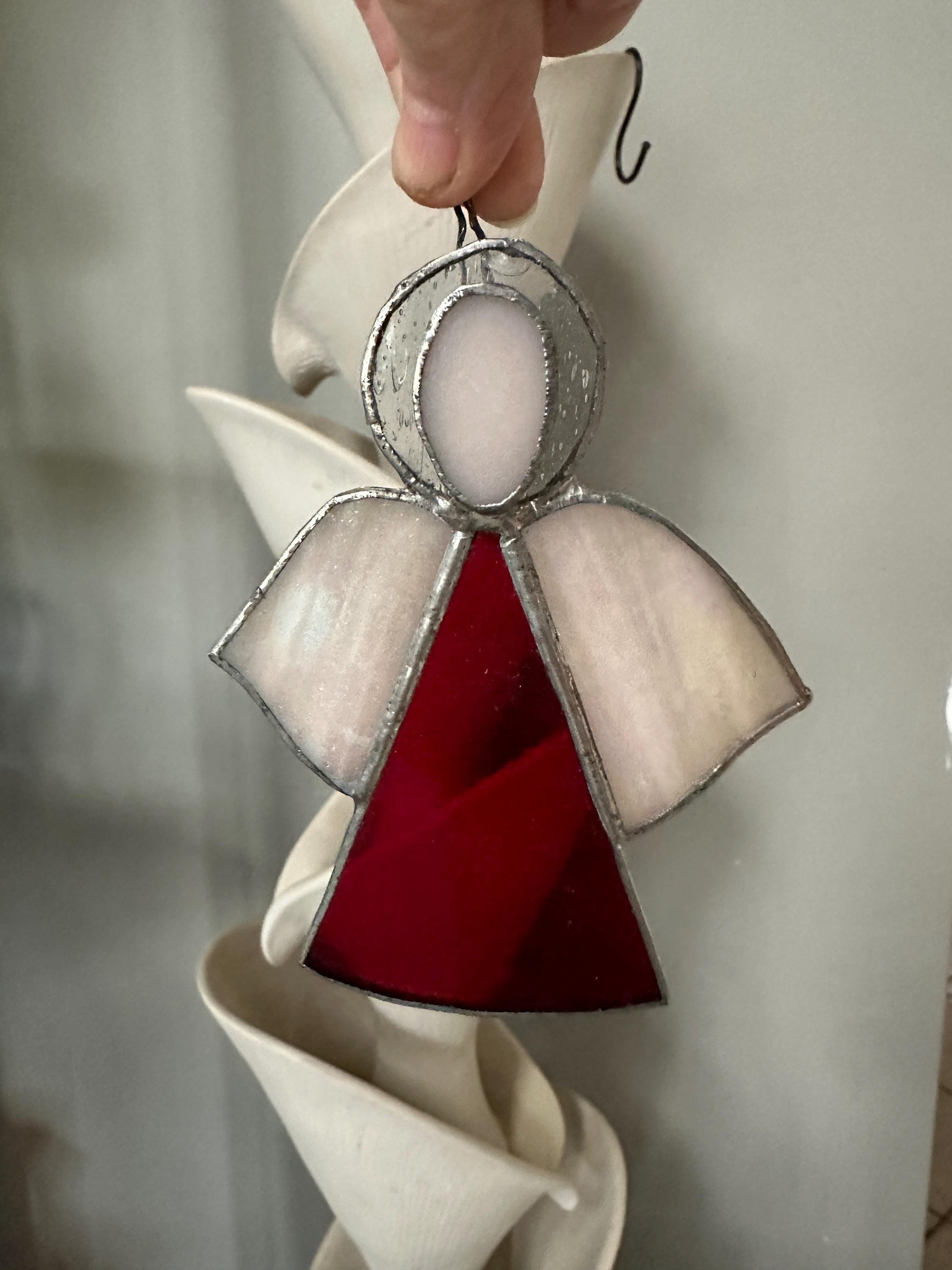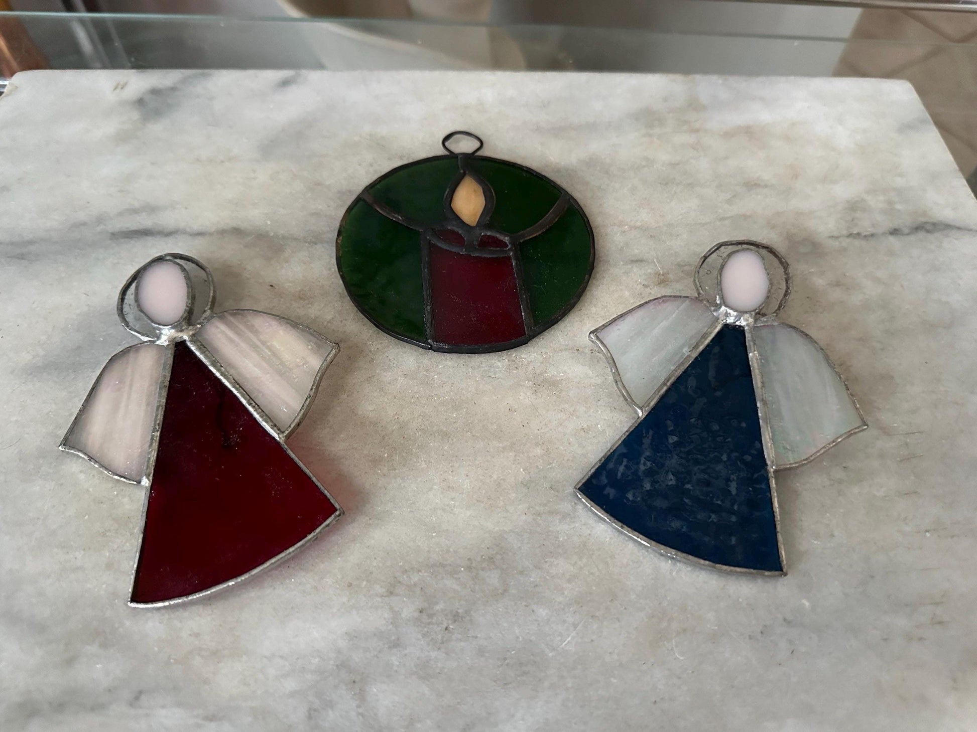 Set includes: 2 stained glass angels 1 stained glass candle Style: Vintage / Traditional Christmas Material: Stained glass with metal soldering Condition: Vintage – gently used with light wear consistent with age (see photos)Please see photos for size approximation.Use: Christmas tree ornaments, window décor, or holiday display accents Why You’ll Love Them Beautiful light-catching stained glass Classic vintage Christmas design Perfect for traditional, cottage, or heirloom-style décorMakes a thoughtful holiday gift or collector’s piece Condition NotesThese are authentic vintage ornaments and may show minor imperfections such as slight solder patina or small variations in the glass, which add to their character and charm.