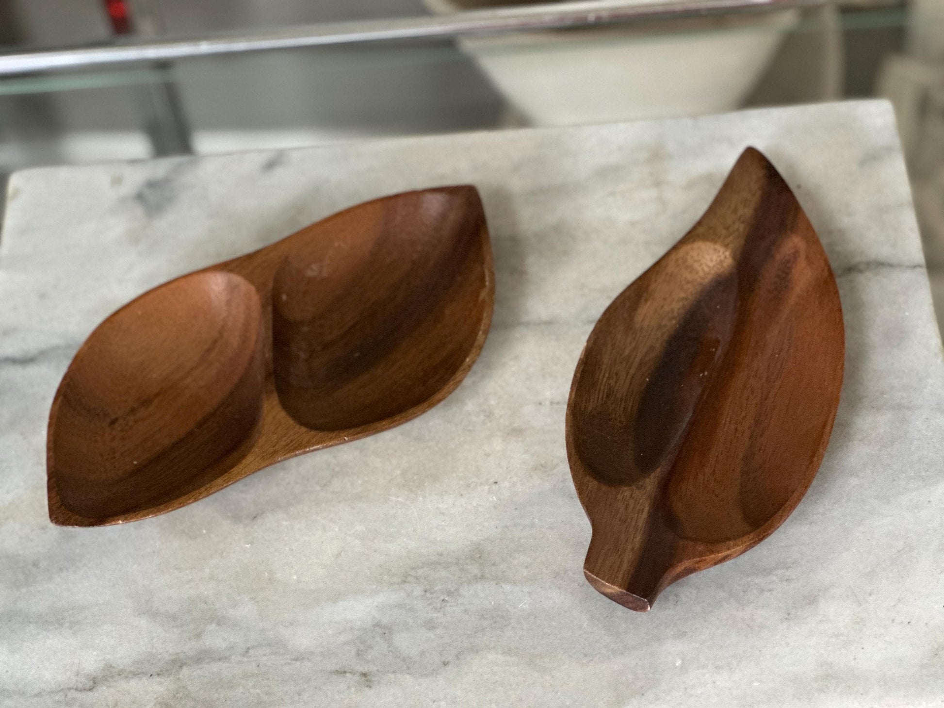 Elevate your home decor and serveware collection with this stunning pair of vintage mid-century modern (MCM) teak bowls. Expertly crafted in a beautiful leaf shape, these bowls showcase classic Scandinavian design with smooth curves, rich wood grain, and timeless style.Perfect for entertaining or display, these bowls are ideal for serving nuts, snacks, or small bites, and they double beautifully as decor pieces on a coffee table, bar cart, or shelf.Features:Set of 2 bowls
