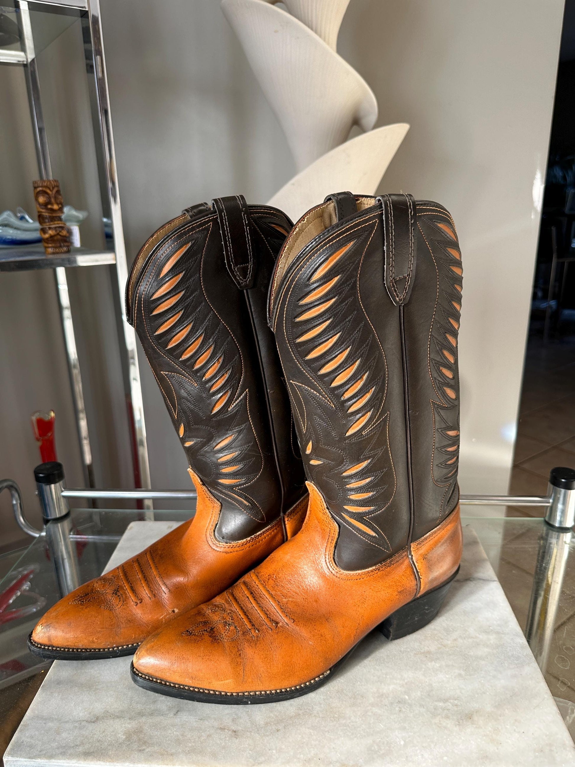 Vintage USA Made Man Made Material Style 71583 Cowboy Boots - Size 11These boots are in very good condition but do show some use and wear. These were found at an estate sale from Lancaster, PA. Some staining and marks on the boots - inside and out. The inside soles also show some wear.These are nice looking older vintage boots that have some different colors built into the upper parts of the boot and also have a gold trim around the top edge.Brand is nowhere to be found. There may have been a brand inside at some point but it has worn off.Measures 14.5” tall. Opening at the top measures 6.25” (front to back.Heel measures 1.5” tallSole measures 13” (tip of toe to back) and 4” at it’s widest point.