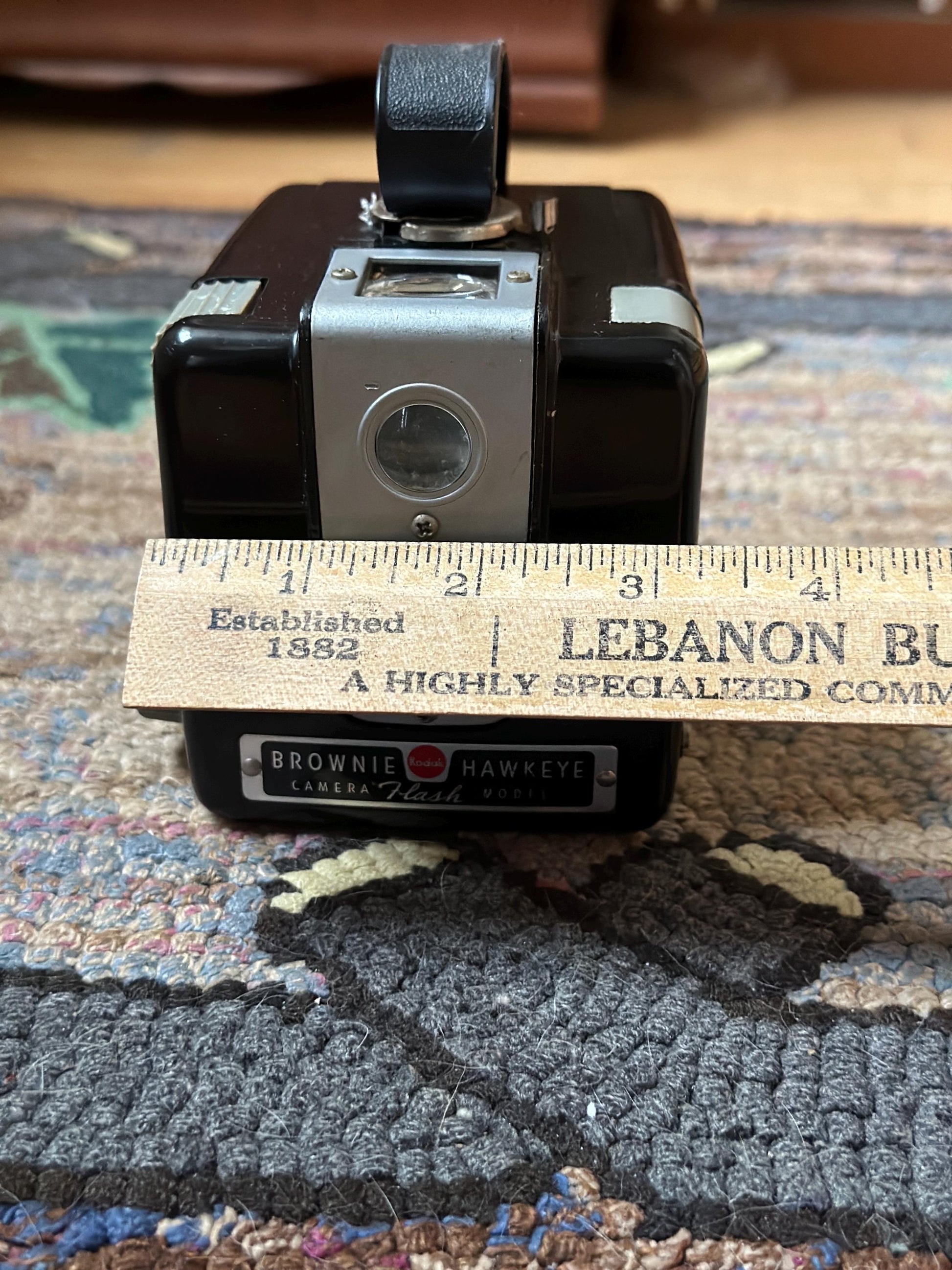 Vintage Brownie Hawkeye camera made by Kodak in the 1950s. This version is the Flash model made from Bakelite and a plastic turn-handle. It's in lovely shape and would be a fun and easy way to experiment with roll film (Brownies take 620 format film and produce 6x6cm images). Measures 3.5"x3.5"x4." This camera was part of a camera collection, that was acquired at an estate auction in Lebanon County, PA.These vintage cameras are sold as untested. We examine all the dials, buttons, levers, film compartment, viewfinder, lenses, and lens mount for broken or missing parts. However we do not test the camera with film so we cannot determine issues such as light sensitivity.A wonderful addition to a camera collection.Perfect addition to your mid-century modern decor.