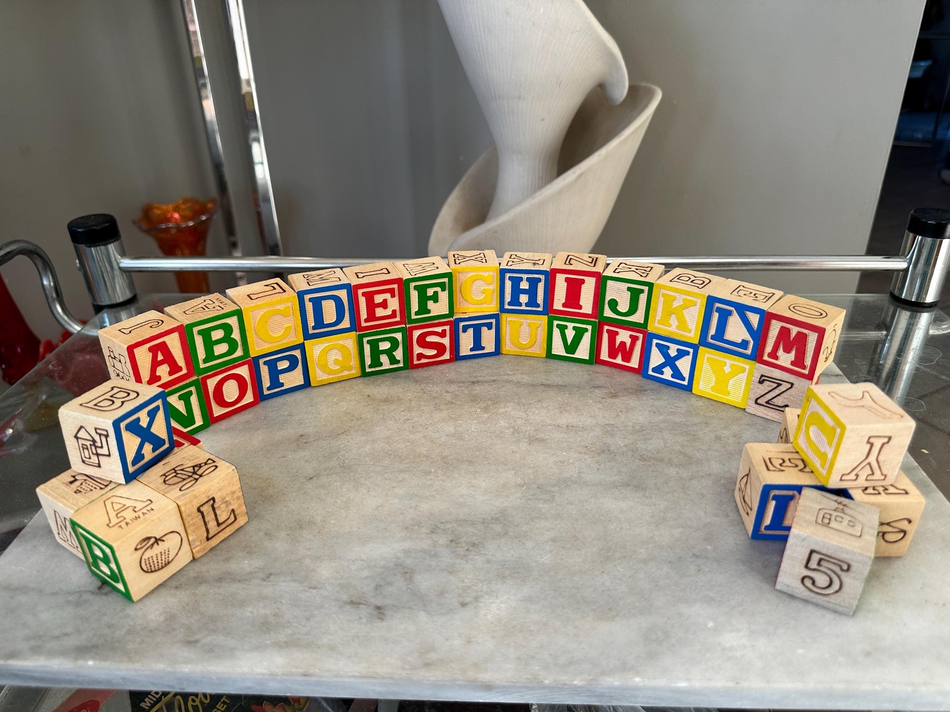 Offered is a set of 34 wooden building blocks. They can be used for spelling out short words, stacking, or decorating. The blocks are in like new condition and appear to have never been used.. Each block measures 1.” Review photos closely as they are part of my description. Perfect to display as is it to repurpose into something uniqiue.These will be sent with a vintage space themed cardboard school box. Box dos show some signs of wear along the back edge. Please, zoom in and view photos closely as they are part of my description. Due to the nature and age of vintage and antique items, I do not accept exchanges or returns but, let me know if you have any questions before purchasing.