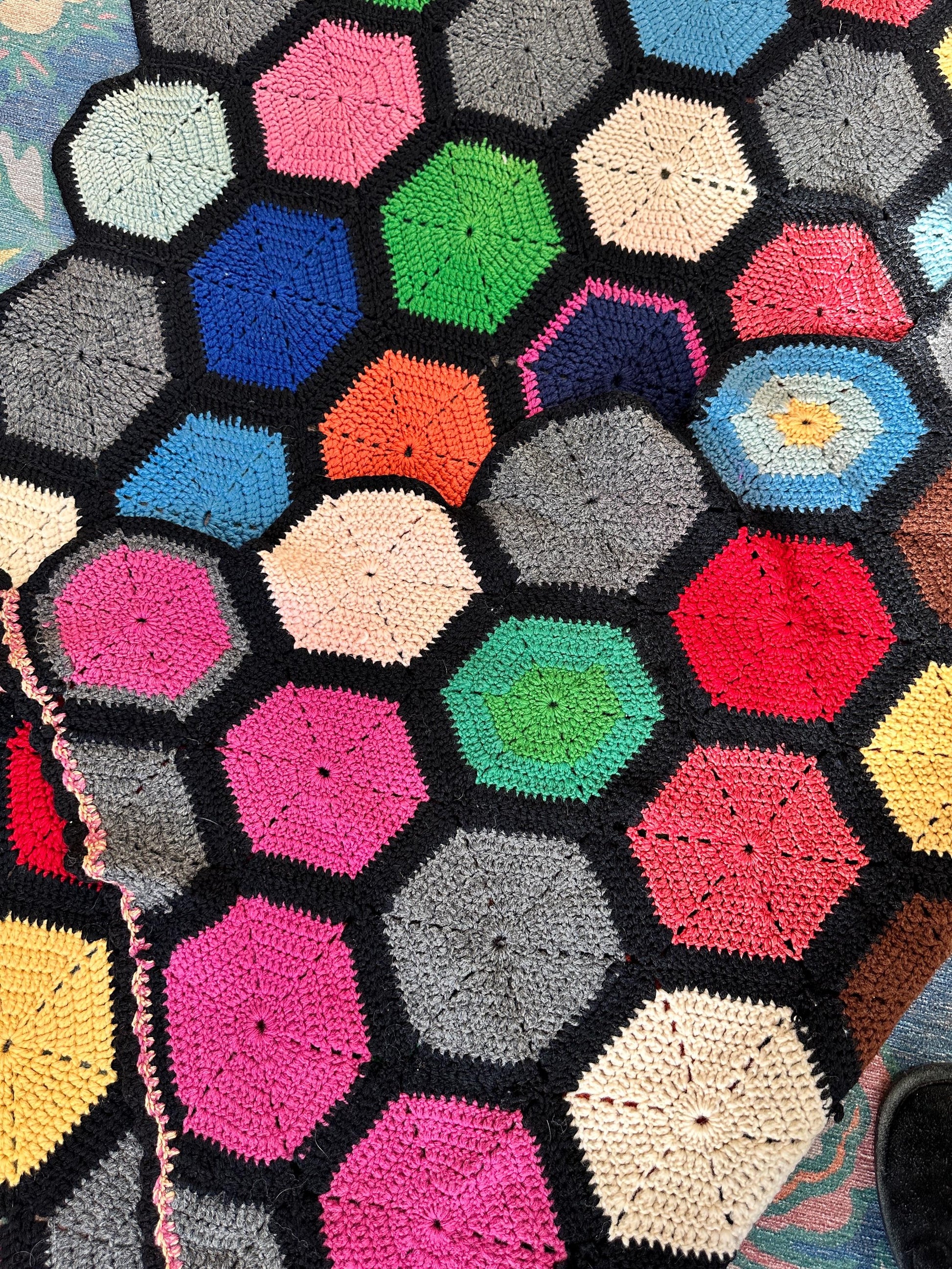This stunning vintage handmade crochet afghan features a bold geometric hexagon pattern in a rich mix of vibrant and earthy colors, all beautifully framed by a black background. A true labor of love, this one-of-a-kind piece showcases classic craftsmanship and timeless boho charm.Perfect as a statement throw for a sofa or bed, a cozy layer for cool evenings, or a colorful accent for a mid-century, eclectic, or bohemian interior. Each hexagon is individually crocheted and joined, highlighting the care and artistry that went into creating this unique textile.Details: