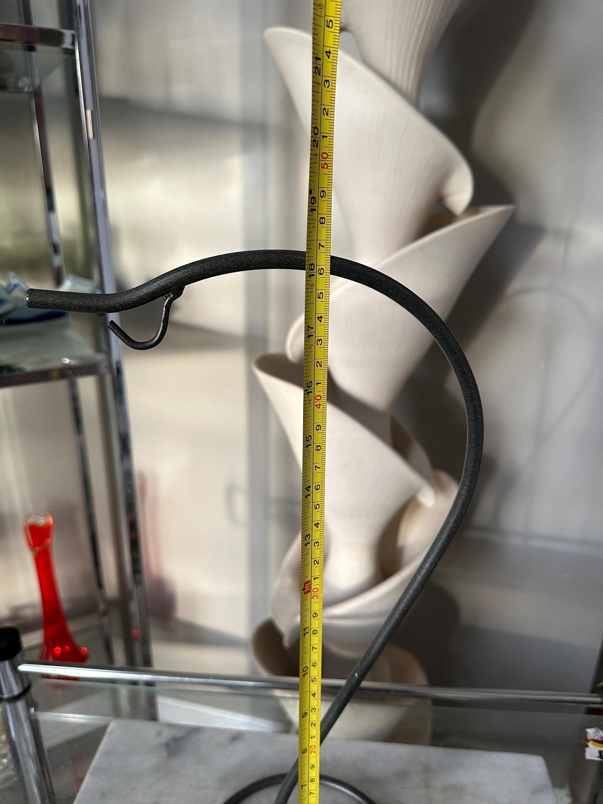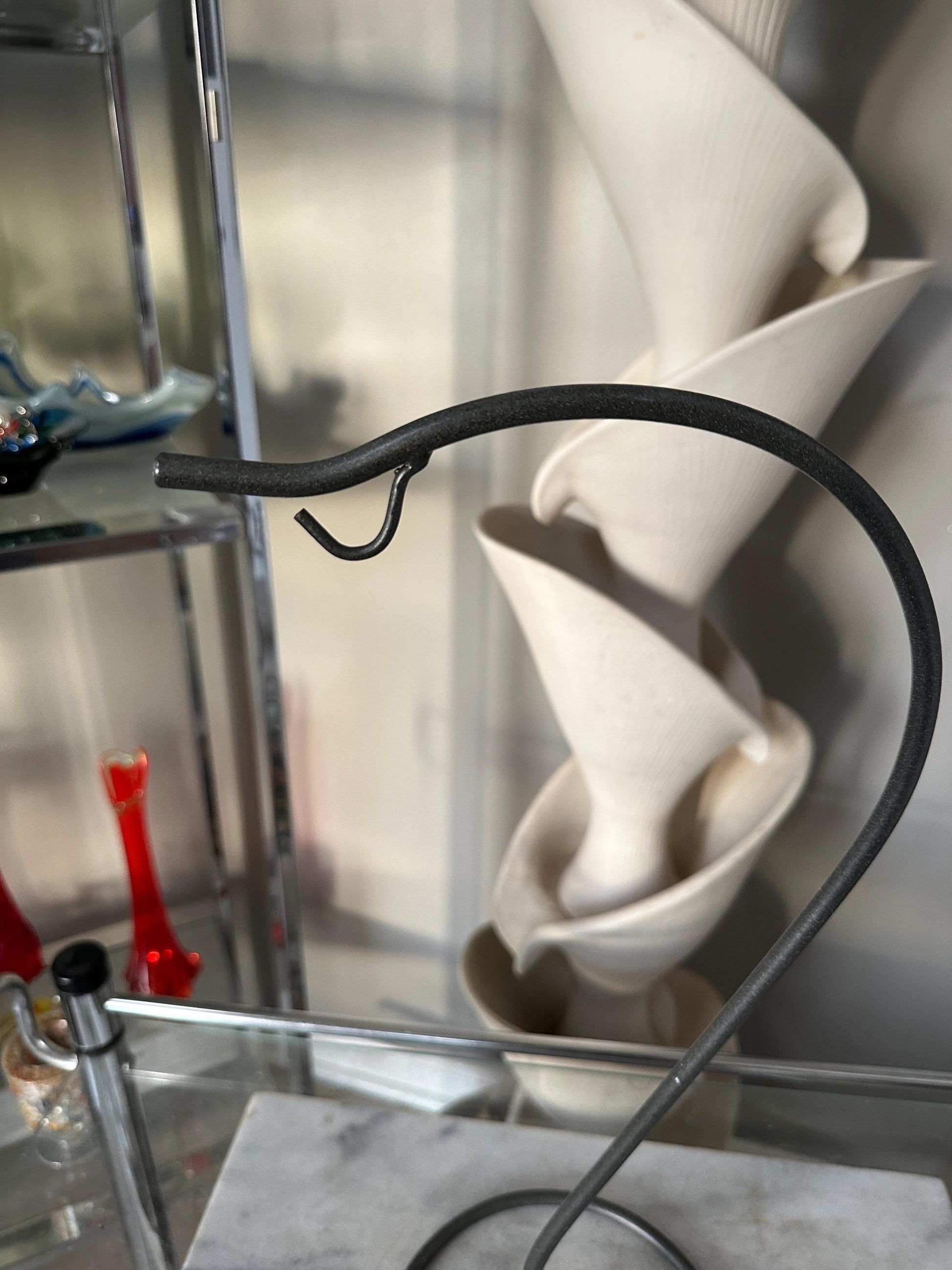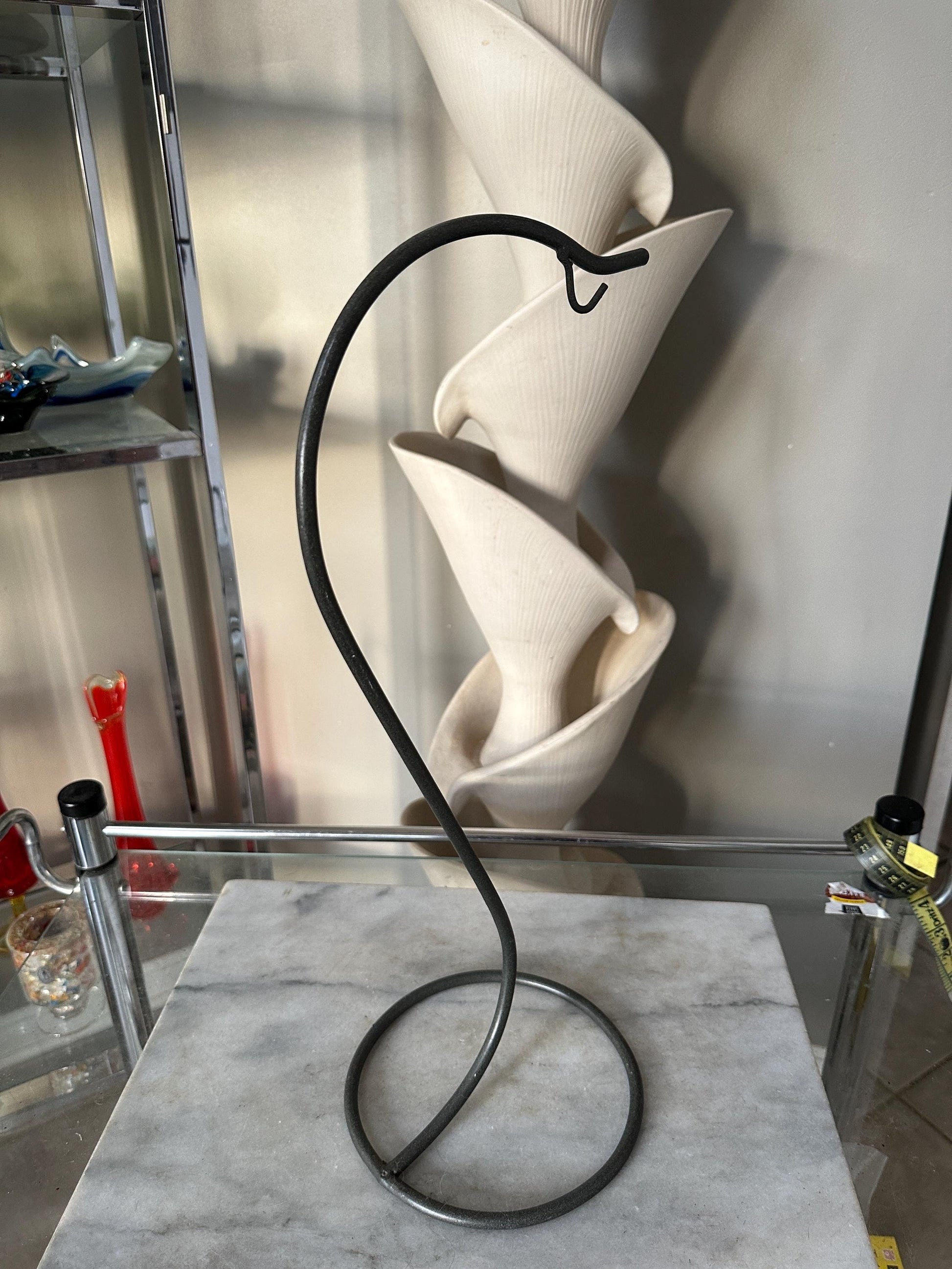 A Unique Wrought Iro. Hanger for Glass Plant Orbs/Terrariums 18 x 7Sleek and stylish design in a wrought iron that is a gunpowder grey in color.In very good vintage condition.Perfect to display art glass or a treasured ornament.